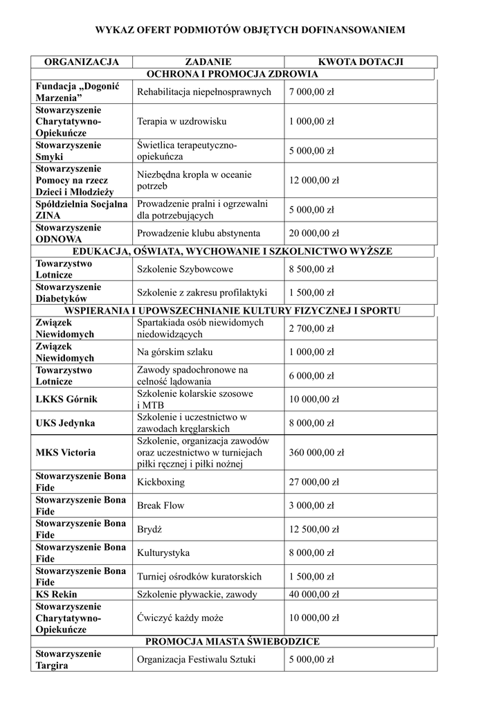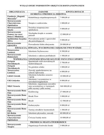 WYKAZ OFERT PODMIOTÓW OBJĘTYCH DOFINANSOWANIEM ORGANIZACJA ZADANIE KWOTA DOTACJI OCHRONA I PROMOCJA ZDROWIA Fundacja „Dogonić Rehabilitacja niepełnosprawnych 7 000,00 zł Marzenia” Stowarzyszenie Terapia w uzdrowisku 1 000,00 zł CharytatywnoOpiekuńcze Świetlica terapeutycznoStowarzyszenie 5 000,00 zł opiekuńcza Smyki Stowarzyszenie Niezbędna kropla w oceanie 12 000,00 zł Pomocy na rzecz potrzeb Dzieci i Młodzieży Spółdzielnia Socjalna Prowadzenie pralni i ogrzewalni 5 000,00 zł dla potrzebujących ZINA Stowarzyszenie Prowadzenie klubu abstynenta 20 000,00 zł ODNOWA EDUKACJA, OŚWIATA, WYCHOWANIE I SZKOLNICTWO WYŻSZE Towarzystwo Szkolenie Szybowcowe 8 500,00 zł Lotnicze Stowarzyszenie Szkolenie z zakresu profilaktyki 1 500,00 zł Diabetyków WSPIERANIA I UPOWSZECHNIANIE KULTURY FIZYCZNEJ I SPORTU Spartakiada osób niewidomych Związek 2 700,00 zł niedowidzących Niewidomych Związek Na górskim szlaku 1 000,00 zł Niewidomych Zawody spadochronowe na Towarzystwo 6 000,00 zł celność lądowania Lotnicze Szkolenie kolarskie szosowe 10 000,00 zł LKKS Górnik i MTB Szkolenie i uczestnictwo w 8 000,00 zł UKS Jedynka zawodach kręglarskich Szkolenie, organizacja zawodów oraz uczestnictwo w turniejach 360 000,00 zł MKS Victoria piłki ręcznej i piłki nożnej Stowarzyszenie Bona Kickboxing 27 000,00 zł Fide Stowarzyszenie Bona Break Flow 3 000,00 zł Fide Stowarzyszenie Bona Brydż 12 500,00 zł Fide Stowarzyszenie Bona Kulturystyka 8 000,00 zł Fide Stowarzyszenie Bona Turniej ośrodków kuratorskich 1 500,00 zł Fide Szkolenie pływackie, zawody 40 000,00 zł KS Rekin Stowarzyszenie Ćwiczyć każdy może 10 000,00 zł CharytatywnoOpiekuńcze PROMOCJA MIASTA ŚWIEBODZICE Stowarzyszenie Organizacja Festiwalu Sztuki 5 000,00 zł Targira Towarzystwo Wystawa Zegarów Gustava 12 000,00 zł Miłośników Beckera Świebodzic Spektakl teatralny 3 000,00 zł Fundacja REM KULTURA, SZTUKA, OCHRONA DZIEDZICTWA NARODOWEGO Stowarzyszenie Podróże muzyczno-kulturalne 7 300,00 zł CharytatywnoOpiekuńcze Stowarzyszenie Tradycje polskich świąt 7 000,00 zł Smyki Stowarzyszenie Konkurs matematyczny 700,00 zł Wypożyczalnia Centrum Stowarzyszenie Spotkanie poetyckie 1 000,00 zł Wypożyczalnia Centrum Stowarzyszenie Wyjazd do operetki 2 000,00 zł Diabetyków Artystyczne impresje seniorów Polski Związek 26 000,00 zł „Mogą wszystko” Emerytów Orszak Trzech Króli 10 000,00 zł Fundacja REM POMOC SPOŁECZNA Prowadzenie jadłodajni w roku Spółdzielnia Socjalna 2015 dla osób ubogich i 100 000,00 zł ZINA potrzebujących
