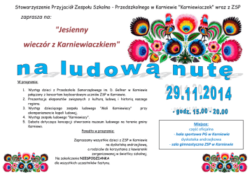 Stowarzyszenie Przyjaciół Zespołu Szkolno - Przedszkolnego w Karniewie "Karniewiaczek" wraz z ZSP zaprasza na: "Jesienny wieczór z Karniewiaczkiem" W programie: 1. Występ dzieci z Przedszkola Samorządowego im. D. Gellner w Karniewie połączony z koncertem keyboardowym uczniów ZSP w Karniewie. 2. Prezentacja eksponatów związanych z kulturą ludową i historią naszego regionu. 3. Występ dziecięcego zespołu ludowego "Mali Karniewiacy" przy akompaniamencie kapeli ludowej. 4. Występ zespołu ludowego "Karniewiacy". 5. Debata dotycząca koncepcji stworzenia muzeum ludowego na terenie gminy Karniewo. Ponadto w programie: Zapraszamy wszystkie dzieci z ZSP w Karniewie na dyskotekę andrzejkową, a rodziców do korzystania z kawiarenki zorganizowanej w świetlicy szkolnej. Na zakończenie NIESPODZIANKA dla wszystkich uczestników festynu. Miejsce: część oficjalna - hala sportowa PG w Karniewie dyskoteka andrzejkowa - sala gimnastyczna ZSP w Karniewie