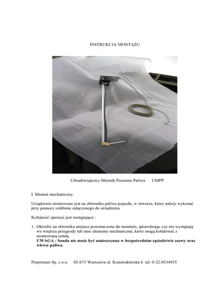 INSTRUKCJA MONTAŻU Ultradźwiękowy Miernik Poziomu Paliwa UMPP I. Montaż mechaniczny. Urządzenie montowane jest na zbiorniku paliwa pojazdu, w otworze, który należy wykonać przy pomocy szablonu załączonego do urzadzenia Kolejność operacji jest następująca : 1. Określić na zbiorniku miejsce przeznaczone do montażu, sprawdzając czy nie występują we wnętrzu przegrody lub inne elementy mechaniczne, które mogą kolidować z montowaną sondą. UWAGA : Sonda nie może być umieszczona w bezpośrednim sąsiedztwie ssawy oraz wlewu paliwa. Perpetuum Sp. z o.o. 02-673 Warszawa ul. Konstruktorska 6 tel. 0-22-8534935 2. Oczyścić wybrane miejsce montażowe przy pomocy benzyny ekstrakcyjnej lub innego rozpuszczalnika organicznego (nie używać oleju napędowego) i odczekać aż, rozpuszczalnik odparuje ( ok. 3 minut). 3. Nakleić szablon zgodnie z osią podłużną zbiornika. Szablon naklejony na zbiornik W celu uniknięcia zanieczyszczenia wnętrza zbiornika podczas wiercenia zaleca się : -w przypadku zbiornika stalowego ułożyć w okolicy wiercenia dwa lub trzy silne magnesy -w przypadku zbiornika aluminiowego podać do zbiornika poprzez przewód paliwowy sprężone powietrze, po uprzednim zamknięciu i uszczelnieniu wlewu oraz przewodu powrotnego (ewentualnie innych istniejących otworów). 4. Napunktować wszystkie 9 otworów widocznych na szablonie. 5. Wiertłem fi 2mm wykonać otwory pilotażowe według napunktowań. 6. Wiertłem fi 3,5 mm rozwiercić wszystkie otwory pilotażowe 7. Wycinakiem fi 45 mm wykonać środkowy otwór umożliwiający wprowadzenie sondy do wnętrza zbiornika (w trakcie wiercenia zbierać i usuwać powstałe opiłki). Perpetuum Sp. z o.o. 02-673 Warszawa ul. Konstruktorska 6 tel. 0-22-8534935 8. Usunąć szablon ze zbiornika przy pomocy rozpuszczalnika. Otwór w zbiorniku 9. Wykręcić rurkę pionową z korpusu sond. Ułożyć szablon do przycinania na wykonanym otworze. Przez otwór w szablonie wprowadzić rurkę STRONĄ NAGWINTOWANĄ DO WNĘTRZA opierając ją na dnie zbiornika. Zaznaczyć miejsce cięcia rurki według górnej powierzchni szablonu. Przyciąć rurkę pionową zgonie z zaznaczeniem. Dokładnie ogradować przyciętą krawędź. 10.Bardzo dokładnie usunąć opiłki z wnętrza rurki przeciągając przez wnętrze szmatkę nasączoną rozpuszczalnikiem lub olejem napędowym. 11.Wkręcić rurkę do oporu w korpus sond. 12.Zamontować rurkę w korpusie przy pomocy śrub imbusowych. 13.Założyć uszczelkę między korpusem urządzenia a zbiornikiem. 14.Kabel sygnałowy czujników ultradźwiękowych zamocować opaskami samozaciskowymi do rurki pionowej, nadmiar kabla zwinąć w kształcie podłużnej pętli (wzdłuż rurki) bez załamywania kabla. Perpetuum Sp. z o.o. 02-673 Warszawa ul. Konstruktorska 6 tel. 0-22-8534935 15.Zamocować urządzenie na zbiorniku przy pomocy załączonych blachowkrętów (8szt.) II. Montaż elektryczny. Kolejność operacji jest następująca : 1. Doprowadzić kabel zasilająco - sygnałowy do rejestratora. 2. Skrócić kabel elektryczny do wymaganej długości. 3. Podłączyć przewody zgodnie z oznaczeniem kolorami, podanym na tabliczce dołączonej do kabla, w następującej kolejności : masa, sygnał, zasilanie. UWAGA : W przypadku odwrotnego podłączenia zasilania zadziała wewnętrzny bezpiecznik polimerowy. Należy w tym przypadku odczekać około 5 minut przed ponownym podłączeniem zasilania. 4. Przewód masowy połączyć z "masą / korpusem" pojazdu (biegun ujemny akumulatora). Perpetuum Sp. z o.o. 02-673 Warszawa ul. Konstruktorska 6 tel. 0-22-8534935