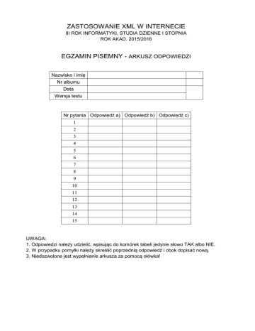 ZASTOSOWANIE XML W INTERNECIE III ROK INFORMATYKI, STUDIA DZIENNE I STOPNIA ROK AKAD. 2015/2016 EGZAMIN PISEMNY - ARKUSZ ODPOWIEDZI Nazwisko i imię Nr albumu Data Wersja testu Nr pytania Odpowiedź a) Odpowiedź b) Odpowiedź c) 1 2 3 4 5 6 7 8 9 10 11 12 13 14 15 UWAGA: 1. Odpowiedzi należy udzielić, wpisując do komórek tabeli jedynie słowo TAK albo NIE. 2. W przypadku pomyłki należy skreślić poprzednią odpowiedź i obok dopisać nową. 3. Niedozwolone jest wypełnianie arkusza za pomocą ołówka!