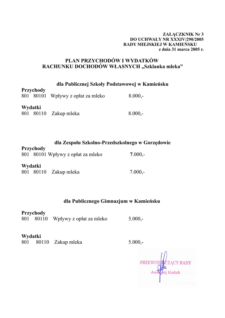 ZAŁĄCZKNIK Nr 3 DO UCHWAŁY NR XXXIV/290/2005 RADY MIEJSKIEJ W KAMIEŃSKU z dnia 31 marca 2005 r. PLAN PRZYCHODÓW I WYDATKÓW RACHUNKU DOCHODÓW WŁASNYCH „Szklanka mleka” dla Publicznej Szkoły Podstawowej w Kamieńsku Przychody 801 80101 Wpływy z opłat za mleko 8.000,- Wydatki 801 80110 8.000,- Zakup mleka dla Zespołu Szkolno-Przedszkolnego w Gorzędowie Przychody 801 80101 Wpływy z opłat za mleko 7.000,- Wydatki 801 80110 7.000,- Zakup mleka dla Publicznego Gimnazjum w Kamieńsku Przychody 801 80110 Wpływy z opłat za mleko 5.000,- Wydatki 801 80110 5.000,- Zakup mleka Plan nakładów na inwestycje na 2005 r. Wyszczególnienie Dział 600 rozdział 60016 - Kanalizacja deszczowa w Kamieńsku na ul. Reymonta, Secomskiego, Łączyńskiego - droga w Kamieńsku, ul. Armii Krajowej - budowa parkingu koło cmentarza - budowa drogi Danielów - Siódemka - budowa drogi w Koźniewicach - budowa drogi Ozga w kier. Gałk.Star. - budowa drogi Szpinalów 150 mb Dział 700 rozdział 70005 - zakup łąk w Koźniew., i inn. grun zakup gruntów pod boisko sportowe w Ochocicach - zakup gruntów pod przejście w Gorzędowie ul.Kościuszki i Mickiewicza Dział 750-rozdział 75022 Wydział na zakupy inwestycyjne Dział 750- rozdział 75023 Wydatki na zakupy inwestycyjne Dział 754 rozdział 75414 Wydatki na zakupy inwestycyjne Dział 900 rozdział 90015 -budowa linii oświetl. ulic. Koźniewice-K-sk Rok rozp Plan terminu zakończenia Nakłady planowane na 2005r. Środki z budżetu gminy na 2005r. 666.782,150.000,- 666.782,150.000,- 2005 2005 55.000,30.000,226.000,100.000,80.782,25.000,34.000,14.000,10.000,- 55.000,30.000,226.000,100.000,80.782,25.000,34.000,14.000,10.000,- 2005 10.000,- 10.000,- 15.000,15.000,35.500.35.000.10.000,10.000,97.000,50.000,- 15.000,15.000,35.500.35.000.10.000,10.000,97.000,50.000,- 2005 2005 2005 2005/2007 2005/2006 2005/2006 2005/2006 2005 2005 2005 2005 2005 Fund Programy Pomocowe dla rolnictwa Środki z budżetu państwa Kredyty i pożyczki bankowe Środki ludności -budowa linii oświetl. uliczn. w Gałk.St. -ustawienie lamp oświetl. ul. w Kamieńsku -oświetlenie uliczne na ul. Secomskiego w Kamieńsku Dział 900 rozdział 90095 - budowa kanalizacji sanit. w Barczkowicach - budowa kanalizacji san. w Ochocicach - budowa kanal.san. w Secomsk., Reymonta, Łączyńskiego w Kamieńsku - Utwardzenie placu targowicy Dział 926 rozdział 92605 - Budowa budynku socjalnego w Gorzędowie RAZEM 2005 2005 2005 30.000,7.000,10.000,- 30.000,7.000,10.000,60.000,- 2004/2005 2005 2005 1.555.765,220.765,1.175.000,100.000,60.000,100.000,100.000,- 60.000,100.000,100.000,- 2005 2005 2.514.047,- 1.018.282,- 1.495.765,220.765,1.175.000,100.000,- 1.495.765,-
