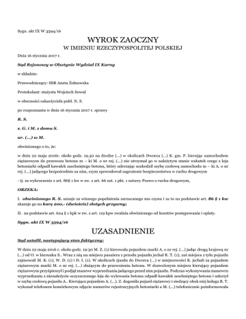 Sygn. akt IX W 3594/16 WYROK ZAOCZNY W IMIENIU RZECZYPOSPOLITEJ POLSKIEJ Dnia 16 stycznia 2017 r. Sąd Rejonowy w Olsztynie Wydział IX Karny w składzie: Przewodniczący: SSR Aneta Żołnowska Protokolant: stażysta Wojciech Sowul w obecności oskarżyciela publ. N. S. po rozpoznaniu w dniu 16 stycznia 2017 r. sprawy R. S. s. G. i M. z domu S. ur. (...) w M. obwinionego o to, że: w dniu 22 maja 2016r. około godz. 19.30 na drodze (...) w okolicach Dworca (...) K. gm. P. kierując samochodem ciężarowym do przewozu betonu m – ki M. o nr rej. (...) nie utrzymał go w należytym stanie wskutek czego z leja betoniarki odpadł kawałek zaschniętego betonu, który uderzając uszkodził szybę czołową samochodu m – ki A. o nr rej. (...) jadącego bezpośrednio za nim, czym spowodował zagrożenie bezpieczeństwa w ruchu drogowym - tj. za wykroczenie z art. 86§ 1 kw w zw. z art. 66 ust. 1 pkt. 1 ustawy Prawo o ruchu drogowym, ORZEKA: I. obwinionego R. S. uznaje za winnego popełnienia zarzucanego mu czynu i za to na podstawie art. 86 § 1 kw skazuje go na karę 200,- (dwieście) złotych grzywny; II. na podstawie art. 624 § 1 kpk w zw. z art. 119 kpw zwalnia obwinionego od kosztów postępowania i opłaty. Sygn. akt IX W 3594/16 UZASADNIENIE Sąd ustalił, następujący stan faktyczny: W dniu 22 maja 2016 r. około godz. 19:30 M. Z. (1) kierowała pojazdem marki A. o nr rej. (...) jadąc drogą krajową nr (...) od O. w kierunku S.. Wraz z nią na miejscu pasażera z przodu pojazdu jechał R. T. (1), zaś miejsca z tyłu pojazdu zajmowali M. K. (1), W. D. (1) i D. I. (1). W okolicach zjazdu do Dworca (...) w miejscowości K. jechali za pojazdem ciężarowym marki M. o nr rej. (...) służącym do przewożenia betonu. W dozwolonym miejscu kierujący pojazdem ciężarowym przyśpieszył i podjął manewr wyprzedzania jadącego przed nim pojazdu. Podczas wykonywania manewru wyprzedzania z nienależycie oczyszczonego leja do wylewania betonu odpadł kawałek zeschniętego betonu i uderzył w szybę czołową pojazdu A.. Kierująca pojazdem A. (...). Z. dogoniła pojazd ciężarowy i siedzący obok niej kolega R. T. wykonał telefonem komórkowym zdjęcie numerów rejestracyjnych betoniarki a M. (...) telefonicznie poinformowała o zdarzeniu Komedę Powiatową Policji w S.. Pojazdu ciężarowego nie udało jej się zatrzymać. Kierująca A. zjechała na stację benzynową aby zobaczyć uszkodzenia szyby, a następnie zgodnie z informacją otrzymana od dyżurnego KPP w S. udali się na K. aby złożyć zawiadomienie o zdarzeniu drogowym. W wyniku zdarzenia w samochodzie pokrzywdzonej powstały uszkodzenia w postaci pęknięcie szyby czołowej w dolnym lewym rogu. (dowody: karta zdarzenia drogowego k. 3, zeznania M. Z. (1) k. 5v., k. 73, zeznania D. I. (1) k. 12, k. 73v., zeznania R. T. (1) k. 15, k. 73v., zeznania M. K. (1) k. 21, k. 73v., zeznania W. D. (2) k. 18, k. 73v.) Wobec powyższego R. S. został obwiniony o wykroczenie z art. 86 § 1 kw w zw. z art. 66 ust. 1 pkt. 1 ustawy Prawo o ruchu drogowym. W toku przeprowadzonego postępowania obwiniony nie przyznał się do popełnienia zarzucanego mu czynu i wyjaśnił, że po każdym rozładunku myje każdy element betoniarki w szczególności lej zsypowy i wyładunkowy. Podkreślił, że dba o czystość swojego pojazdu. W dniu zdarzenia jechał pustą betoniarka do B. i wykluczył możliwość aby z pojazdu spadł kawałek betonu. Sąd nie dał wiary wyjaśnieniem obwinionego, albowiem w świetle pozostałych dowodów przeprowadzonych w sprawie, należy je traktować tylko i jedynie jako próbę uniknięcia odpowiedzialności za zarzucane wykroczenie. Sąd zważył, co następuje: Sąd w pełni podzielił zeznania wszystkich pasażerów pojazdu A. (...). Z., R. T., D. I., W. D., M. K. ponieważ są jasne, pełne i spójne. Wszyscy świadkowie jednoznacznie wskazali iż uszkodzenie szyby powstało w skutek uderzenia przez kawałek betonu, który spadł z pojazdu ciężarowego. Świadkowie dokładnie wskazali iż odpadł z leja, którym wylewa się beton. Świadkowie nie mieli również wątpliwości co do numerów rejestracyjnych pojazdu, albowiem R. T. wykonał zdjęcie tablic rejestracyjnych samochodu. Wszyscy wskazali, iż odłamek spadł przy zwiększeniu prędkości przez kierującego betoniarką podczas wykonywania przez niego manewru wyprzedzania. Jednocześnie wskazali iż sam manewr wyprzedzania wykonał on prawidłowo i w miejscu dozwolonym przepisami. Jak podkreśliła M. Z. pojazdu tego nie udało im się zatrzymać, jednak telefonicznie od razu o zdarzeniu poinformowali dyżurnego najbliższej Komendy Policji. W ocenie Sądu powyższe zeznania w pełni zasługują na podzielnie, ponieważ są jasne, pełne i spójne. Podkreślić należy iż świadkowie są dla obwinionego osobami zupełnie obcymi i nie maja powodów aby bezpodstawnie go pomawiać o spowodowanie zdarzenia drogowego. Zgodnie z treścią art. 66 ust. 1 pkt. 1 ustawy Prawo o ruchu drogowym na kierujących pojazdami ustawodawca nałożył obowiązek utrzymania pojazdu w takim stanie aby korzystanie z nich nie zagrażało bezpieczeństwu osób, które się nim poruszają oraz innych uczestników ruchu drogowego, nie naruszało porządku ruchu na drodze i nie narażało kogokolwiek na szkodę. Obwiniony nienależycie oczyścił lej betoniarki, którą się poruszał w wyniku czego spadł z niego odłamek zeschniętego betonu, do przewożenia którego służy pojazd, którym się poruszał. Wobec powyższego Sąd uznał obwinionego R. S. za winnego tego, że w dniu 22 maja 2016 r. około godz. 19:30 na drodze (...) w okolicach Dworca (...) K. gm. P. kierując samochodem ciężarowym do przewozu betonu z leja betoniarki odpadł kawałek zeschniętego betonu, który uderzając uszkodził szybę czołową samochodu m-ki A. o nr rej. (...) jadącego za nim, czym spowodował zagrożenie bezpieczeństwa w ruchu drogowym. Zachowanie obwinionego wyczerpało znamiona wykr