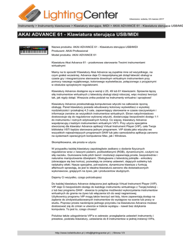 Utworzono: sobota, 04 marzec 2017 Instrumenty > Instrumenty klawiszowe > Klawiatury sterujące, MIDI > AKAI ADVANCE 61 - Klawiatura sterująca USB/MID AKAI ADVANCE 61 - Klawiatura sterująca USB/MIDI Nazwa produktu: AKAI ADVANCE 61 - Klawiatura sterująca USB/MIDI Producent: AKAI Professional Model produktu: AKAI ADVANCE 61 Klawiatura Akai Advance 61 - przełomowe sterowanie Twoimi instrumentami wirtualnymi Mamy na to sposob! Klawiatury Akai Advance są zupełnie inne od wszystkiego, na czym grałeś wcześniej. Advance daje Ci niespotykaną jak dotąd łatwość obsługi w czasie gry i nieograniczone sterowanie dowolnym wirtualnym instrumentem przy pomocy naszego wyjątkowego, kolorowego wyświetlacza, połączonego z przyjaznymi w obsłudze sprzętowymi regulatorami. Klawiatury Advance dostępne są w wersji z 25, 49 lub 61 klawiszami. Sprawnie łączą siłę instrumentow wirtualnych z łatwością obsługi stacji roboczej, więc możesz tworzyć tak, jak nigdy dotąd. Wreszcie znika podział na instrumenty wirtualne i sprzętowe! Klawiatury Advance przekształcają komputerowe wtyczki na całkowicie ręczną obsługę. Panel klawiatury posiada wbudowany kolorowy wyświetlacz o wysokiej rozdzielczości i przekątnej 4,3 cala, zapewniający sterowanie w czasie rzeczywistym i informacje zwrotne ze wszystkich instrumentow wirtualnych. Ekran natychmiastowo dostosowuje się do regulatorow wybranej wtyczki, dostarczając bezpośredni dostęp 1:1 do instrumentu i rożnych edytowalnych funkcji. Co więcej, klawiatury Advance wspołpracują z każdym instrumentem wirtualnym VSTi. Przy użyciu specjalnie stworzonej dla klawiatur Advance aplikacji Virtual Instrument Player (VIP), cała Twoja biblioteka VSTi będzie sterowana jednym programem. VIP działa jako wtyczka we wszystkich najważniejszych programach DAW lub jako samodzielna aplikacja zarowno na systemach operacyjnych komputerow Mac, jak i Windows. Skomplikowana, ale prosta w użyciu W przypadku każdej klawiatury zapobiegliwie zadbano o dodanie fizycznych regulatorow wraz z naszymi padami, podświetlanymi (RGB), dynamicznymi, czułymi na siłę nacisku. Gumowane koła pitch bend i modulacji zapewniają proste, bezpośrednie i naturalne manipulowanie dźwiękami. Obsługiwane z łatwością pokrętła - enkodery (obracające się bez końca), pozwalają na zmianę ustawień, dających subtelny lub radykalny efekt. Nasze specjalne, poł-ważone, dynamiczne klawisze z funkcją aftertouch sprawiają, że jest to idealna klawiatura zarowno dla doświadczonych wykonawcow, grających na żywo, jak i producentow studyjnych. Dajemy Ci wszystko, czego potrzebujesz Do każdej klawiatury Advance dołączona jest aplikacja Virtual Instrument Player (VIP). VIP daje Ci bezpośredni dostęp do każdego instrumentu wirtualnego z Twojej kolekcji z lub bez programu DAW - stwarza to potężne możliwości wykorzystania instrumentow wirtualnych do grania na żywo lub włączenia ich do sesji nagraniowej. Użytkownicy programu VIP mogą także tworzyć set listy, ktore zapewniają dostęp na żądanie do zindywidualizowanych instrumentow do występow na scenie lub pracy w studiu. Poprzez proste naciśnięcie jednego przycisku na klawiaturze Advance możesz dostosować się do zmian w utworze w trakcie występu - nawet bez dotykania komputera. To jest to, czego chcesz! Polubisz także udogodnienia VIP'a w zakresie: przeglądania ustawień instrumentu i presetow, podziału klawiatury, ustawiania do 8 instrumentow w jednej instancji VIPa, http://www.lcdistribution.pl | [email protected] | | Strona 1/3 Utworzono: sobota, 04 marzec 2017 Instrumenty > Instrumenty klawiszowe > Klawiatury sterujące, MIDI > AKAI ADVANCE 61 - Klawiatura sterująca USB/MID AKAI ADVANCE 61 - Klawiatura sterująca USB/MIDI szerokich możliwości indywidualnego mapowania oraz obsługi wszystkich wtyczek VSTi. Możesz uruchomić tyle instancji Virtual Instrument Player, na ile pozwoli Twoj komputer. VIP działa jako wtyczka VSTi, AU, RTAS lub AAX, pozwalając na dostęp do VSTi na praktycznie każdym programie DAW, takim jak Pro Tools, Logic Pro X, czy Ableton Live. Z klawiaturą Advance otrzymujesz swobodny dostęp do dowolnego instrumentu z Twojej kolekcji, bez utraty możliwości skupienia na instrumencie, znajdującym się przed Tobą. Nic innego nie zrobi tego dla Ciebie. Klawiatura Advance 61 dostarczana jest wraz z możliwością pobrania 16 GB ponad 10 000 brzmień od wiodących w branży tworcow z AIR Music Technology, SONiVOX i TOOLROOM RECORDS. Ta wszechstronna kolekcja dziewięciu wtyczek dostarcza Ci natychmiastową paletę wspołczesnych, poszukiwanych brzmień zarowno do występow na żywo, jak i produkcji w studiu. Najważniejsze cechy klawiatur Advance: - Klawiatury do zaawansowanej obsługi instrumentow wirtualnych - Zintegrowany, kolorowy wyświetlacz o wysokiej rozdzielczości o przekątnej 4,3 - cala, ze specjalnymi przyciskami interfejsu - Ekran dostarcza podgląd parametrow wtyczek w czasie rzeczywistym 1:1 - Zawiera program Virtual Instrument Player do niespotykanego jak dotąd zarządzania presetami instrumentow wirtualnych, mapowania oraz tworzenia złożonych presetow. - 61 poł-ważonych, dynamicznych klawiszy wysokiej jakości, z funkcją aftertouch - 8 dużych pokręteł typu enkoder (obracających się bez końca) - 8 dynamicznych i czułych siłę docisku padow MPC z podświetleniem RGB - Specjalne przyciski pad bank, sterowania transportem i zmiany oktawy - Przyciski note repeat, time-division, pattern arpeggiator i tap tempo - Gumowane koła pitch-bend i modulacji - Wejścia pedału ekspresji i nożnego przełącznika - Wejścia/wyjścia MIDI - 5 pinowe i USB do wspołpracy z oprogramowaniem i sprzętem obsługującym MIDI - Działa jako niezależny kontroler - Zawiera brzmienia: Vacuum Pro, Loom, Hybrid 3, Xpand!2, Velvet i Transfuser firmy AIR Music Tech; Eighty Eight Ensemble formy SONiVOX i ekskluzywne brzmienia stworzone przez artystow z TOOLROOM REC