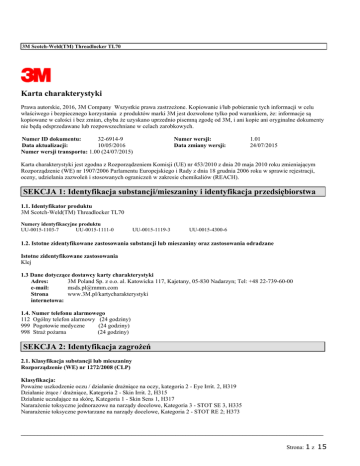 3M Scotch-Weld(TM) Threadlocker TL70 Karta charakterystyki Prawa autorskie, 2016, 3M Company Wszystkie prawa zastrzeżone. Kopiowanie i/lub pobieranie tych informacji w celu właściwego i bezpiecznego korzystania z produktów marki 3M jest dozwolone tylko pod warunkiem, że: informacje są kopiowane w całości i bez zmian, chyba że uzyskano uprzednio pisemną zgodę od 3M, i ani kopie ani oryginalne dokumenty nie będą odsprzedawane lub rozpowszechniane w celach zarobkowych. 32-6914-9 Numer ID dokumentu: 10/05/2016 Data aktualizacji: Numer wersji transportu: 1.00 (24/07/2015) Numer wersji: Data zmiany wersji: 1.01 24/07/2015 Karta charakterystyki jest zgodna z Rozporządzeniem Komisji (UE) nr 453/2010 z dnia 20 maja 2010 roku zmieniającym Rozporządzenie (WE) nr 1907/2006 Parlamentu Europejskiego i Rady z dnia 18 grudnia 2006 roku w sprawie rejestracji, oceny, udzielania zazwoleń i stosowanych ograniczeń w zakresie chemikaliów (REACH). SEKCJA 1: Identyfikacja substancji/mieszaniny i identyfikacja przedsiębiorstwa 1.1. Identyfikator produktu 3M Scotch-Weld(TM) Threadlocker TL70 Numery identyfikacyjne produktu UU-0015-1103-7 UU-0015-1111-0 UU-0015-1119-3 UU-0015-4300-6 1.2. Istotne zidentyfikowane zastosowania substancji lub mieszaniny oraz zastosowania odradzane Istotne zidentyfikowane zastosowania Klej 1.3 Dane dotyczące dostawcy karty charakterystyki 3M Poland Sp. z o.o. al. Katowicka 117, Kajetany, 05-830 Nadarzyn; Tel: +48 22-739-60-00 Adres: [email protected] e-mail: www.3M.pl/kartycharakterystyki Strona internetowa: 1.4. Numer telefonu alarmowego 112 Ogólny telefon alarmowy (24 godziny) 999 Pogotowie medyczne (24 godziny) 998 Straż pożarna (24 godziny) SEKCJA 2: Identyfikacja zagrożeń 2.1. Klasyfikacja substancji lub mieszaniny Rozporządzenie (WE) nr 1272/2008 (CLP) Klasyfikacja: Poważne uszkodzenie oczu / działanie drażniące na oczy, kategoria 2 - Eye Irrit. 2, H319 Działanie żrące / drażniące, Kategoria 2 - Skin Irrit. 2, H315 Działanie uczulające na skórę, Kategoria 1 - Skin Sens 1, H317 Nararażenie toksyczne jednorazowe na narządy docelowe, Kategoria 3 - STOT SE 3, H335 Nararażenie toksyczne powtarzane na narządy docelowe, Kategoria 2 - STOT RE 2; H373 __________________________________________________________________________________________ Strona: 1 z 15 3M Scotch-Weld(TM) Threadlocker TL70 Niebezpieczne dla środowiska wodnego (przewlekłe), kategoria 2 - Aquatic Chronic 2 H411 Pełne brzmienie zwrotów H w sekcji 16. 2.2. Elementy oznakowania Rozporządzenie (WE) nr 1272/2008 (CLP) Hasło ostrzegawcze: UWAGA Symbole:: GHS07 (Wykrzyknik) GHS08 (Zagrożenie dla zdrowia)GHS09 (Środowisko) Piktogramy: Zawiera: Nazwa substancji Dimetakrylan glikolu trietylenowego Metakrylan hydroksypropylu Kwas akrylowy Hydronadtlenek kumenu 1-Acetylo-2-fenylohydrazyna Nr CAS 109-16-0 27813-02-1 79-10-7 80-15-9 114-83-0 Stężenie % 40 - 70 1 - 10 1- 5 1- 5 <= 0,5 Zwroty wskazujące rodzaj zagrożenia: H319 Działa drażniąco na oczy. H315 Działa drażniąco na skórę. H317 Może powodować reakcję alergiczną skóry. H335 Może powodować podrażnienie dróg oddechowych. H373 Może powodować uszkodzenie narządów poprzez długotrwałe lub narażenie powtarzane: układ nerwowy | układ oddechowy | H411 Działa toksycznie na organizmy wodne, powodując długotrwałe skutki. Zwroty wskazujące środki ostrożności: Zapobieganie: P260A P280E P273 Reagowanie: P305 + P351 + P338 P333 + P313 Nie wdychać par. Stosować rękawice ochronne. Unikać uwolnienia do środowiska. W PRZYPADKU DOSTANIA SIĘ DO OCZU: Ostrożnie płukać wodą przez kilka minut. Wyjąć soczewki kontaktowe, jeżeli są i można je łatwo usunąć. Nadal płukać. W przypadku wystąpienia podrażnienia skóry lub wysypki: Zasięgnąć porady/zgłosić się pod opiekę lekarza. Usuwanie: P501 Zawartość/pojemnik usuwać zgodnie z miejscowymi/regionalnymi/krajowymi/międzynarodowymi przepisami. __________________________________________________________________________________________ Strona: 2 z 15 3M Scotch-Weld(TM) Threadlocker TL70 Dla oznakowania produktu o pojemności <=125 ml następujące zwroty H i P mogą zostać użyte: <=125 ml Zwroty wskazujące rodzaj zagrożenia: H317 Może powodować reakcję alergiczną skóry. <=125 ml Zwroty wskazujące środki ostrożności Zapobieganie: P280E Reagowanie: P333 + P313 Stosować rękawice ochronne. W przypadku wystąpienia podrażnienia skóry lub wysypki: Zasięgnąć porady/zgłosić się pod opiekę lekarza. 1% mieszaniny zawiera składniki o nieznanej ostrej toksyczności skórnej 2% mieszaniny zawiera składniki o nieznanej toksyczności ostrej inhalacyjnej. Zawiera 92% składników stanowi nieznane zagrożenie dla środowiska wodnego. 2.3. Inne zagrożenia Nieznane SEKCJA 3: Skład/informacja o składnikach Nazwa substancji Dimetakrylan glikolu trietylenowego Nr CAS 109-16-0 Nr WE 203-652-6 Stężenie % 40 - 70 Metakrylan hydroksypropylu 27813-02-1 248-666-3 1 - 10 Kwas akrylowy 79-10-7 201-177-9 1- 5 Hydronadtlenek kumenu 80-15-9 201-254-7 1- 5 Sacharyna 81-07-2 201-321-0 <= 1 1-Acetylo-2-fenylohydrazyna 114-83-0 204-055-3 <= 0,5 Żywica poliestrowa Tajemnica handlowa Brak 20 - 40 Klasyfikacja Skin Sens. 1, H317 (Klasyfikacja 3M) Eye Irrit. 2, H319; Skin Sens. 1, H317; STOT SE 3, H335 (Dostawca) Flam. Liq. 3, H226; Acute Tox. 4, H332; Acute Tox. 4, H312; Acute Tox. 4, H302; Skin Corr. 1A, H314; STOT SE 3, H335; Aquatic Acute 1, H400,M=1 Nota D (CLP) Org. Perox. EF, H242; Acute Tox. 2, H330; Acute Tox. 3, H311; Acute Tox. 4, H302; Skin Corr. 1B, H314; STOT SE 3, H335; STOT RE 1, H372; Aquatic Chronic 2, H411 (CLP) Substancja niesklasyfikowana jako niebezpieczna Skin Irrit. 2, H315; Eye Irrit. 2, H319; Skin Sens. 1, H317; STOT SE 3, H335 (Dostawca) Acute Tox. 3, H311; Acute Tox. 3, H301; Aquatic Acute 1, H400,M=1; Aquatic Chronic 1, H410,M=10 (Klasyfikacja 3M) Substancja niesklasyfikowana jako niebezpieczna _____________________________