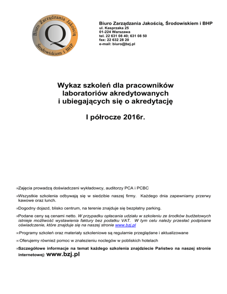 Biuro Zarządzania Jakością, Środowiskiem i BHP ul. Kasprzaka 25 01-224 Warszawa tel. 22 631 08 40; 631 08 50 fax: 22 632 28 20 e-mail: [email protected] Wykaz szkoleń dla pracowników laboratoriów akredytowanych i ubiegających się o akredytację I półrocze 2016r. • Zajęcia prowadzą doświadczeni wykładowcy, auditorzy PCA i PCBC • Wszystkie szkolenia odbywają się w siedzibie naszej firmy. Każdego dnia zapewniamy przerwy kawowe oraz lunch. • Dogodny dojazd, blisko centrum, na terenie znajduje się bezpłatny parking. • Podane ceny są cenami netto. W przypadku opłacania udziału w szkoleniu ze środków budżetowych istnieje możliwość wystawienia faktury bez podatku VAT. W tym celu należy przesłać podpisane oświadczenie, które znajduje się na naszej stronie www.bzj.pl • Programy szkoleń oraz materiały szkoleniowe są regularnie przeglądane i aktualizowane • Oferujemy również pomoc w znalezieniu noclegów w pobliskich hotelach • Szczegółowe informacje na temat każdego szkolenia znajdziecie Państwo na naszej stronie internetowej: www.bzj.pl Szkolenia dla laboratoriów akredytowanych i ubiegających się o akredytację 2016r. styczeń luty marzec kwiecień maj czerwiec Cykl szkoleń: SYSTEM ZARZĄDZANIA LABORATORIUM 15.02 18.04 23.05 16-17.02 19-20.04 24-25.05 Wprowadzenie do normy PN-EN ISO/IEC 17025:2005 + Ap1:2007 (SZL-01) 1 dniowe 22-23.06 Audit wewnętrzny w laboratorium (AWL-02) 2 dniowe 18-19.01 15-16.03 12-13.05 Doskonalenie systemu zarządzania laboratorium według normy PN-EN ISO/IEC 17025:2005 (DSZ-04) 2 dniowe 22.02 7.04 13.06 23.02 8.04 14.06 24-25.02 21-22.04 21-22.06 Interpretacja wymagań dokumentów PCA stanowiących kryteria oceny laboratorium badawczego (JK-2) 1 dniowe Badania biegłości zgodnie z PN-EN ISO/IEC 17043:2011 (JK-4) 1 dniowe Doskonalenie auditów wewnętrznych w laboratorium” (DAL-5) 2 dniowe 11.01 4.03 15.06 29.01 11.03 14.06 Doskonalenie umiejętności auditowania laboratorium-warsztaty (DUA-6) 1 dniowe Odstępstwa, niezgodności działania korygujące i zapobiegawcze 1 dniowe Pomiary masy (sprawdzanie wag) 2 dniowe 29.021.03 25-26.04 20-21.06 • SZL-01 Szkolenie wstępne. Stanowi podstawę do pozostałych szkoleń. Zakresem obejmuje omówienie podstawowych wymagań normy 17025. Cena 490,• AWL-02 Szkolenie przeznaczone dla auditorów wewnętrznych i kandydatów na auditorów. Po zakończeniu szkolenia możliwe przystąpienie do egzaminu na tytuł „AUDITOR WEWNĘTRZNY W LABORATORIUM”. Cena 800,• DSZ-04 Szkolenie przeznaczone dla pracowników akredytowanych laboratoriów, którzy mają doświadczenie zawodowe, oraz uczestniczyli wcześniej w szkoleniach. Ukończenie kursu pozwoli lepiej i efektywniej zarządzać laboratorium. Cena 800,• JK-02 Szczegółowe omówienie oraz interpretacja wymagań stawianych przez PCA laboratoriom ubiegającym się o akredytację. Cena 460,• JK-04 Podczas szkolenia omówione zostaną wymagania zawarte w normie 17043:2011. Cena 470,• DAL-05 Szkolenie przeznaczone dla pracowników laboratoriów, którzy mają styczność z auditami wewnętrznymi (zarówno prowadząc je jak i organizując). Szkolenie ukierunkowane na doskonalenie całego systemu auditów wewnętrznych w laboratorium. Cena 880,• DUA-06 Szkolenie przeznaczone dla osób prowadzących audity. Podczas szkolenia główny nacisk położony jest na praktyczną stronę prowadzenia auditu i doskonalenie potrzebnych umiejętności. Cena 490,• Odstępstw, niezgodności, działania korygujące i zapobiegawcze. Podczas szkolenia omówione zostaną na konkretnych przykładach najczęściej spotykane podczas auditów odstępstwa i niezgodności. Szczegółowo omówione zostaną najczęściej zalecane i podejmowane działania korygujące. Cena 490,• Pomiary masy. Dwudniowe szkolenie (z elementami ćwiczeń praktycznych) dla wszystkich osób, które mają do czynienia z pomiarami masy (dokonywanymi zarówno przy pomocy wag laboratoryjnych jak i większych zestawów pomiarowych). Cena 750,-
