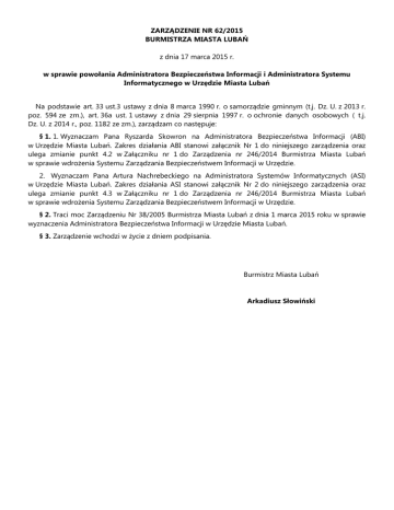 ZARZĄDZENIE NR 62/2015 BURMISTRZA MIASTA LUBAŃ z dnia 17 marca 2015 r. w sprawie powołania Administratora Bezpieczeństwa Informacji i Administratora Systemu Informatycznego w Urzędzie Miasta Lubań Na podstawie art. 33 ust.3 ustawy z dnia 8 marca 1990 r. o samorządzie gminnym (t.j. Dz. U. z 2013 r. poz. 594 ze zm.), art. 36a ust. 1 ustawy z dnia 29 sierpnia 1997 r. o ochronie danych osobowych ( t.j. Dz. U. z 2014 r., poz. 1182 ze zm.), zarządzam co następuje: § 1. 1. Wyznaczam Pana Ryszarda Skowron na Administratora Bezpieczeństwa Informacji (ABI) w Urzędzie Miasta Lubań. Zakres działania ABI stanowi załącznik Nr 1 do niniejszego zarządzenia oraz ulega zmianie punkt 4.2 w Załączniku nr 1 do Zarządzenia nr 246/2014 Burmistrza Miasta Lubań w sprawie wdrożenia Systemu Zarządzania Bezpieczeństwem Informacji w Urzędzie. 2. Wyznaczam Pana Artura Nachrebeckiego na Administratora Systemów Informatycznych (ASI) w Urzędzie Miasta Lubań. Zakres działania ASI stanowi załącznik Nr 2 do niniejszego zarządzenia oraz ulega zmianie punkt 4.3 w Załączniku nr 1 do Zarządzenia nr 246/2014 Burmistrza Miasta Lubań w sprawie wdrożenia Systemu Zarządzania Bezpieczeństwem Informacji w Urzędzie. § 2. Traci moc Zarządzeniu Nr 38/2005 Burmistrza Miasta Lubań z dnia 1 marca 2015 roku w sprawie wyznaczenia Administratora Bezpieczeństwa Informacji w Urzędzie Miasta Lubań. § 3. Zarządzenie wchodzi w życie z dniem podpisania. Burmistrz Miasta Lubań Arkadiusz Słowiński Załącznik Nr 1 do Zarządzenia Nr 62/2015 Burmistrza Miasta Lubań z dnia 17 marca 2015 r. Zakres działania Administratora Bezpieczeństwa Informacji (ABI) Stosowanie środków technicznych i organizacyjnych zapewniających ochronę przetwarzania danych odpowiednią do zagrożeń oraz kategorii danych objętych ochroną, a w szczególności zabezpieczenie danych przed ich udostępnianiem osobom nieupoważnionym, zabraniem przez osobę nieupoważnioną, przetwarzaniem z naruszeniem ustawy, utratą, uszkodzeniem lub zniszczeniem. Do zadań Administratora Bezpieczeństwa Informacji należy: 1) Zapewnianie przestrzegania przepisów o ochronie danych osobowych, w szczególności przez: a) sprawdzanie zgodności przetwarzania danych osobowych z przepisami o ochronie danych osobowych oraz opracowanie w tym zakresie sprawozdania dla administratora danych, b) nadzorowanie opracowania i aktualizowania dokumentacji, o której mowa w art. 36 ust. 2, oraz przestrzegania zasad w niej określonych, c) zapewnianie zapoznania osób upoważnionych do przetwarzania danych osobowych z przepisami o ochronie danych osobowych; 2) Prowadzenie rejestru zbiorów danych przetwarzanych przez administratora danych, z wyjątkiem zbiorów, o których mowa w art. 43 ust. 1, zawierającego nazwę zbioru oraz informacje, o których mowa w art. 41 ust. 1 pkt 2-4a i 7. 3) Nadzór nad fizycznym zabezpieczeniem pomieszczeń, w których przetwarzane są dane osobowe oraz kontrola przebywających w nich osób. 4) Zapewnienie awaryjnego zasilania komputerów oraz innych urządzeń mających wpływ na bezpieczeństwo przetwarzania danych osobowych. 5) Nadzór nad naprawami, konserwacją oraz likwidacją urządzeń komputerowych na których zapisywane są dane osobowe. 6) Nadzór nad zarządzaniem hasłami użytkowników i przestrzeganiem procedur określających częstotliwość ich zmiany. 7) Nadzór nad czynnościami związanymi ze sprawdzaniem systemu pod kątem obecności wirusów komputerowych. 8) Nadzór nad wykonywaniem kopii awaryjnych. 9) Nadzór nad systemem komunikacji w sieci komputerowej. 10) Przeciwdziałanie dostępowi osób niepowołanych do przetwarzania danych osobowych. 11) Kontrola nad danymi osobowymi wprowadzonymi do zbiorów (przez kogo zostały wprowadzone, komu są przekazywane). 12) Podejmowanie odpowiednich działań w przypadku wykrycia naruszeń lub podejrzenia naruszenia zabezpieczeń. 13) Nadzór nad obiegiem oraz przechowywaniem dokumentów zawierających dane osobowe. 14) Nadzór nad prawidłowością archiwizacji oraz usuwania danych osobowych. 15) Monitorowanie zabezpieczeń wdrożonych w celu ochrony danych osobowych. Administrator Bezpieczeństwa Informacji uprawniony jest do: 1) Wydawania poleceń wszystkim pracownikom Urzędu Miasta Lubań w zakresie związanym ze wdrożeniem, utrzymaniem i doskonaleniem Systemu Zarządzania Bezpieczeństwem Informacji. 2) Rozstrzygania sporów dotyczących stosowania i interpretacji wymagań zawartych w dokumentacji Systemu Zarządzania Bezpieczeństwem Informacji oraz wydawania wiążących decyzji w tym zakresie. 3) Dostępu do wszystkich dokumentów występujących w Urzędzie Miasta Lubań, których treść może być istotna z punktu widzenia funkcjonowania Systemu Zarządzania Bezpieczeństwem Informacji. 4) Uzyskania wyjaśnień od pracowników w zakresie realizowanych działań w ramach Systemu Zarządzania Bezpieczeństwem Informacji. 5) Podejmowania decyzji w kwestiach bezpieczeństwa Informacji, w zakresie nierodzącym zobowiązań finansowych, w szczególności w zakresie współpracy Urzędu Miasta Lubań z zewnętrznymi jednostkami organizacyjnymi. Załącznik Nr 2 do Zarządzenia Nr 62/2015 Burmistrza Miasta Lubań z dnia 17 marca 2015 r. Zakres działania Administratora Systemu Informatycznego (ASI) Administrator Systemu Informatycznego, w zakresie zadań wykonywanych dla zapewnienia systemom bezpieczeństwa, zgodnego z celami i metodologią wdrożonej polityki bezpieczeństwa informacji, współpracuje bezpośrednio z Administratorem Bezpieczeństwa Informacji (ABI). Do zadań Administratora Systemu Informatycznego należy: 1) Formułowanie, w uzgodnieniu z administratorem danych i/lub osobami, do których administrator delegował zarządzanie uprawnieniami oraz ABI, sposobu określania uprawnień w systemach informatycznych. 2) Realizacja decyzji Administratora Danych Osobowych (/innych) odnośnie nadania osobom uprawnień dostępu do danych i wybranych 
