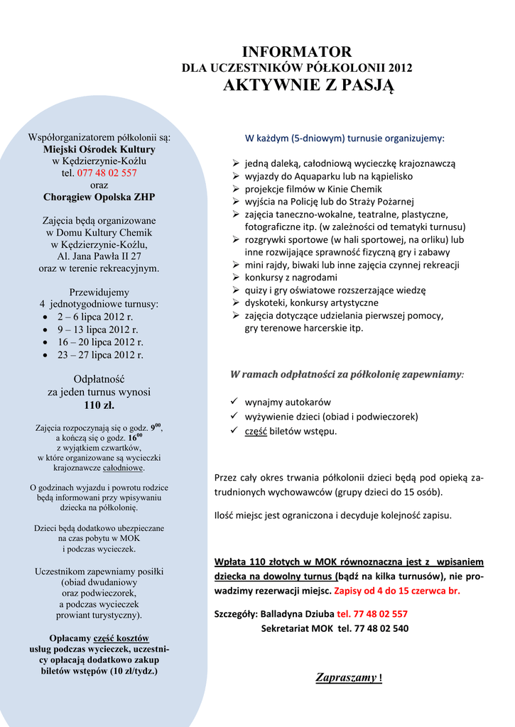 INFORMATOR DLA UCZESTNIKÓW PÓŁKOLONII 2012 AKTYWNIE Z PASJĄ Współorganizatorem półkolonii są: Miejski Ośrodek Kultury w Kędzierzynie-Koźlu tel. 077 48 02 557 oraz Chorągiew Opolska ZHP Zajęcia będą organizowane w Domu Kultury Chemik w Kędzierzynie-Koźlu, Al. Jana Pawła II 27 oraz w terenie rekreacyjnym. Przewidujemy 4 jednotygodniowe turnusy: 2 – 6 lipca 2012 r. 9 – 13 lipca 2012 r. 16 – 20 lipca 2012 r. 23 – 27 lipca 2012 r. Odpłatność za jeden turnus wynosi 110 zł. Zajęcia rozpoczynają się o godz. 900, a kończą się o godz. 1600 z wyjątkiem czwartków, w które organizowane są wycieczki krajoznawcze całodniowe. O godzinach wyjazdu i powrotu rodzice będą informowani przy wpisywaniu dziecka na półkolonię. W każdym (5-dniowym) turnusie organizujemy: jedną daleką, całodniową wycieczkę krajoznawczą wyjazdy do Aquaparku lub na kąpielisko projekcje filmów w Kinie Chemik wyjścia na Policję lub do Straży Pożarnej zajęcia taneczno-wokalne, teatralne, plastyczne, fotograficzne itp. (w zależności od tematyki turnusu) rozgrywki sportowe (w hali sportowej, na orliku) lub inne rozwijające sprawność fizyczną gry i zabawy mini rajdy, biwaki lub inne zajęcia czynnej rekreacji konkursy z nagrodami quizy i gry oświatowe rozszerzające wiedzę dyskoteki, konkursy artystyczne zajęcia dotyczące udzielania pierwszej pomocy, gry terenowe harcerskie itp. W ramach odpłatności za półkolonię zapewniamy: wynajmy autokarów wyżywienie dzieci (obiad i podwieczorek) część biletów wstępu. Przez cały okres trwania półkolonii dzieci będą pod opieką zatrudnionych wychowawców (grupy dzieci do 15 osób). Ilość miejsc jest ograniczona i decyduje kolejność zapisu. Dzieci będą dodatkowo ubezpieczane na czas pobytu w MOK i podczas wycieczek. Uczestnikom zapewniamy posiłki (obiad dwudaniowy oraz podwieczorek, a podczas wycieczek prowiant turystyczny). Opłacamy część kosztów usług podczas wycieczek, uczestnicy opłacają dodatkowo zakup biletów wstępów (10 zł/tydz.) Wpłata 110 złotych w MOK równoznaczna jest z wpisaniem dziecka na dowolny turnus (bądź na kilka turnusów), nie prowadzimy rezerwacji miejsc. Zapisy od 4 do 15 czerwca br. Szczegóły: Balladyna Dziuba tel. 77 48 02 557 Sekretariat MOK tel. 77 48 02 540 Zapraszamy ! Wycieczki krajoznawcze biwaki w terenie rekreacyjnym zajęcia w terenie leśnym PROGRAM W SKRÓCIE 2.07.2012 r. Bezpieczne wakacje – program profilaktyczno-wychowawczy Policji Powiatowej w Kędzierzynie-Koźlu 3.07.2012 r. Wycieczka do Nadleśnictwa Kędzierzyn w Starej Kuźni (spotkanie z nadleśniczym, wystawa przyrodnicza, gra leśna, ognisko) 4.07.2012 r. Wyjazd do Aquaparku w Zdzieszowicach lub wyjście na basen w Kędzierzynie-Koźlu 5.07.2012 r. Wycieczka całodzienna do Parku Miniatur w Inwałdzie (Zielony Labirynt) 6.07.2012 r. Konkurs tańca, konkurs piosenki, dyskoteka pożegnalna 9.07.2012 r. Bezpieczne wakacje – program profilaktyczno-wychowawczy Państwowej Straży Pożarnej w Kędzierzynie-Koźlu 10.07.2012 r. Rajd pieszy na Górę św. Anny (wędrówka od PKP w Zdzieszowicach) 11.07.2012 r. Wyjazd do Aquaparku w Zdzieszowicach lub wyjście na basen w Kędzierzynie-Koźlu 12.07.2012 r. Wycieczka całodzienna do Juraparku w Krasiejowie 13.07.2012 r. Prezentacje teatralne, dyskoteka pożegnalna 16.07.2012r. Bezpieczne wakacje – program profilaktyczno-wychowawczy Policji Powiatowej w Kędzierzynie-Koźlu 17.07.2012 r. Rejs po rzece Odrze – fotografia krajobrazu 18.07.2012 r. Wyjazd do Aquaparku w Zdzieszowicach lub wyjście na basen w Kędzierzynie-Koźlu 19.07.2012 r. Wycieczka całodzienna do Parku Niespodzianek w Ustroniu 20.07.2012 r. Prezentacje plastyczno-malarskie, dyskoteka pożegnalna 23.07.2012 r. Bezpieczne wakacje – program profilaktyczno-wychowawczy Państwowej Straży Pożarnej w Kędzierzynie-Koźlu 24.07.2012 r. Wycieczka do Nadleśnictwa Kędzierzyn w Starej Kuźni (spotkanie z nadleśniczym, wystawa przyrodnicza, gra leśna, ognisko) 25.07.2012 r. Wyjazd do Aquaparku w Zdzieszowicach lub wyjście na basen w Kędzierzynie-Koźlu 26.07.2012 r. Wycieczka całodzienna do Ogrodu Doświadczeń w Krakowie 27.07.2012 r. Prezentacje prac fotograficznych, dyskoteka pożegnalna Zajęcia alternatywne: W przypadku niepogody w czasie zaplanowanych zajęć terenowych(gra leśna, gra terenowa, ognisko, basen) zajęcia zostaną zorganizowane na terenie MOK (warsztaty taneczne, wokalne, plastyczne, malarskie, fotograficzne, zajęcia z gier planszowych, szachów, warsztaty modelarskie, koralikowe, zabawy w izbie w małych grupach/.