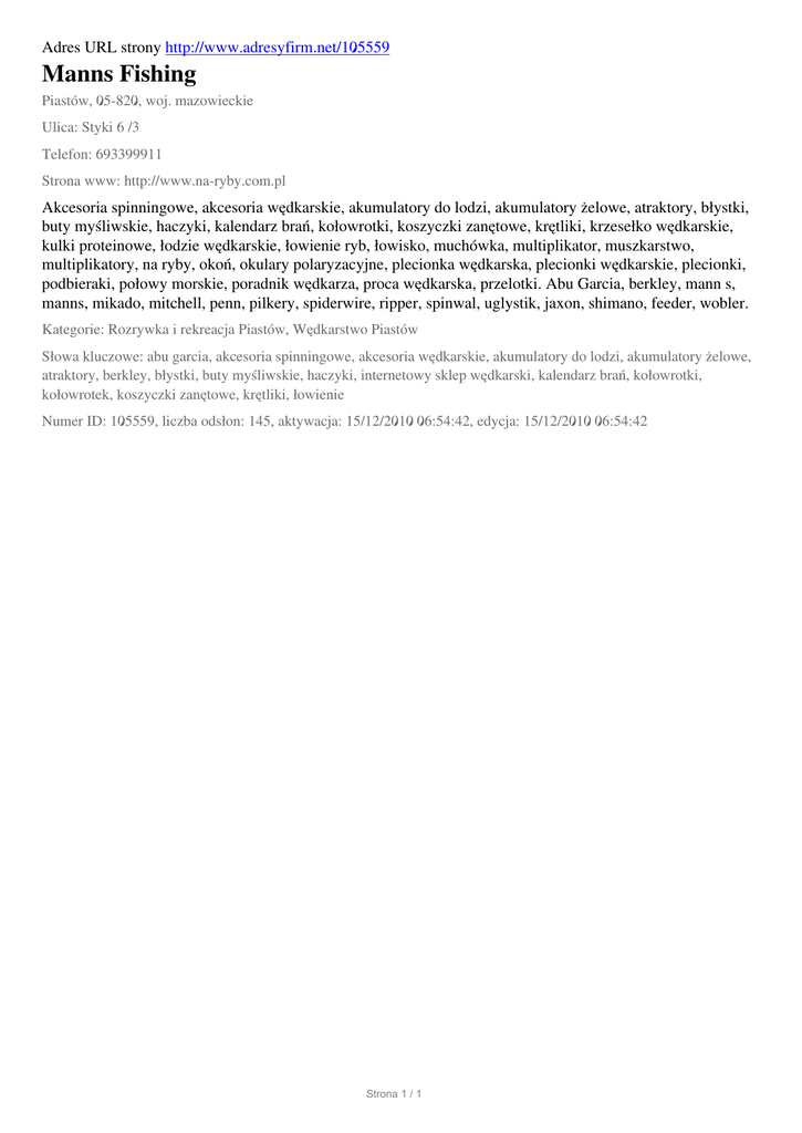 Adres URL strony http://www.adresyfirm.net/105559 Manns Fishing Piastów, 05-820, woj. mazowieckie Ulica: Styki 6 /3 Telefon: 693399911 Strona www: http://www.na-ryby.com.pl Akcesoria spinningowe, akcesoria wędkarskie, akumulatory do lodzi, akumulatory żelowe, atraktory, błystki, buty myśliwskie, haczyki, kalendarz brań, kołowrotki, koszyczki zanętowe, krętliki, krzesełko wędkarskie, kulki proteinowe, łodzie wędkarskie, łowienie ryb, łowisko, muchówka, multiplikator, muszkarstwo, multiplikatory, na ryby, okoń, okulary polaryzacyjne, plecionka wędkarska, plecionki wędkarskie, plecionki, podbieraki, połowy morskie, poradnik wędkarza, proca wędkarska, przelotki. Abu Garcia, berkley, mann s, manns, mikado, mitchell, penn, pilkery, spiderwire, ripper, spinwal, uglystik, jaxon, shimano, feeder, wobler. Kategorie: Rozrywka i rekreacja Piastów, Wędkarstwo Piastów Słowa kluczowe: abu garcia, akcesoria spinningowe, akcesoria wędkarskie, akumulatory do lodzi, akumulatory żelowe, atraktory, berkley, błystki, buty myśliwskie, haczyki, internetowy sklep wędkarski, kalendarz brań, kołowrotki, kołowrotek, koszyczki zanętowe, krętliki, łowienie Numer ID: 105559, liczba odsłon: 145, aktywacja: 15/12/2010 06:54:42, edycja: 15/12/2010 06:54:42 Strona 1 / 1