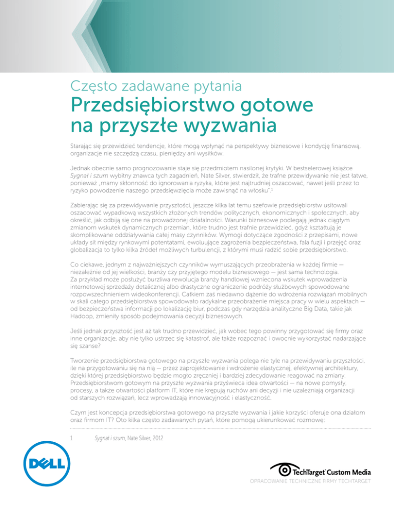 Często zadawane pytania Przedsiębiorstwo gotowe na przyszłe wyzwania Starając się przewidzieć tendencje, które mogą wpłynąć na perspektywy biznesowe i kondycję finansową, organizacje nie szczędzą czasu, pieniędzy ani wysiłków. Jednak obecnie samo prognozowanie staje się przedmiotem nasilonej krytyki. W bestselerowej książce Sygnał i szum wybitny znawca tych zagadnień, Nate Silver, stwierdził, że trafne przewidywanie nie jest łatwe, ponieważ „mamy skłonność do ignorowania ryzyka, które jest najtrudniej oszacować, nawet jeśli przez to ryzyko powodzenie naszego przedsięwzięcia może zawisnąć na włosku”.1 Zabierając się za przewidywanie przyszłości, jeszcze kilka lat temu szefowie przedsiębiorstw usiłowali oszacować wypadkową wszystkich złożonych trendów politycznych, ekonomicznych i społecznych, aby określić, jak odbiją się one na prowadzonej działalności. Warunki biznesowe podlegają jednak ciągłym zmianom wskutek dynamicznych przemian, które trudno jest trafnie przewidzieć, gdyż kształtują je skomplikowane oddziaływania całej masy czynników. Wymogi dotyczące zgodności z przepisami, nowe układy sił między rynkowymi potentatami, ewoluujące zagrożenia bezpieczeństwa, fala fuzji i przejęć oraz globalizacja to tylko kilka źródeł możliwych turbulencji, z którymi musi radzić sobie przedsiębiorstwo. Co ciekawe, jednym z najważniejszych czynników wymuszających przeobrażenia w każdej firmie — niezależnie od jej wielkości, branży czy przyjętego modelu biznesowego — jest sama technologia. Za przykład może posłużyć burzliwa rewolucja branży handlowej wzniecona wskutek wprowadzenia internetowej sprzedaży detalicznej albo drastyczne ograniczenie podróży służbowych spowodowane rozpowszechnieniem wideokonferencji. Całkiem zaś niedawno dążenie do wdrożenia rozwiązań mobilnych w skali całego przedsiębiorstwa spowodowało radykalne przeobrażenie miejsca pracy w wielu aspektach — od bezpieczeństwa informacji po lokalizację biur, podczas gdy narzędzia analityczne Big Data, takie jak Hadoop, zmieniły sposób podejmowania decyzji biznesowych. Jeśli jednak przyszłość jest aż tak trudno przewidzieć, jak wobec tego powinny przygotować się firmy oraz inne organizacje, aby nie tylko ustrzec się katastrof, ale także rozpoznać i owocnie wykorzystać nadarzające się szanse? Tworzenie przedsiębiorstwa gotowego na przyszłe wyzwania polega nie tyle na przewidywaniu przyszłości, ile na przygotowaniu się na nią — przez zaprojektowanie i wdrożenie elastycznej, efektywnej architektury, dzięki której przedsiębiorstwo będzie mogło zręczniej i bardziej zdecydowanie reagować na zmiany. Przedsiębiorstwom gotowym na przyszłe wyzwania przyświeca idea otwartości — na nowe pomysły, procesy, a także otwartości platform IT, które nie krępują ruchów ani decyzji i nie uzależniają organizacji od starszych rozwiązań, lecz wprowadzają innowacyjność i elastyczność. Czym jest koncepcja przedsiębiorstwa gotowego na przyszłe wyzwania i jakie korzyści oferuje ona działom oraz firmom IT? Oto kilka często zadawanych pytań, które pomogą ukierunkować rozmowę: 1 Sygnał i szum, Nate Silver, 2012 OPRACOWANIE TECHNICZNE FIRMY TECHTARGET Jakie strategie składają się na koncepcję przedsiębiorstwa gotowego na przyszłe wyzwania? Organizacje powinny mieć na względzie zarówno możliwości tradycyjne, takie jak zasoby do obsługi kluczowych obciążeń roboczych oraz infrastruktura wirtualna, jak i nowe, takie jak chmura, analizy Big Data oraz globalne rozwiązania zdefiniowane programowo. Nie należy rezygnować ze starych funkcji, lecz wykorzystać je do rozbudowy i rozwoju działalności. Przedsiębiorstwa gotowe na przyszłe wyzwania starają się także uniknąć uzależnienia od wybranych technologii, producentów oraz procesów biznesowych, aby zachować elastyczność i zdolność dostosowania się do nieprzewidzianych zmian. Kolejna taktyka polega na tym, że stając w obliczu nowych wyzwań, takich jak Internet of Things, cyfrowy styl życia przejawiający się w ciągłej obecności w sieci oraz gwałtowny przyrost danych, przedsiębiorstwo (oraz jego dział IT) powinno traktować je raczej jako szanse rozwoju niż zagrożenia, które za wszelką cenę należy zwalczać. Nie oznacza to jednak, że przedsiębiorstwo ma działać pod dyktando nowych wyzwań i pozwolić, aby zakłóciły one jego planowe funkcjonowanie. Wręcz przeciwnie, powinno ono uzyskać gotowość na przyszłe wyzwania na własnych warunkach, czyli wdrożyć rozwiązania najlepiej sprawdzające się w przypadku danej organizacji i jej stylu działania, zamiast rezygnować z części własnych ambicji biznesowych wskutek ograniczeń tychże rozwiązań. Najskuteczniejsze przedsiębiorstwa wdrożą procesy w myśl zasady, że cała organizacja jest tak innowacyjna jak jej dział IT. Ponieważ technologia i biznes są ze sobą ściśle powiązane, organizacje IT muszą przestać poświęcać zbyt wiele czasu i zasobów na czynności podtrzymujące działanie systemu. Nieocenioną pomocą jest w tym względzie automatyzacja oraz nowe procesy, które pozwolą przenieść środek ciężkości działań informatycznych z konserwacji infrastruktury na współpracę z interesariuszami biznesowymi, dzięki czemu dział IT staje się strategicznym partnerem inicjatyw prowadzących do zwiększenia przewagi konkurencyjnej przedsiębiorstwa. W jaki sposób przedsiębiorstwo gotowe na przyszłe wyzwania godzi tradycyjny system IT z nowymi koncepcjami informatycznymi? Warto zabezpieczyć korzyści z istniejącej infrastruktury. Starych rozwiązań nie wyrzuca się tylko dlatego, że są stare. Podobnie w celu unowocześnienia operacji IT nie trzeba koniecznie całościowo modernizować systemu. Należy również zabezpieczyć możliwość uruchamiania zarówno tradycyjnych, jak i nowych aplikacji inform