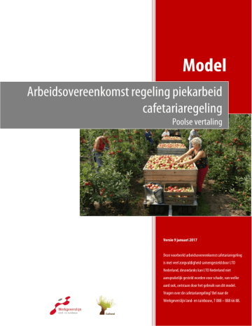Umowa o pracę na czas określony w związku z regulacjami dotyczącymi pracy sezonowej z zastosowaniem uzgodnień w sprawie kosztów przesiedleńczych pomiędzy LTO Nederland a Urzędem Skarbowym Niżej podpisani: Nazwa firmy ………………………………………………………………………………………………… Siedziba ………………………………………………………………………………………………….. Numer członkowski xLTO lub organizacja techniczna należąca do LTO (holenderskie zrzeszenie przedstawicieli branży rolniczej i ogrodniczej): ……………………... prawnie reprezentowana przez: (nazwisko pracownika) ……………………………………...… zwana dalej „Pracodawcą” oraz Nazwisko pracownika ………………………………………………………………………………………………… Adres zamieszkania w kraju pochodzenia pracownika: …………………………………………………………….. Miejsce zamieszkania w kraju pochodzenia pracownika …………………………………………………………………. Czasowe miejsce pobytu pracownika ……………………………………………………………………………... Data urodzenia pracownika ……………………………………………………………………………………… Numer BSN pracownika ………………………………………………………………………………. zwany dalej „Pracownikiem” oświadczają niniejszym, że zawarli umowę o pracę na następujących warunkach: 1. 2. 3. 4. Pracownik zostaje z dniem ________ (data) zatrudniony przez pracodawcę na stanowisku ___________________. Umowa o pracę zostaje zawarta na czas określony i wygasa z mocy prawa dnia ________ (data).* Wymiar czasu pracy wynosi standardowo 38 godzin tygodniowo. Istnieje możliwość wykonywania pracy w wymiarze większym niż 38 godzin tygodniowo w oparciu o postanowienia Układu Zbiorowego Pracy. Pracownik akceptuje fakt, iż w wyniku sezonowego charakteru pracy czas pracy może być zmienny, przez co liczba przepracowanych godzin dziennie i/lub tygodniowo może być większa lub mniejsza od ustalonego średniego czasu pracy. Pracodawca i pracownik będą uzgadniać to ze sobą. W odniesieniu do niniejszej umowy o pracę zastosowanie mają aktualne i przyszłe zapisy Układu Zbiorowego Pracy (CAO) dla Sektora Upraw na Wolnym Powietrzu/Upraw Szklarniowych. 5. Zgodnie z regulacjami dotyczącymi pracy sezonowej zawartymi w mającym zastosowanie Układzie Zbiorowym Pracy (CAO) pracownik otrzymuje ustawowe wynagrodzenie minimalne (dla pracowników młodocianych), wyliczone w oparciu o 38-godzinny tydzień pracy. W chwili rozpoczęcia stosunku pracy wynagrodzenie wynosi ______ EUR brutto za godzinę. Pracownik otrzymuje dodatek w wysokości 0,7% przysługującego mu wynagrodzenia.* 6. 7. 8. Pracownikowi wypłacony zostaje, w momencie rozwiązania stosunku pracy/za okres płacowy, w ramach rekompensaty za zgromadzone dni urlopowe i dodatek urlopowy, dodatek w wysokości 20% ponad przysługujące mu z mocy prawa wynagrodzenie. Od tej kwoty odliczone zostanie wynagrodzenie otrzymane przez pracownika z tytułu wykorzystanych na jego wniosek dni urlopowych niebędących świętami. Pracodawca oświadcza, że jest członkiem następujących organizacji: LTO Noord, ZLTO, LLTB, NFO, KAVB lub LTO Glaskracht Nederland. Pracodawca i pracownik uzgadniają, że będą korzystać z regulacji umożliwiającej pracownikowi samodzielne podejmowanie decyzji o sposobie pobierania wynagrodzenia, zawartej pomiędzy LTO Nederland a Urzędem Skarbowym w odniesieniu do kosztów przesiedleńczych. Umowa i jej funkcjonowanie zostało opisane w broszurze opublikowanej przez LTO Nederland w grudniu 2016 r. Regulacja ta zostaje zastosowana w następujący sposób: a) Wymiana godzin na poniesione koszty możliwa będzie wyłącznie w odniesieniu do przepracowanych godzin przekraczających liczbę 38 godzin tygodniowo, uwzględniając przy tym ustawowe wynagrodzenie minimalne oraz minimalny dodatek urlopowy. Maksymalna liczba godzin, jakie mogą zostać wymienione, jest ograniczona do określonego w odpowiednim Układzie Zbiorowym Pracy maksymalnego czasu pracy zgodnie z Ustawą o czasie pracy (powyżej 38 godzin tygodniowo). b) Pracownik wyraża zgodę na wykorzystanie tych godzin przez pracownika w celu ich wymiany zgodnie z poniższymi warunkami. Pracownik ma świadomość, że zastosowanie tej regulacji skutkuje zmniejszeniem zakresu uprawnień socjalnych nabywanych przez niego w Holandii. Poolse vertaling model arbeidsovereenkomst regeling piekarbeid - cafetariaregeling * = zie toelichting in het Nederlandse model arbeidsovereenkomst 1 c) Jeżeli pracodawca oferuje pracownikowi miejsce zakwaterowania, musi ono spełniać wymogi stawiane przez organizację LTO miejscom zakwaterowania (patrz krajowa deklaracja intencji w sprawie zakwaterowania dla pracowników-imigrantów). Koszty zakwaterowania zostały oparte na maksymalnych kwotach, przewidzianych w odpowiednich umowach zbiorowych. Pracownik oświadcza niniejszym, że dysponuje on własną powierzchnią mieszkaniową (a więc nie zamieszkuje u innej osoby) w swoim kraju pochodzenia.* d) Faktycznie poniesione koszty dojazdu mogą zostać wymienione na koszty podróży pomiędzy miejscem zamieszkania w kraju pochodzenia/miejscem wykonywania pracy w oparciu o deklarację pracownika (rachunki/faktury). e) W przypadku podróży własnym pojazdem właścicielowi tego pojazdu przysługuje zryczałtowane wynagrodzenie fiskalne w wysokości € 0,19 za kilometr przejechany tym pojazdem. Określone dane muszą w związku z tym zostać zarejestrowane – patrz broszura wydana przez LTO Nederland. f) Dodatkowe koszty poniesione w związku z utrzymaniem mogą zostać zamienione na kwotę, której wysokość zależna jest od kraju, z którego pochodzi pracownik. W tej