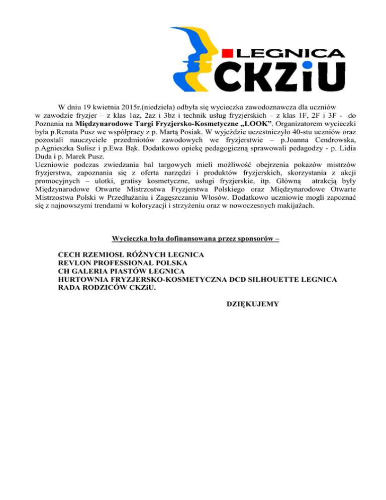 W dniu 19 kwietnia 2015r.(niedziela) odbyła się wycieczka zawodoznawcza dla uczniów w zawodzie fryzjer – z klas 1az, 2az i 3bz i technik usług fryzjerskich – z klas 1F, 2F i 3F - do Poznania na Międzynarodowe Targi Fryzjersko-Kosmetyczne „LOOK”. Organizatorem wycieczki była p.Renata Pusz we współpracy z p. Martą Posiak. W wyjeździe uczestniczyło 40-stu uczniów oraz pozostali nauczyciele przedmiotów zawodowych we fryzjerstwie – p.Joanna Cendrowska, p.Agnieszka Sulisz i p.Ewa Bąk. Dodatkowo opiekę pedagogiczną sprawowali pedagodzy - p. Lidia Duda i p. Marek Pusz. Uczniowie podczas zwiedzania hal targowych mieli moŜliwość obejrzenia pokazów mistrzów fryzjerstwa, zapoznania się z oferta narzędzi i produktów fryzjerskich, skorzystania z akcji promocyjnych – ulotki, gratisy kosmetyczne, usługi fryzjerskie, itp. Główną atrakcją były Międzynarodowe Otwarte Mistrzostwa Fryzjerstwa Polskiego oraz Międzynarodowe Otwarte Mistrzostwa Polski w PrzedłuŜaniu i Zagęszczaniu Włosów. Dodatkowo uczniowie mogli zapoznać się z najnowszymi trendami w koloryzacji i strzyŜeniu oraz w nowoczesnych makijaŜach. Wycieczka była dofinansowana przez sponsorów – CECH RZEMIOSŁ RÓśNYCH LEGNICA REVLON PROFESSIONAL POLSKA CH GALERIA PIASTÓW LEGNICA HURTOWNIA FRYZJERSKO-KOSMETYCZNA DCD SILHOUETTE LEGNICA RADA RODZICÓW CKZiU. DZIĘKUJEMY