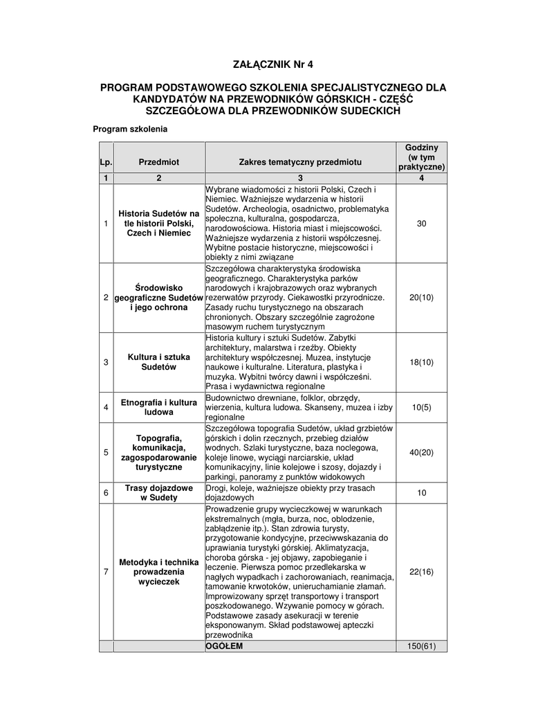 ZAŁĄCZNIK Nr 4 PROGRAM PODSTAWOWEGO SZKOLENIA SPECJALISTYCZNEGO DLA KANDYDATÓW NA PRZEWODNIKÓW GÓRSKICH - CZĘŚĆ SZCZEGÓŁOWA DLA PRZEWODNIKÓW SUDECKICH Program szkolenia Lp. Przedmiot 1 2 1 2 3 4 5 6 7 Zakres tematyczny przedmiotu 3 Wybrane wiadomości z historii Polski, Czech i Niemiec. Ważniejsze wydarzenia w historii Sudetów. Archeologia, osadnictwo, problematyka Historia Sudetów na społeczna, kulturalna, gospodarcza, tle historii Polski, narodowościowa. Historia miast i miejscowości. Czech i Niemiec Ważniejsze wydarzenia z historii współczesnej. Wybitne postacie historyczne, miejscowości i obiekty z nimi związane Szczegółowa charakterystyka środowiska geograficznego. Charakterystyka parków narodowych i krajobrazowych oraz wybranych Środowisko geograficzne Sudetów rezerwatów przyrody. Ciekawostki przyrodnicze. i jego ochrona Zasady ruchu turystycznego na obszarach chronionych. Obszary szczególnie zagrożone masowym ruchem turystycznym Historia kultury i sztuki Sudetów. Zabytki architektury, malarstwa i rzeźby. Obiekty Kultura i sztuka architektury współczesnej. Muzea, instytucje Sudetów naukowe i kulturalne. Literatura, plastyka i muzyka. Wybitni twórcy dawni i współcześni. Prasa i wydawnictwa regionalne Budownictwo drewniane, folklor, obrzędy, Etnografia i kultura wierzenia, kultura ludowa. Skanseny, muzea i izby ludowa regionalne Szczegółowa topografia Sudetów, układ grzbietów Topografia, górskich i dolin rzecznych, przebieg działów komunikacja, wodnych. Szlaki turystyczne, baza noclegowa, zagospodarowanie koleje linowe, wyciągi narciarskie, układ komunikacyjny, linie kolejowe i szosy, dojazdy i turystyczne parkingi, panoramy z punktów widokowych Trasy dojazdowe Drogi, koleje, ważniejsze obiekty przy trasach w Sudety dojazdowych Prowadzenie grupy wycieczkowej w warunkach ekstremalnych (mgła, burza, noc, oblodzenie, zabłądzenie itp.). Stan zdrowia turysty, przygotowanie kondycyjne, przeciwwskazania do uprawiania turystyki górskiej. Aklimatyzacja, choroba górska - jej objawy, zapobieganie i Metodyka i technika leczenie. Pierwsza pomoc przedlekarska w prowadzenia nagłych wypadkach i zachorowaniach, reanimacja, wycieczek tamowanie krwotoków, unieruchamianie złamań. Improwizowany sprzęt transportowy i transport poszkodowanego. Wzywanie pomocy w górach. Podstawowe zasady asekuracji w terenie eksponowanym. Skład podstawowej apteczki przewodnika OGÓŁEM Godziny (w tym praktyczne) 4 30 20(10) 18(10) 10(5) 40(20) 10 22(16) 150(61) Objaśnienia: 1. Dla przedmiotów wymienionych w lp. 1-6 tabeli obowiązują szczegółowe wiadomości o obszarze Sudetów Polskich oraz ogólne wiadomości o odpowiedniej części Sudetów Czeskich. 2. Użyte w pkt 1 określenie "odpowiednia część Sudetów Czeskich" oznacza dla obszaru zachodniego Sudetów: Góry Łużyckie, Góry Izerskie i Pasmo Jesztedu oraz Karkonosze i Pogórze Karkonoskie, Wyżynę Bromowską, Góry Orlickie, Jesioniki oraz Góry Odrzańskie.
