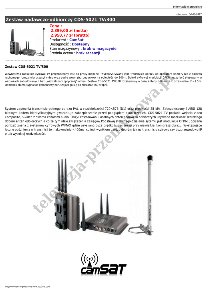 Informacje o produkcie Utworzono 04-03-2017 Zestaw nadawczo-odbiorczy CDS-5021 TV/300 Cena : 2.399,00 zł (netto) 2.950,77 zł (brutto) Producent : CamSat Dostępność : Dostępny Stan magazynowy : brak w magazynie Średnia ocena : brak recenzji Zestaw CDS-5021 TV/300 ze m ys lo w a. pl Wewnętrzna radiolinia cyfrowa TV przeznaczony jest do pracy mobilnej, wykorzystywany jako transmisja obrazu od operatora kamery lub z pojazdu ruchomego. Umożliwia przesył video oraz audio wewnątrz budynków na odległość do 300m. Dzięki cyfrowej modulacji OFDM może być stosowany w warunkach zabudowanych bez „widzialności optycznej" anten. Zestaw CDS-5021 TV/300 rozszerzony o duże anteny odbiorcze z przewodami D=1.5m. Odbiornik zbiera sygnał od kamerzysty poruszającego się po obszarze 360 stopni. te le w iz ja -p r System zapewnia transmisję pełnego obrazu PAL w rozdzielczości 720×576 (D1) oraz prędkości 25 kl/s. Zabezpieczony ( AES) 128 bitowym kodem identyfikacyjnym gwarantuje zabezpieczenie przed podglądem osób trzecich. CDS-5021 TV posiada wejścia video Composite, S-video z dwoma kanałami audio. Dzięki zastosowaniu osobnych anten nadawczo odbiorczych uzyskano możliwość szerokiego doboru anten odbiorczych a co za tym idzie zwiększenia zasięgów.Podstawą stabilnego działania sytemu jest modulacja OFDM ( opisana poniżej) znana z systemów cyfrowych WIMAX gdzie uzyskano dużą prędkość transmisji przy niewielkiej kompresji obrazu. Występujące łączne opóźnienia w transmisji to maksymalnie <400ms co jest wynikiem bardzo dobrym jak na transmisje cyfrowe czy bezprzewodowe IP o tak wysokiej rozdzielczości. Wygenerowano w programie www.oscGold.com pl a. ze m ys lo w CDS-5021 TV/300 przeznaczony jest jako nadajnik video przesyłający obraz: ● ● -p r ● od kamerzysty mobilnego poruszającego się bezprzewodowo po scenie/stadionie do wozu transmisyjnego, radiowy podgląd obrazu z kamery w trakcie nagrywania programów TV, przesył obrazu na zywo z samochodu rajdowego czy pojazdu latającego, w iz ja Uruchomienie systemu CDS-5021/300 polega wyłącznie na ukierunkowaniu anten odbiorczych i podłączeniu sygnału video i zasilania. Nie ma konieczności szukania wolnych częstotliwości czy ustawiania kanałów pracy. Urządzenie w chwili włączenia zasilania przez pierwsze 30s samo wyszukuje wolną częstotliwość na danym terenie i zapisuje dany kanał pracy na stałe. Jest to wymóg urządzeń pracujących w paśmie 5.2 GHz gdzie wyeliminowano wzajemne zakłócanie się. ❍ ❍ ❍ ❍ ● te ❍ le W podstawowym zestawie CDS-5021 TV/300 znajduje się: Nadajnik cyfrowy TV z mocowaniem do kamery typu Anton Bauer x 1 szt. Odbiornik cyfrowy wewnętrzny x 1 szt. Antena dookolna 5dbi x 6 szt. Instrukcja obsługi Deklaracja zgodności CE (opcjonalnie nadajnik może być wyposażony w uchyt oraz akumulator z mocowaniem V-lock lub Anton Bauer ) Zastosowania CDS-5021 TV/300: transmisja mobilna od operatora kamery do wozu transmisyjnego podgląd mobilnych obrazów na planach zdjęciowych i reżyserkach w telewizji kablowej oraz studiach nagrań do rzutników oraz projektorów telewizyjnych mobilne filmowanie ze scen teatralnych oraz na imprezach masowych kamery TV profesjonalnej oraz kamery przemysłowe CCTV rejestratory DVR oraz multipleksery ❍ ❍ ❍ ❍ ❍ ❍ Uwaga: Odbiornik pracuje wyłącznie z własnym nadajnikiem. Urządzenie wyszukuje wyłącznie swój nadajnik zidentyfikowany po kodzie przez co urządzenia są skutecznie zabezpieczone przed podglądem osób trzecich. Systemy wideo pracują w układzie punkt - punkt czyli: jeden zestaw CDS-5021 TV dla każdej kamery. Specyfikacja: Charakterystyka: stabilna, wysokiej jakości transmisja obrazu PAL oraz NTSC ( auto detekcja) do 4 oraz do 21 niezależnych kanałów video Informacje o produkcie te le w iz ja -p r ze m ys lo w a. pl kodowanie transmisji 128 bitowym kodem rozdzielczość 720×576 ( D1) prędkości wyświetlania 25 kl/s. modulacja OFDM ( WIMAX) wejścia video Composite oraz S-video anteny dookolne wyłapujące sygnał z różnych kierunków (możliwość rozbudowy do 800m) zasięg wewnątrz pomieszczeń lub w terenie zabudowanym do 300m - CDS-5021 TV/300 możliwa retransmisja oraz przedłużenie zasięgu sygnału transmisja całkowicie wolna od zakłóceń, sieci internetowych 802.11, Bluetooth, telefonii radiowej itp. transmisja z opóźnieniem do 400ms bardzo prosty w instalacji i w pełni bezobsługowy mocowanie nadajnika przystosowane do kamery z uchwytem typu Anton Bauer. Dodatkowo nadajnik może zostać wyposażony w mocowanie akumulatorów oraz akumulatory z uchwytem Anton Bauer lub V-lock ( Sony). Możliwość zainstalowania bezprzewodowego modułu telemetrycznego do sterowania obiektywami ( RS232, RS485, prędkości: 1200, 2400, 4800, 9600bps ) Wygenerowano w programie www.oscGold.com