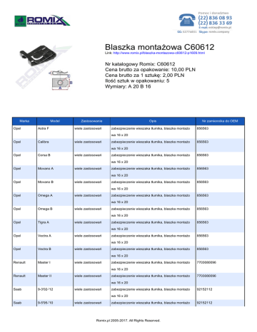 Blaszka montażowa C60612 Link: http://www.romix.pl/blaszka-montazowa-c60612-p1609.html Nr katalogowy Romix: C60612 Cena brutto za opakowanie: 10,00 PLN Cena brutto za 1 sztukę: 2,00 PLN Ilość sztuk w opakowaniu: 5 Wymiary: A 20 B 16 Marka Opel Model Astra F Zastosowanie wiele zastosowań Opis zabezpieczenie wieszaka tłumika, blaszka montażo Nr zamiennika do OEM 856563 wa 16 x 20 Opel Calibra wiele zastosowań zabezpieczenie wieszaka tłumika, blaszka montażo 856563 wa 16 x 20 Opel Corsa B wiele zastosowań zabezpieczenie wieszaka tłumika, blaszka montażo 856563 wa 16 x 20 Opel Movano A wiele zastosowań zabezpieczenie wieszaka tłumika, blaszka montażo 856563 wa 16 x 20 Opel Movano B wiele zastosowań zabezpieczenie wieszaka tłumika, blaszka montażo 856563 wa 16 x 20 Opel Omega A wiele zastosowań zabezpieczenie wieszaka tłumika, blaszka montażo 856563 wa 16 x 20 Opel Omega B wiele zastosowań zabezpieczenie wieszaka tłumika, blaszka montażo 856563 wa 16 x 20 Opel Tigra A wiele zastosowań zabezpieczenie wieszaka tłumika, blaszka montażo 856563 wa 16 x 20 Opel Vectra A wiele zastosowań zabezpieczenie wieszaka tłumika, blaszka montażo 856563 wa 16 x 20 Opel Vectra B wiele zastosowań zabezpieczenie wieszaka tłumika, blaszka montażo 856563 wa 16 x 20 Renault Master I wiele zastosowań zabezpieczenie wieszaka tłumika, blaszka montażo 7703080096 wa 16 x 20 Renault Master II wiele zastosowań zabezpieczenie wieszaka tłumika, blaszka montażo 7703080096 wa 16 x 20 Saab 9-3'02-'12 wiele zastosowań zabezpieczenie wieszaka tłumika, blaszka montażo 92152112 wa 16 x 20 Saab 9-5'95-'10 wiele zastosowań zabezpieczenie wieszaka tłumika, blaszka montażo Romix.pl 2005-2017. All Rights Reserved. 92152112 wa 16 x 20 Saab 900'94-'98 wiele zastosowań zabezpieczenie wieszaka tłumika, blaszka montażo wa 16 x 20 Wszystkie ma wiele zastosowań blaszka montażowa 16 x 20 rki Romix.pl 2005-2017. All Rights Reserved. 92152112