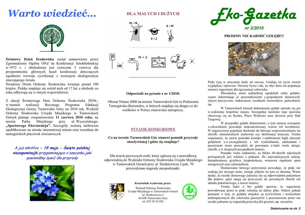 Warto wiedzieć… DLA MAŁYCH I DUśYCH Eko-Gazetka nr 2/2010 PROSIMY NIE KARMIĆ GOŁĘBI!!! Światowy Dzień Środowiska został ustanowiony przez Zgromadzenie Ogólne ONZ na Konferencji Sztokholmskiej w 1972 r. i obchodzony jest corocznie 5 czerwca dla przypomnienia głównych haseł konferencji dotyczących zgodności rozwoju cywilizacji z rozwojem ekologicznym otaczającego świata. Światowy Dzień Ochrony Środowiska świętuje ponad 100 krajów. Polska znajduje się wśród nich od 17 lat, a obchody co roku odbywają się w innym województwie. Z okazji Światowego Dnia Ochrony Środowiska 2010r., w ramach realizacji Rocznego Programu Edukacji Ekologicznej Gminy Tarnowskie Góry na 2010 rok, Wydział Ochrony Środowiska Urzędu Miejskiego w Tarnowskich Górach planuje zorganizowanie 11 czerwca 2010 roku, na terenie Parku Miejskiego przy ul. Wyszyńskiego, „Sportowego Eko-turnieju”. Szczegóły zostaną niebawem opublikowane na stronie internetowej miasta oraz rozesłane do tarnogórskich placówek oświatowych. Odpowiedź na pytanie z nr 1/2010: Obszar Natura 2000 na terenie Tarnowskich Gór to Podziemia Tarnogórsko-Bytomskie, w których znajduje się drugie co do wielkości w Polsce zimowisko nietoperzy. PYTANIE KONKURSOWE Co na terenie Tarnowskich Gór stanowi pomnik przyrody nieoŜywionej i gdzie się znajduje? A juŜ wkrótce - 15 maja - Święto polskiej niezapominajki przypominające o szacunku jaki powinniśmy Ŝywić dla przyrody Dla trzech pierwszych osób, które zgłoszą się z prawidłową odpowiedzią do Wydziału Ochrony Środowiska Urzędu Miejskiego w Tarnowskich Górach przy ul. Sienkiewicza 2 pok. 70 przewidziano nagrody niespodzianki. Kwartalnik wydawany przez: Wydział Ochrony Środowiska Urzędu Miejskiego w Tarnowskich Górach ul. Sienkiewicza 2 42-600 Tarnowskie Góry tel. 032 39 33 692 Ptaki Ŝyją w otoczeniu ludzi od zawsze. Umilają im Ŝycie swoim wyglądem i śpiewem. Niestety bywa i tak, Ŝe zbyt duŜa ich populacja stanowi zagroŜenie dla egzystencji człowieka. Mieszkańcy miast najbardziej upodobali sobie gołębie, często dokarmiając je pozostałościami z gospodarstw domowych: starym pieczywem, makaronem, resztkami ziemniaków, paluszkami, itp. W Tarnowskich Górach dokarmianie gołębi wpisało się juŜ w codzienny krajobraz miasta. Szczególne nasilenie tego zjawiska obserwuje się na Rynku, Placu Wolności oraz skwerze przy Hali Targowej. W przypadku gołębi dokarmianie, a tym samym oswajanie z człowiekiem powoduje niekontrolowany wzrost ich liczebności. W zagęszczonej populacji dochodzi do łatwego rozprzestrzeniania się chorób, nienaturalnych zachowań czy deformacji kończyn. Trzeba wspomnieć, Ŝe nawet pośredni kontakt z osłabionymi bądź chorymi gołębiami a w szczególności z ich wydzielinami, odchodami i pasoŜytami moŜe prowadzić do powstania u ludzi wielu alergii, chorób, a w skrajnych przypadkach śmierci. Ponadto warto nadmienić, Ŝe blisko 60 chorób zakaźnych powiązanych jest właśnie z ptakami. Do najwaŜniejszych naleŜą: histoplazmoza, grzybica, kryptokokoza, wirusowe zapalenie opon mózgowych oraz salmonelloza. Dostarczanie łatwego poŜywienia powoduje, Ŝe ptaki nie szukają juŜ niczego same, Ŝerując jedynie na tym co dostaną. Warto dodać, Ŝe resztki domowego jedzenia nie są odpowiednim pokarmem dla ptaków, gdyŜ mogą się przyczynić do powaŜnych chorób ich układu pokarmowego, a nawet śmierci. Troska ludzi o byt gołębi sprawia, Ŝe zagroŜenia powodowane przez te ptaki schodzą na dalszy plan. NaleŜy jednak pamiętać o tym, Ŝe gołębie miejskie są Ŝywicielami i nosicielami niebezpiecznych dla człowieka pasoŜytów a pozostawione przez nie resztki jedzenia są wspaniałą poŜywką dla gryzoni, np. szczurów. Dokończenie na str. 2 Dokończenie ze str. 1 PROSIMY NIE KARMIĆ GOŁĘBI!!! Kolejny aspekt tej sprawy dotyczy miejsc, w których występuje dokarmianie gołębi. Nie trzeba bowiem nikogo przekonywać, Ŝe zbyt duŜa liczba tych wszędobylskich ptaków, to obniŜenie estetyki, jak równieŜ powaŜne straty ekonomiczne, będące następstwem konieczności czyszczenia/odnawiania elewacji zarówno budynków uŜyteczności publicznej, jak i zabytków, czy obiektów sakralnych oraz oczyszczania miasta. Aktualnie stanowi to powaŜny problem wielu miast. O ile w stosunku do ptaków nie moŜna wyciągnąć Ŝadnych konsekwencji, to pod adresem ludzi moŜna kierować prośby i stosować kary. Rozrzucanie jakichkolwiek odpadów, w tym jedzenia, w miejscach publicznych jest zanieczyszczaniem środowiska a zatem stanowi łamanie przepisów porządkowych. Podstawą do podejmowania interwencji przez odpowiednie słuŜby jest kodeks wykroczeń, w myśl którego, zgodnie z art. 145 zakazuje się zaśmiecania i zanieczyszczania terenów publicznych pod karą nagany lub grzywny. Apelujemy zatem o rozwagę i powstrzymywanie się od dokarmiania gołębi, mając na uwadze najwaŜniejsze dobro, tzn. nasze zdrowie, a takŜe czysty wygląd naszego miasta oraz uchronienie tarnogórskich zabytków od zniszczenia. Laureaci konkursu na hasło/slogan reklamowy Programu Edukacji Ekologicznej Gminy Tarnowskie Góry Uczymy kochać świat! Zwycięzcą konkursu został: Marcin SEDLACZEK z VI klasy Szkoły Podstawowej nr 3. ZBIÓRKA ODPADÓW KOMUNALNYCH NIEBEZPIECZNYCH Lokalizacja punktu w dzielnicy Lasowice plac przy ul. Siewierskiej Sowice skwer przy ul. 22 stycznia, obok KrzyŜa Bobrowniki Śl. – Piekary Rudne skwer przy ul. Głównej, obok Poczty Osada Jana parking u zbiegu Al. Kwiatów i ul. Fiołków, obok przystanku autobusowego linii Nr 1 Strzybnica parking przy ul. Strzybnickiej, pomiędzy śłobkiem a Pocztą Pniowiec skwer u zbiegu ul. OkręŜnej i ul. Jagodowej Stare Tarnowice u zbiegu ul. Niedziałkowskiego i ul. Repeckiej Repty Śląskie parking przy ul. Witosa 61, obok Ośrodka Zdrowia Opatowice plac przy ul. Pastuszki, obok Świetlicy Rybna na terenie Zespołu Szkolno – Przedszkoln