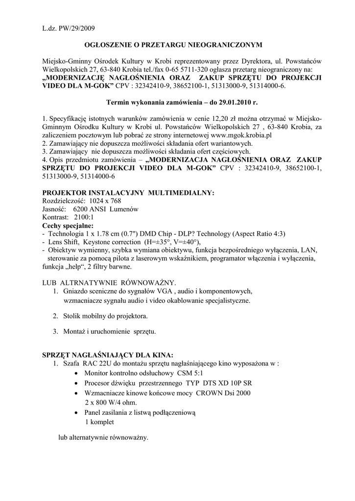 L.dz. PW/29/2009 OGŁOSZENIE O PRZETARGU NIEOGRANICZONYM Miejsko-Gminny Ośrodek Kultury w Krobi reprezentowany przez Dyrektora, ul. Powstańców Wielkopolskich 27, 63-840 Krobia tel./fax 0-65 5711-320 ogłasza przetarg nieograniczony na: „MODERNIZACJĘ NAGŁOŚNIENIA ORAZ ZAKUP SPRZĘTU DO PROJEKCJI VIDEO DLA M-GOK” CPV : 32342410-9, 38652100-1, 51313000-9, 51314000-6. Termin wykonania zamówienia – do 29.01.2010 r. 1. Specyfikację istotnych warunków zamówienia w cenie 12,20 zł można otrzymać w MiejskoGminnym Ośrodku Kultury w Krobi ul. Powstańców Wielkopolskich 27 , 63-840 Krobia, za zaliczeniem pocztowym lub pobrać ze strony internetowej www.mgok.krobia.pl 2. Zamawiający nie dopuszcza możliwości składania ofert wariantowych. 3. Zamawiający nie dopuszcza możliwości składania ofert częściowych. 4. Opis przedmiotu zamówienia – „MODERNIZACJA NAGŁOŚNIENIA ORAZ ZAKUP SPRZĘTU DO PROJEKCJI VIDEO DLA M-GOK” CPV : 32342410-9, 38652100-1, 51313000-9, 51314000-6 PROJEKTOR INSTALACYJNY MULTIMEDIALNY: Rozdzielczość: 1024 x 768 Jasność: 6200 ANSI Lumenów Kontrast: 2100:1 Cechy specjalne: - Technologia 1 x 1.78 cm (0.7") DMD Chip - DLP? Technology (Aspect Ratio 4:3) - Lens Shift, Keystone correction (H=±35°, V=±40°), - Obiektyw wymienny, szybka wymiana obiektywu, funkcja bezpośredniego wyłączenia, LAN, sterowanie za pomocą pilota z laserowym wskaźnikiem, programator włączenia i wyłączenia, funkcja „help“, 2 filtry barwne. LUB ALTRNATYWNIE RÓWNOWAŻNY. 1. Gniazdo sceniczne do sygnałów VGA , audio i komponentowych, wzmacniacze sygnału audio i video okablowanie specjalistyczne. 2. Stolik mobilny do projektora. 3. Montaż i uruchomienie sprzętu. SPRZĘT NAGŁAŚNIAJĄCY DLA KINA: 1. Szafa RAC 22U do montażu sprzętu nagłaśniającego kino wyposażona w : Monitor kontrolno odsłuchowy CSM 5:1 Procesor dźwięku przestrzennego TYP DTS XD 10P SR Wzmacniacze kinowe końcowe mocy CROWN Dsi 2000 2 x 800 W/4 ohm. Panel zasilania z listwą podłączeniową 1 komplet lub alternatywnie równoważny. 2. Głośnik zaekranowy dwudrożny, Profesional Cinema System PCS FS-115 600/1200 W 35Hz – 20 kHz 99 db SPL 3 sztuki lub alternatywnie równoważny. 3. Głośnik subbasowy Profesional Cinema System Sub 118 600/1200 W 35 Hz – 500 Hz 100 db SPL 2 sztuki. lub alternatywnie równoważny. 4. Głośniki efektowe Cinema Surroud CP 10/8 150/300 W 50 Hz – 20 kHz 96 db SPL 12 sztuk. lub alternatywnie równoważny. 5. Stereofoniczny układ DOLBY odczytu dźwięku z taśmy filmowej 35mm dla projektora filmowego TYP AP 62x 2 komplety. 6. Montaż i uruchomienie sprzętu nagłaśniającego, okablowanie techniczne dźwiękowe sali kinowej i kabiny projekcyjnej. Wykonawca zobowiązany jest do dostarczenia sprzętu posiadającego deklaracje zgodności i certyfikaty bezpieczeństwa. 5. W przetargu mogą wziąć udział wykonawcy, którzy spełniają warunki określone przepisami art. 22 ust. 1 ustawy z dnia 29 stycznia 2004 r. Prawo zamówień publicznych oraz spełniający wymogi określone w specyfikacji istotnych warunków zamówienia. Informacja o oświadczeniach lub dokumentach, jakie mają dostarczyć wykonawcy w celu potwierdzenia spełniania warunków udziału w postępowaniu: - oświadczenie o spełnianiu wymogów określonych w art. 22 ust. 1 ustawy Prawo zamówień publicznych lub oświadczenie o spełnianiu wymogów określonych w art. 22 ust. 1 ustawy Prawo zamówień publicznych (oświadczenie dot. pisemnego zobowiązania innych podmiotów do udostępnienia potencjału technicznego i osób zdolnych do wykonania zamówienia) - polisa, a w przypadku jej braku innego dokumentu potwierdzającego, że wykonawca jest ubezpieczony od odpowiedzialności cywilnej w zakresie prowadzonej działalności na kwotę 150.000,00 zł. - aktualny odpis z właściwego rejestru albo aktualne zaświadczenie o wpisie do ewidencji działalności gospodarczej, jeżeli odrębne przepisy wymagają wpisu do rejestru lub zgłoszenia do ewidencji działalności gospodarczej Ocena spełniania warunków wymaganych od wykonawców zostanie dokonana na podstawie analizy dokumentów, oświadczeń, które zamawiający określił w siwz. 6. Wadium nie jest wymagane. 7. Kryteria oceny ofert i ich znaczenie cena znaczenie – 100 % 8. Oferty należy składać w siedzibie zamawiającego (Miejsko-Gminny Ośrodek Kultury w Krobi ul. Powstańców Wielkopolskich 27, 63-840 Krobi) lub przesłać na adres zamawiającego: Miejsko-Gminny Ośrodek Kultury w Krobi, ul. Powstańców Wielkopolskich 27, 63-840 Krobia. Termin składania ofert upływa dnia 04.11.2009 r. o godzinie 1545. 9. Otwarcie ofert nastąpi dnia 04.11.2009 r. o godzinie 1600 w siedzibie zamawiającego (Miejsko-Gminny Ośrodek Kultury w Krobi ul. Powstańców Wielkopolskich 27, 63-840 Krobi). 10. Termin związania ofertą – 30 dni. 11. Nie planuje się zawarcia umowy ramowej. 12. Nie planuje się ustanowienia dynamicznego systemu zakupów. 13. Nie przewiduje się wyboru najkorzystniejszej oferty z zastosowaniem aukcji elektronicznej. 14. Zamawiający nie przewiduje udzielania zamówień uzupełniających, o których mowa w art. 67 ust. 1 pkt 7 lub art. 134 ust. 6 pkt 4. 15. Zakazuje się zmian postanowień zawartej umowy w stosunku do treści oferty, na podstawie której dokonano wyboru wykonawcy, chyba że konieczność wprowadzenia takich zmian wynika z okoliczności, których nie można było przewidzieć w chwili zawarcia umowy, lub zmiany te są korzystne dla zamawiającego. 16. Osobą uprawnioną do kontaktowania się z wykonawcami i udzielania wyjaśnień dotyczących postępowania jest JANUSZ TOMYŚLAK, stanowisko DYREKTOR. Informacje i wyjaśnienia uzyskać można od poniedziałku do piątku w siedzibie zamawiającego w godzinach 800 -1500, a także telefonicznie pod nr 0-65 5711-320. 17.Ogłoszenie zostało zamieszczone w Biuletynie Zamówień Publicznych – 20.10.2009 r. Dyrektor Miejsko –Gminnego Ośrodka Kultury Janusz 