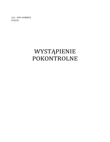 LLU – 4101-14-09/2012 P/12/137 WYSTĄPIENIE POKONTROLNE I. Dane identyfikacyjne kontroli Numer i tytuł kontroli Jednostka przeprowadzająca kontrolę P/12/137 – Realizacja przepisów ustawy o ochronie zdrowia przed następstwami uŜywania tytoniu i wyrobów tytoniowych NajwyŜsza Izba Kontroli Delegatura w Lublinie Kontroler Jerzy Bielak, główny specjalista kontroli państwowej, upowaŜnienie do kontroli nr 83651 z dnia 25.09.2012 r. (dowód: akta kontroli str. 1-2) Jednostka kontrolowana Generalna Dyrekcja Dróg Krajowych i Autostrad Oddział w Lublinie (GDDKiA, Oddział) Kierownik jednostki kontrolowanej Marian Nagórny, Dyrektor Oddziału Generalnej Dyrekcji Dróg Krajowych i Autostrad w Lublinie (dowód: akta kontroli str. 3) Ocena ogólna Uzasadnienie oceny ogólnej II. Ocena kontrolowanej działalności NajwyŜsza Izba Kontroli ocenia pozytywnie1 działalność kontrolowanej jednostki w zbadanym zakresie. Podstawą pozytywnej oceny było: - oznakowanie pomieszczeń Oddziału zgodnie z art. 5 ust. 1a ustawy z dnia 9 listopada 1995 r. o ochronie zdrowia przed następstwami uŜywania tytoniu i wyrobów tytoniowych2, zwanej dalej „ustawą antynikotynową”, - przestrzeganie zakazu palenia na terenie jednostki, wynikającego z art. 5 ust. 1 ustawy antynikotynowej. 1 NajwyŜsza Izba Kontroli stosuje 3-stopniową skalę ocen: pozytywna, pozytywna mimo stwierdzonych nieprawidłowości, negatywna. JeŜeli sformułowanie oceny ogólnej według proponowanej skali byłoby nadmiernie utrudnione, albo taka ocena nie dawałaby prawdziwego obrazu funkcjonowania kontrolowanej jednostki w zakresie objętym kontrolą, stosuje się ocenę opisową, bądź uzupełnia ocenę ogólną o dodatkowe objaśnienie 2 Dz. U. z 1996 r., Nr 10, poz.55 ze zm. 2 III. Opis ustalonego stanu faktycznego 1 Przestrzeganie zakazu palenia w obiektach i środkach transportu Oznakowanie obiektów i środków transportu Opis stanu faktycznego GDDKiA Oddział w Lublinie zarządza pięciokondygnacyjnym budynkiem połoŜonym przy ul. Ogrodowej 21, w którym znajduje się 71 pomieszczeń. Przeprowadzone w dniu 26.09.2012 r. oględziny wszystkich (71) pomieszczeń wykazały, Ŝe w budynku Oddziału znajdowały się oznaczenia słowne i graficzne informujące o zakazie palenia wyrobów tytoniowych. Oznaczenia były widoczne dla osób, które wchodzą do budynku i poszczególnych pomieszczeń. Oznaczenia o zakazie palenia wyrobów tytoniowych umieszczono na drzwiach wejściowych do budynku oraz na kaŜdej kondygnacji na drzwiach wejściowych na korytarz z klatki schodowej (2 szt.) Ponadto dokonano oględzin pięciu samochodów słuŜbowych: Renault Megane, Renault Fluence, Kia Picanto, Seat Alhambra, Daewoo Leganza, w których umieszczono oznaczenia graficzne i słowne „zakaz palenia”. (dowód: akta kontroli str. 6-12, 13-15) Spełnianie wymogów ustawowych przez palarnie wyznaczone na terenie obiektów Opis stanu faktycznego Pracownicy Oddziału od czerwca 2011 r. korzystają z dwóch kabin dla palaczy SMOKEBOX 4 zamontowanych na trzeciej i czwartej kondygnacji budynku Oddziału. Palarnie zostały wyznaczone zgodnie z art. 5a ust. 3 ww. ustawy z dnia 9 listopada 1995 r. Kabiny te są urządzeniami wolnostojącymi, oznakowanymi napisem „Tu wolno palić”, wyposaŜonymi w system filtracji, czujnik ruchu i czujnik dymu. Wykonane z przezroczystego szkła, bezpiecznego i hartowanego i posiadają certyfikat CE. Zamontowane w kabinie filtry były czyste i nadawały się do eksploatacji. (dowód: akta kontroli str. 13-15, 16-18) Przestrzeganie zakazu palenia na terenie jednostki Opis stanu faktycznego W czasie przeprowadzonych oględzin pomieszczeń Oddziału stwierdzono, Ŝe przestrzegano zakazu palenia określonego w przepisach art. 5 ust. 1 ustawy antynikotynowej. (dowód: akta kontroli str. 13-15) Obowiązki wynikające z ustawy antynikotynowej w świetle regulaminów obowiązujących w jednostce Opis stanu faktycznego Obowiązujące w jednostce w latach 2010-2012 Regulaminy Organizacyjne GDDKiA Oddział w Lublinie nie określały obowiązków i zakazów, o których mowa w ustawie antynikotynowej. (dowód: akta kontroli str. 19-28, 31) 3 W § 8 Regulaminu Pracy GDDKiA Oddział w Lublinie zapisano, Ŝe w Oddziale obowiązuje zakaz palenia tytoniu w pomieszczeniach zakładu pracy, z wyjątkiem miejsc wydzielonych. Pracownicy zostali zobowiązani (§ 7 ust. 1 pkt 4 i 5) do przestrzegania regulaminu pracy oraz przestrzegania przepisów i zasad bezpieczeństwa i higieny pracy (bhp). Za nieprzestrzeganie przez pracownika ustalonego porządku, regulaminu pracy, przepisów bhp pracodawca moŜe zastosować wobec pracownika karę upomnienia lub karę nagany (§ 47). (dowód: akta kontroli str. 29-36) Skargi Opis stanu faktycznego i wnioski dotyczące antynikotynowej realizacji przepisów ustawy W badanym okresie (do dnia 28.09.2012 r.) wpłynęło ogółem 80 skarg i 51 wniosków. ZłoŜone skargi i wnioski nie dotyczyły realizacji przepisów ustawy antynikotynowej. (dowód: akta kontroli str. 37) Problemy w realizacji ustawy antynikotynowej Władysław Rawski – zastępca Dyrektora Oddziału GDDKiA w Lublinie wyjaśnił: „Realizacja przepisów ustawy z dnia 9 listopada 1995 r. o ochronie zdrowia przed następstwami uŜywania tytoniu i wyrobów tytoniowych, w brzmieniu obowiązującym od 15 listopada 2010 r., nie stwarza problemów. […]. Z uwagi na fakt, Ŝe w tut. Oddziale nie występują problemy w realizacji przepisów cytowanej wyŜej ustawy, tut. Oddział nie widzi konieczności dokonywania zmian prawnych i organizacyjnych.” (dowód: akta kontroli str. 38-39) Kontrole przestrzegania przepisów ustawy antynikotynowej Opis stanu faktycznego W badanym okresie GDDKiA Oddział w Lublinie nie była kontrolowana przez inne organy, w tym przez Państwową Inspekcję Sanitarną w zakresie przestrzegania przepisów ustawy antynikotynowej. Nie prowadzono równieŜ kontroli wewnętrznych w tym zakresie. (dowód: akta kontroli 
