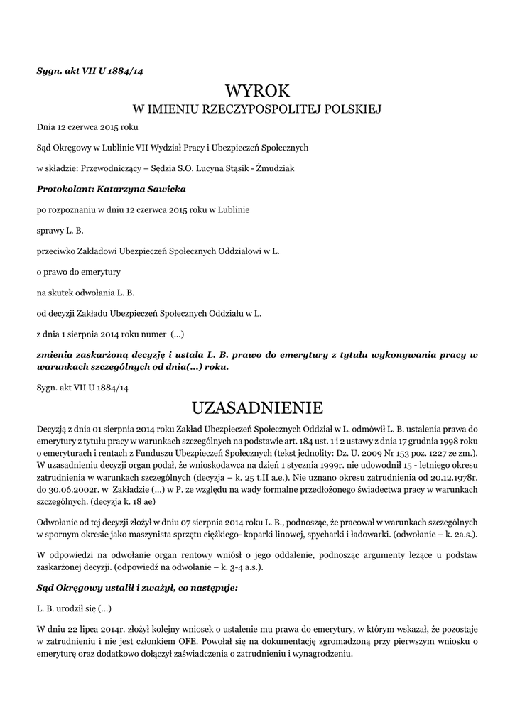 Sygn. akt VII U 1884/14 WYROK W IMIENIU RZECZYPOSPOLITEJ POLSKIEJ Dnia 12 czerwca 2015 roku Sąd Okręgowy w Lublinie VII Wydział Pracy i Ubezpieczeń Społecznych w składzie: Przewodniczący – Sędzia S.O. Lucyna Stąsik - Żmudziak Protokolant: Katarzyna Sawicka po rozpoznaniu w dniu 12 czerwca 2015 roku w Lublinie sprawy L. B. przeciwko Zakładowi Ubezpieczeń Społecznych Oddziałowi w L. o prawo do emerytury na skutek odwołania L. B. od decyzji Zakładu Ubezpieczeń Społecznych Oddziału w L. z dnia 1 sierpnia 2014 roku numer (...) zmienia zaskarżoną decyzję i ustala L. B. prawo do emerytury z tytułu wykonywania pracy w warunkach szczególnych od dnia(...) roku. Sygn. akt VII U 1884/14 UZASADNIENIE Decyzją z dnia 01 sierpnia 2014 roku Zakład Ubezpieczeń Społecznych Oddział w L. odmówił L. B. ustalenia prawa do emerytury z tytułu pracy w warunkach szczególnych na podstawie art. 184 ust. 1 i 2 ustawy z dnia 17 grudnia 1998 roku o emeryturach i rentach z Funduszu Ubezpieczeń Społecznych (tekst jednolity: Dz. U. 2009 Nr 153 poz. 1227 ze zm.). W uzasadnieniu decyzji organ podał, że wnioskodawca na dzień 1 stycznia 1999r. nie udowodnił 15 - letniego okresu zatrudnienia w warunkach szczególnych (decyzja – k. 25 t.II a.e.). Nie uznano okresu zatrudnienia od 20.12.1978r. do 30.06.2002r. w Zakładzie (...) w P. ze względu na wady formalne przedłożonego świadectwa pracy w warunkach szczególnych. (decyzja k. 18 ae) Odwołanie od tej decyzji złożył w dniu 07 sierpnia 2014 roku L. B., podnosząc, że pracował w warunkach szczególnych w spornym okresie jako maszynista sprzętu ciężkiego- koparki linowej, spycharki i ładowarki. (odwołanie – k. 2a.s.). W odpowiedzi na odwołanie organ rentowy wniósł o jego oddalenie, podnosząc argumenty leżące u podstaw zaskarżonej decyzji. (odpowiedź na odwołanie – k. 3-4 a.s.). Sąd Okręgowy ustalił i zważył, co następuje: L. B. urodził się (...) W dniu 22 lipca 2014r. złożył kolejny wniosek o ustalenie mu prawa do emerytury, w którym wskazał, że pozostaje w zatrudnieniu i nie jest członkiem OFE. Powołał się na dokumentację zgromadzoną przy pierwszym wniosku o emeryturę oraz dodatkowo dołączył zaświadczenia o zatrudnieniu i wynagrodzeniu. L. B. ubiegał się o emeryturę już w 2013 roku, kiedy nie miął jeszcze ukończonych 60 lat. Wtedy składając wniosek o ustalenie prawa dołączył do niego m.in. 2 świadectwa prac w szczególnych warunkach wydane przez Zakład (...) w P. w likwidacji, z których wynikało, że był zatrudniony w tym przedsiębiorstwie od 20.12.1978r. do 31.12.1990r. i od 01.01.1991r. do30.06.2002r. i w okresach tych stale i w pełnym wymiarze wykonywał prace w warunkach szczególnych maszynisty ładowarki określone w wykazie A, dziale V, poz. 3 pkt 2 stanowiącym załącznik nr 1 do Zarządzenia nr 9 Ministra Kierownika Urzędu Ochrony Środowiska i Gospodarki Wodnej. (k. 5-6ae t.I). ZUS rozpoznając wniosek decyzjami z dnia 15.07.2013r. i 24.07.2013r. odmówił wnioskodawcy prawa do emerytury nie uznając pracy w warunkach szczególnych ze względu na wady formalne przedłożonych świadectw oraz nieukończenie przez wnioskodawcę 60 lat. W związku ze złożonym odwołaniem Sąd Okręgowy w Lublinie w sprawie VII U 2052/13 przeprowadził postępowanie dowodowe, m.in. przesłuchując świadków, jednakże w dniu 21.03.2014r. oddalił odwołanie. Uzasadnienie w sprawie nie zostało sporządzone, jednakże w dacie wydania wyroku wnioskodawca nadal nie spełnił podstawowej przesłanki do ustalenia prawa, mianowicie nie ukończył 60 lat. (akta VII U 2052/13) Obecnie wnioskodawca nadal pracuje, nie rozwiązał stosunku pracy w związku z kolejnym wnioskiem o emeryturę. W oparciu o zgromadzone dokumenty organ rentowy uwzględnił wnioskodawcy na dzień 1 stycznia 1999r. łączny staż ubezpieczeniowy w wymiarze 25 lat, 9 miesięcy i 17 dni okresów składkowych i nieskładkowych i nie zaliczył żadnych okresów pracy w warunkach szczególnych. Nadal nie uznał przedłożonych świadectw wykonywania pracy w warunkach szczególnych ponieważ w świadectwach nie określono rodzaju pracy zgodnie z załącznikiem do rozporządzenia RM z 1983r., nie wskazano również wykazu, działu, pozycji tego rozporządzenia oraz charakter pracy nie odpowiada ściśle nazwie wymienionej w zarządzeniu. ZUS stwierdził, że skarżący nie spełnia warunku 15-letniego zatrudnienia w warunkach szczególnych. Na okoliczność pracy skarżącego w szczególnych warunkach Sąd dopuścił dowód z akt osobowych z okresu zatrudnienia wnioskodawcy w Zakładzie (...) w P. (k. 22as), akt sprawy VII U 2052/13, zeznań świadków R. K. i J. R. (1) oraz zeznań wnioskodawcy. L. B. został zatrudniony w Zakładzie (...) w P. (noszącym wówczas nazwę Przedsiębiorstwa Budownictwa (...)) w okresie od 11.10.1975r. do 05.06.1976r. na stanowisku ślusarza. Następnie po zdobyciu w 1977 i 1978r. uprawnień maszynisty sprzętu ciężkiego na koparki jednonaczyniowe oraz spycharki w dniu 20 grudnia 1978r. po raz drugi podjął zatrudnienie w tym przedsiębiorstwie na stanowisku maszynisty koparki jednonaczyniowej, początkowo na 2 tygodniowy okres próbny a następnie na czas nieokreślony. Do przedsiębiorstwa tego przeszedł z Przedsiębiorstwa (...) w L. gdzie wnioskodawca w okresie od 01.01.1977r. do 16.12.1978r. pracował jako maszynista koparki. (akta osobowe) Przedsiębiorstwo Budownictwa (...) w P. zajmowało się tzw. regulacją Wisły, tzn. przywożono kamień na barkach i promach a operatorzy sprzętu ciężkiego koparkami wyładowywali go i budowali budowy rzeczne typu tamy, port jachtowy na Wiśle, zabezpieczali skarpy nad rzeką. Praca wnioskodawcy na stanowisku operatora sprzętu ciężkiego - maszynisty koparki polegała na kierowaniu koparkami różnego typu. Do ich obsługi potrzebne są specjalne uprawnienia maszynisty ciężkich maszyn budowlanych i drogowych. Wnioskodawca posiada