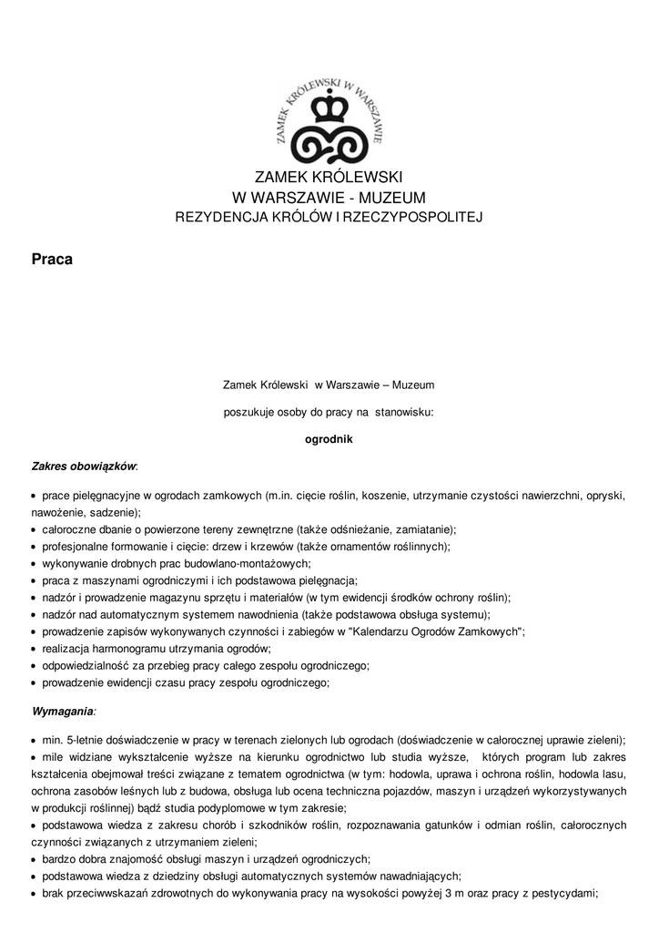 ZAMEK KRÓLEWSKI W WARSZAWIE - MUZEUM REZYDENCJA KRÓLÓW I RZECZYPOSPOLITEJ Praca Zamek Królewski w Warszawie – Muzeum poszukuje osoby do pracy na stanowisku: ogrodnik Zakres obowiązków: prace pielęgnacyjne w ogrodach zamkowych (m.in. cięcie roślin, koszenie, utrzymanie czystości nawierzchni, opryski, nawożenie, sadzenie); całoroczne dbanie o powierzone tereny zewnętrzne (także odśnieżanie, zamiatanie); profesjonalne formowanie i cięcie: drzew i krzewów (także ornamentów roślinnych); wykonywanie drobnych prac budowlano-montażowych; praca z maszynami ogrodniczymi i ich podstawowa pielęgnacja; nadzór i prowadzenie magazynu sprzętu i materiałów (w tym ewidencji środków ochrony roślin); nadzór nad automatycznym systemem nawodnienia (także podstawowa obsługa systemu); prowadzenie zapisów wykonywanych czynności i zabiegów w "Kalendarzu Ogrodów Zamkowych"; realizacja harmonogramu utrzymania ogrodów; odpowiedzialność za przebieg pracy całego zespołu ogrodniczego; prowadzenie ewidencji czasu pracy zespołu ogrodniczego; Wymagania: min. 5-letnie doświadczenie w pracy w terenach zielonych lub ogrodach (doświadczenie w całorocznej uprawie zieleni); mile widziane wykształcenie wyższe na kierunku ogrodnictwo lub studia wyższe, których program lub zakres kształcenia obejmował treści związane z tematem ogrodnictwa (w tym: hodowla, uprawa i ochrona roślin, hodowla lasu, ochrona zasobów leśnych lub z budowa, obsługa lub ocena techniczna pojazdów, maszyn i urządzeń wykorzystywanych w produkcji roślinnej) bądź studia podyplomowe w tym zakresie; podstawowa wiedza z zakresu chorób i szkodników roślin, rozpoznawania gatunków i odmian roślin, całorocznych czynności związanych z utrzymaniem zieleni; bardzo dobra znajomość obsługi maszyn i urządzeń ogrodniczych; podstawowa wiedza z dziedziny obsługi automatycznych systemów nawadniających; brak przeciwwskazań zdrowotnych do wykonywania pracy na wysokości powyżej 3 m oraz pracy z pestycydami; zdolności manualne przy formowaniu roślin oraz komponowaniu nasadzeń kwiatowych; samodzielność w organizacji zadań; umiejętność pracy w zespole; prawo jazdy kat. B. Forma zatrudnienia: umowa o pracę – pełny etat; miejsce pracy: Warszawa; Osoby zainteresowane prosimy o przesyłanie aplikacji (CV + list motywacyjny) [email protected] z dopiskiem „ogrodnik” do dnia 03/03/2017 r. na adres lub na adres: Zamek Królewski w Warszawie – Muzeum Dział Spraw Pracowniczych i Organizacyjnych Plac Zamkowy 4 00-277 Warszawa Uprzejmie informujemy, że skontaktujemy się tylko z wybranymi kandydatami. Prosimy o zawarcie w CV klauzuli: Wyrażam zgodę na przetwarzanie danych osobowych zawartych w mojej ofercie pracy dla potrzeb niezbędnych do realizacji procesu rekrutacji prowadzonego przez Zamek Królewski w Warszawie Muzeum z siedzibą w Warszawie zgodnie z ustawą z dnia 29 sierpnia 1997 r. o ochronie danych osobowych (tj. Dz. U. z 2014 r. poz. 1182, 1662). Informujemy, że Administratorem danych jest Zamek Królewski w Warszawie - Muzeum z siedzibą w Warszawie, Pl. Zamkowy 4. Dane zbierane są dla potrzeb rekrutacji. Ma Pani/Pan prawo dostępu do treści swoich danych oraz ich poprawiania. Podanie danych w zakresie określonym przepisami ustawy z dnia 26 czerwca 1974 r. Kodeks pracy oraz aktów wykonawczych jest obowiązkowe. Podanie dodatkowych danych osobowych jest dobrowolne. Zamek Królewski w Warszawie – Muzeum poszukuje osoby do pracy na stanowisku: konserwator mebli Zakres obowiązków: wykonywanie zleconych prac konserwatorskich przy obiektach zabytkowych w Pracowni Konserwacji Mebli, Złoceń i Papieru; wykonywanie opisów stanów zachowania obiektów; nadzór nad obiektami na ekspozycji stałej i podczas wystaw czasowych. Wymagania: wykształcenie wyższe kierunkowe; 5 – letnia praktyka zawodowa w instytucjach kultury lub instytucjach podobnych na stanowisku związanym z wykonywaniem zawodu w zakresie konserwacji mebli; praktyczne umiejętności związanych z wykonywaniem zawodu – popartych referencjami; znajomość najnowszych osiągnięć z dziedziny konserwacji dzieł sztuki; znajomość języków obcych; umiejętność obsługi komputera; umiejętność pracy zarówno samodzielnej jak i w zespole, komunikatywność, odpowiedzialność, rzetelność, umiejętność pracy zarówno samodzielnej jak i w zespole, komunikatywność, odpowiedzialność, rzetelność, zaangażowanie w wykonywaną pracę; odporność na stres; brak przeciwwskazań zdrowotnych do wykonywania pracy na wysokości powyżej 3 m. Forma zatrudnienia: umowa o pracę; miejsce pracy: Warszawa; Osoby zainteresowane prosimy o przesyłanie aplikacji CV do dnia 03/03/2017r. na adres [email protected] z dopiskiem „konserwator” Uprzejmie informujemy, że skontaktujemy się tylko z wybranymi kandydatami. Prosimy o zawarcie w CV klauzuli: Wyrażam zgodę na przetwarzanie danych osobowych zawartych w mojej ofercie pracy dla potrzeb niezbędnych do realizacji procesu rekrutacji prowadzonego przez Zamek Królewski w Warszawie Muzeum z siedzibą w Warszawie zgodnie z ustawą z dnia 29 sierpnia 1997 r. o ochronie danych osobowych (tj. Dz. U. z 2014 r. poz. 1182, 1662). Informujemy, że Administratorem danych jest Zamek Królewski w Warszawie - Muzeum z siedzibą w Warszawie, Pl. Zamkowy 4. Dane zbierane są dla potrzeb rekrutacji. Ma Pani/Pan prawo dostępu do treści swoich danych oraz ich poprawiania. Podanie danych w zakresie określonym przepisami ustawy z dnia 26 czerwca 1974 r. Kodeks pracy oraz aktów wykonawczych jest obowiązkowe. Podanie dodatkowych danych osobowych jest dobrowolne. Aplikacje bez powyższej klauzuli nie będą rozpatrywane. Zamek Królewski w Warszawie – Muzeum poszukuje osoby do pracy na stanowisku: specjalista w Dziele Ekonomicznym Zakres obowiązków: realizacja projektów unijnych pod kątem finansowym (opracowywanie wniosków o płatność, raportów okresowych oraz pozostałej d