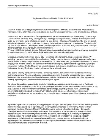Pobrano z portalu Mapa Kultury 08.07.2013 Regionalne Muzeum Młodej Polski „Rydlówka” ____________________________ autor: jkrupa Muzeum mieści się w zabytkowym dworku zbudowanym w 1894 roku przez malarza Włodzimierza Tetmajera, który cztery lata wcześniej ożenił się z Anną Mikołajczykówną, córką bronowickiego chłopa. 21 listopada 1900 roku w domu Tetmajerów odbyła się zabawa weselna po ślubie poety i dramaturga Lucjana Rydla z siostrą Anny Tetmajerowej – Jadwigą Mikołajczykówną. Jednym z obecnych na niej gości był przyjaciel pana młodego, świadek na jego ślubie – Stanisław Wyspiański. Nie brał on jednak udziału w zabawie – oparty o odrzwia pomiędzy dwiema izbami – słuchał i obserwował. Tak narodziła się koncepcja "Wesela", które pod piórem pisarza wykroczyło poza swe anegdotyczne ramy, urastając do rangi jednego z największych polskich dramatów. W roku 1908 Rydel odkupił dom od Tetmajera i po jego przebudowie zamieszkał w nim wraz z rodziną cztery lata później. Od 1969 roku w Rydlówce działa Muzeum Młodej Polski. Ekspozycja muzeum obejmuje cztery izby – świetlicę, izbę taneczną, izbę-scenę oraz alkierz. W świetlicy – dawnej pracowni i bibliotece Lucjana Rydla – można obecnie oglądać wystawę malarstwa Młodej Polski poświęconego tematyce bronowickiej. W izbie tanecznej, gdzie podczas wesela do tańca przygrywała wiejska kapela, a o północy odbywały się oczepiny, zgromadzone są portrety i pamiątki związane z rodziną Rydla. Ekspozycję uzupełniają zaś autentyczne stroje bronowickie oraz ubranie krakowskie Jadwigi Rydlowej i kaftan jej brata – Jana Mikołajczyka. Izba-scena (dawny pokój Włodzimierza Tetmajera) stanowi dokładne odzwierciedlenie dekoracji teatralnej premiery Wesela, w alkierzu zaś znajdują się m.in. fotografie uczestników owej zabawy – pierwowzorów postaci dramatu Wyspiańskiego, pięknie zachowana krakowska skrzynia wyprawna Jadwigi Rydlowej oraz pierwodruki utworów Lucjana Rydla. Co roku w listopadzie, na pamiątkę owej słynnej zabawy weselnej, organizowane jest w Rydlówce uroczyste „Osadzanie Chochoła”. Przy muzyce kapeli wiejskiej stawia się chochoła – otula słomą krzak róży, a dzieci w strojach krakowskich tańczą dokoła niego, trzymając się za ręce. Dalszy ciąg uroczystości odbywa się już w muzealnych izbach, gdzie po części artystycznej (koncertach, wykładach) goście raczą się tradycyjnym już poczęstunkiem – gorącą kawą i herbatą oraz bronowickimi kołaczami. Rydlówka – położona w pięknym, rozległym ogrodzie – jest również przyjazna dzieciom. Wiosną i latem najmłodsi mogą bawić się w ogrodzie, zaś jesienią zbierać rosnące w nim maliny. Warto jednak pamiętać, że oferta Muzeum Młodej Polski skierowana jest nie tylko dla młodzieży i dorosłych, znających Wesele Stanisława Wyspiańskiego. Prezentowana w nim ekspozycja etnograficzna i historyczna jest również niezwykle atrakcyjna dla dzieci, które mogą m.in. odczytywać przeszło stuletnie napisy na belkach stropowych domu, zobaczyć, jak wyglądały i z czego się składały autentyczne odświętne stroje chłopów bronowickich czy poznać sekrety krakowskich skrzyń wyprawnych. Na najmłodszych czekają zaś atrakcje w postaci konkursów i zabaw plastycznych organizowanych przez pracowników muzeum. strona 1 / 1