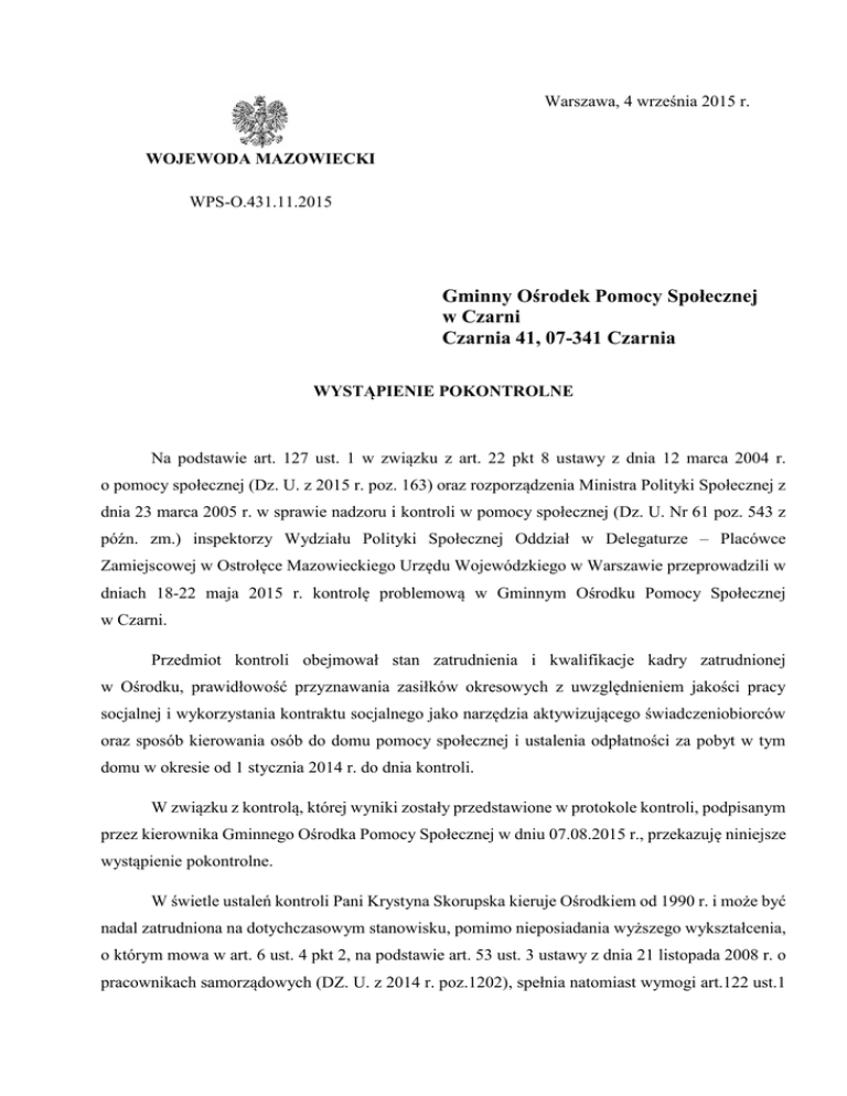 Warszawa, 4 września 2015 r. WOJEWODA MAZOWIECKI WPS-O.431.11.2015 Gminny Ośrodek Pomocy Społecznej w Czarni Czarnia 41, 07-341 Czarnia WYSTĄPIENIE POKONTROLNE Na podstawie art. 127 ust. 1 w związku z art. 22 pkt 8 ustawy z dnia 12 marca 2004 r. o pomocy społecznej (Dz. U. z 2015 r. poz. 163) oraz rozporządzenia Ministra Polityki Społecznej z dnia 23 marca 2005 r. w sprawie nadzoru i kontroli w pomocy społecznej (Dz. U. Nr 61 poz. 543 z późn. zm.) inspektorzy Wydziału Polityki Społecznej Oddział w Delegaturze – Placówce Zamiejscowej w Ostrołęce Mazowieckiego Urzędu Wojewódzkiego w Warszawie przeprowadzili w dniach 18-22 maja 2015 r. kontrolę problemową w Gminnym Ośrodku Pomocy Społecznej w Czarni. Przedmiot kontroli obejmował stan zatrudnienia i kwalifikacje kadry zatrudnionej w Ośrodku, prawidłowość przyznawania zasiłków okresowych z uwzględnieniem jakości pracy socjalnej i wykorzystania kontraktu socjalnego jako narzędzia aktywizującego świadczeniobiorców oraz sposób kierowania osób do domu pomocy społecznej i ustalenia odpłatności za pobyt w tym domu w okresie od 1 stycznia 2014 r. do dnia kontroli. W związku z kontrolą, której wyniki zostały przedstawione w protokole kontroli, podpisanym przez kierownika Gminnego Ośrodka Pomocy Społecznej w dniu 07.08.2015 r., przekazuję niniejsze wystąpienie pokontrolne. W świetle ustaleń kontroli Pani Krystyna Skorupska kieruje Ośrodkiem od 1990 r. i może być nadal zatrudniona na dotychczasowym stanowisku, pomimo nieposiadania wyższego wykształcenia, o którym mowa w art. 6 ust. 4 pkt 2, na podstawie art. 53 ust. 3 ustawy z dnia 21 listopada 2008 r. o pracownikach samorządowych (DZ. U. z 2014 r. poz.1202), spełnia natomiast wymogi art.122 ust.1 ustawy o pomocy społecznej. Pozostali pracownicy Ośrodka, wykonujący zadania pomocy społecznej spełniali wymagania do zatrudnienia na zajmowanych odpowiednio stanowiskach starszego pracownika socjalnego, specjalisty pracy socjalnej, głównego księgowego i młodszego księgowego, które określa rozporządzenie Rady Ministrów z dnia 18 marca 2009 r. w sprawie wynagradzania pracowników samorządowych (Dz. U. z 2014 r. poz. 1786) oraz odpowiednio art. 156 ust. 1 ustawy o pomocy społecznej oraz art. 54 ust. 2 pkt 5 lit. a ustawy z dnia 27 sierpnia 2009 r. o finansach publicznych (Dz. U. z 2013 r. poz. 885 z późn. zm.). Natomiast liczba 2 pracowników socjalnych zatrudnionych w Ośrodku na ok. 2700 mieszkańców gminy Czarnia nie odpowiadała normie ustalonej w art. 110 ust. 12 ustawy o pomocy społecznej, zgodnie z którą ośrodek pomocy społecznej zatrudnia w pełnym wymiarze czasu pracy nie mniej niż 3 pracowników socjalnych. Na podstawie skontrolowanych akt 14 świadczeniobiorców stwierdzono, że zasiłki okresowe przyznane i wypłacone zostały, zgodnie z art. 38 ust. 1 ustawy o pomocy społecznej, ze względu na bezrobocie, niepełnosprawność lub długotrwałą chorobę osobom i rodzinom, których dochód lub dochód na osobę w rodzinie nie przekraczał odpowiednio kryterium dochodowego osoby samotnie gospodarującej lub kryterium na osobę w rodzinie. Wszystkie zasiłki okresowe przyznane zostały w minimalnej kwocie równej 50% różnicy między odpowiednio kryterium dochodowym osoby samotnie gospodarującej a dochodem tej osoby lub kryterium dochodowym rodziny a dochodem tej rodziny, nie niższej jednak niż 20 zł miesięcznie, zgodnie z art. 38 ust. 2-4 ustawy o pomocy społecznej. Zasiłki okresowe sfinansowane zostały ze środków budżetu państwa i z budżetu gminy. Ustalanie uprawnień do udzielenia pomocy w formie zasiłku okresowego każdorazowo odbywało się po ustaleniu sytuacji osoby lub rodziny w drodze wywiadu środowiskowego. Skontrolowane decyzje administracyjne zawierały wszystkie niezbędne elementy wskazane w art. 107 § 1 ustawy z dnia 14 czerwca 1960 r. Kodeks postępowania administracyjnego (Dz. U. z 2013 r., poz. 267 z póź. zm.), tj. oznaczony był organ wydający decyzję i strona, wskazana była data wydania decyzji, podstawa prawna, rozstrzygnięcie, faktyczne i prawne uzasadnienie oraz pouczenie. Zwrócono jednak uwagę, że podpis osoby upoważnionej do wydania decyzji opatrzony był imienną pieczątką kierownika GOPS nie zawierającą informacji, że decyzje podejmuje z upoważnienia wójta. Wszystkie sprawy zostały rozpatrzone z zachowaniem miesięcznego terminu określonego w art. 35 § 3 k.p.a. W świetle ustaleń kontroli praca socjalna realizowana na rzecz rodzin korzystających z pomocy w formie zasiłków okresowych była dokumentowana w kwestionariuszach rodzinnych wywiadów środowiskowych. Zaplanowane działania były dostosowane do sytuacji osób i rodzin, jednak nie było informacji o ich efektach. Z 8 osobami, których rodzina objęta była pomocą w formie zasiłku okresowego praca socjalna prowadzona była również w oparciu o kontrakt socjalny. W kontraktach określono działania i czas niezbędny do osiągnięcia wyznaczonego celu. Po zakończeniu okresu, na jaki były zawarte dokonano oceny realizacji ustalonych działań. Wszystkie kontrakty zostały zrealizowane, a cele w nich postawione zostały przez beneficjentów osiągnięte. W okresie objętym kontrolą w domach pomocy społecznej przebywało trzech mieszkańców gminy Czarnia. Jedna z tych osób została umieszczona w 2014 r., na zasadach określonych w art. 65 ustawy o pomocy społecznej, w domu pomocy społecznej prowadzonym przez podmiot niepubliczny nie na zlecenie jednostki samorządu terytorialnego, po wyczerpaniu możliwości jej umieszczenia w domu pomocy społecznej prowadzonym przez jednostkę samorządu terytorialnego lub na jej zlecenie. Odpłatność za pobyt w dps była ustalana przez GOPS w sposób prawidłowy. Oceniając pozytywnie realizację skontrolowanych zadań stwierdzono jednak następujące nieprawidłowości i uchybienia: 1. Wysokość zasiłków okresowych ustalano w decyzjach w zaokrą