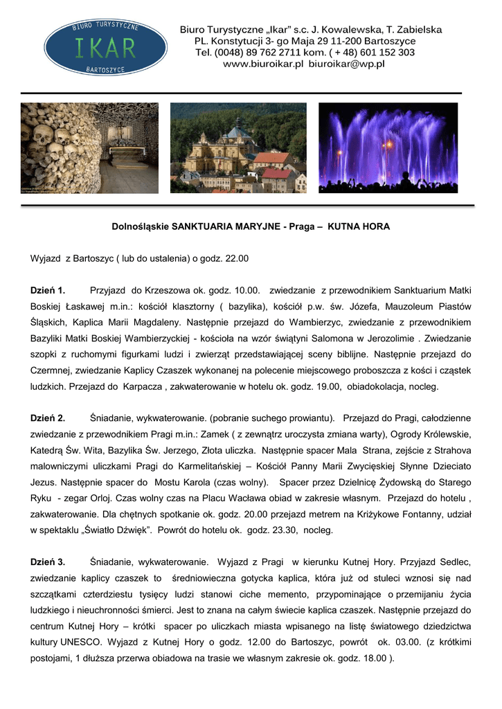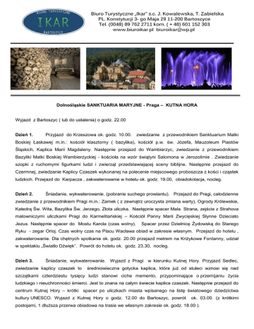 Dolnośląskie SANKTUARIA MARYJNE - Praga – KUTNA HORA Wyjazd z Bartoszyc ( lub do ustalenia) o godz. 22.00 Dzień 1. Przyjazd do Krzeszowa ok. godz. 10.00. zwiedzanie z przewodnikiem Sanktuarium Matki Boskiej Łaskawej m.in.: kościół klasztorny ( bazylika), kościół p.w. św. Józefa, Mauzoleum Piastów Śląskich, Kaplica Marii Magdaleny. Następnie przejazd do Wambierzyc, zwiedzanie z przewodnikiem Bazyliki Matki Boskiej Wambierzyckiej - kościoła na wzór świątyni Salomona w Jerozolimie . Zwiedzanie szopki z ruchomymi figurkami ludzi i zwierząt przedstawiającej sceny biblijne. Następnie przejazd do Czermnej, zwiedzanie Kaplicy Czaszek wykonanej na polecenie miejscowego proboszcza z kości i cząstek ludzkich. Przejazd do Karpacza , zakwaterowanie w hotelu ok. godz. 19.00, obiadokolacja, nocleg. Dzień 2. Śniadanie, wykwaterowanie. (pobranie suchego prowiantu). Przejazd do Pragi, całodzienne zwiedzanie z przewodnikiem Pragi m.in.: Zamek ( z zewnątrz uroczysta zmiana warty), Ogrody Królewskie, Katedrą Św. Wita, Bazylika Św. Jerzego, Złota uliczka. Następnie spacer Mala Strana, zejście z Strahova malowniczymi uliczkami Pragi do Karmelitańskiej – Kościół Panny Marii Zwycięskiej Słynne Dzieciato Jezus. Następnie spacer do Mostu Karola (czas wolny). Spacer przez Dzielnicę Żydowską do Starego Ryku - zegar Orloj. Czas wolny czas na Placu Wacława obiad w zakresie własnym. Przejazd do hotelu , zakwaterowanie. Dla chętnych spotkanie ok. godz. 20.00 przejazd metrem na Kriżykowe Fontanny, udział w spektaklu „Światło Dźwięk”. Powrót do hotelu ok. godz. 23.30, nocleg. Dzień 3. Śniadanie, wykwaterowanie. Wyjazd z Pragi w kierunku Kutnej Hory. Przyjazd Sedlec, zwiedzanie kaplicy czaszek to średniowieczna gotycka kaplica, która już od stuleci wznosi się nad szczątkami czterdziestu tysięcy ludzi stanowi ciche memento, przypominające o przemijaniu życia ludzkiego i nieuchronności śmierci. Jest to znana na całym świecie kaplica czaszek. Następnie przejazd do centrum Kutnej Hory – krótki spacer po uliczkach miasta wpisanego na listę światowego dziedzictwa kultury UNESCO. Wyjazd z Kutnej Hory o godz. 12.00 do Bartoszyc, powrót ok. 03.00. (z krótkimi postojami, 1 dłuższa przerwa obiadowa na trasie we własnym zakresie ok. godz. 18.00 ). Cena: 595 zł/os ( koszt kalkulowany przy min. 40 os.) Cena obejmuje: transport komfortowym, klimatyzowanym autokarem , 2 noclegi: 1 w pensjonacie w Karpaczu w pok. 2,3 -os z łazienkami, 1 w hotelu **/*** w pok. 2,3 –os w Pradze, 2 śniadania w formie bufetu , 1 obiadokolacja w Karpaczu, 1 suchy prowiant w dniu wyjazdu do Pragi, usługę przewodnika w zwiedzanych miejscowościach, ubezpieczenie KL+NNW za granicą ( nie obejmuje opcji CP istnieje możliwość doubezpieczenia), składka na TFG opiekę pilota. Cena nie obejmuje: biletów wstępów do zwiedzanych obiektów tj.: Katedrą Św. Wita, Bazylika Św. Jerzego, Złota Uliczka – 250 koron, Kriżikowe Fontanny – 220 koron, Kaplica czaszek – 50 koron, ruchoma szopka w Wambierzycach – 6 zł, bilety komunikacji miejskiej w Pradze - 60 koron.