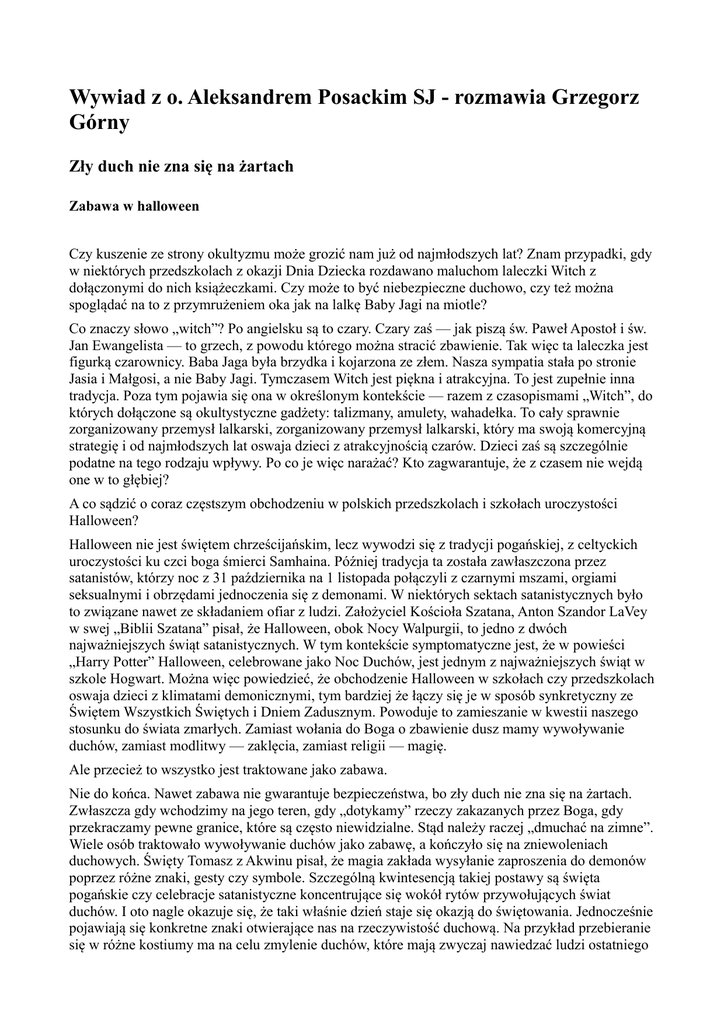 Wywiad z o. Aleksandrem Posackim SJ - rozmawia Grzegorz Górny Zły duch nie zna się na żartach Zabawa w halloween Czy kuszenie ze strony okultyzmu może grozić nam już od najmłodszych lat? Znam przypadki, gdy w niektórych przedszkolach z okazji Dnia Dziecka rozdawano maluchom laleczki Witch z dołączonymi do nich książeczkami. Czy może to być niebezpieczne duchowo, czy też można spoglądać na to z przymrużeniem oka jak na lalkę Baby Jagi na miotle? Co znaczy słowo „witch”? Po angielsku są to czary. Czary zaś — jak piszą św. Paweł Apostoł i św. Jan Ewangelista — to grzech, z powodu którego można stracić zbawienie. Tak więc ta laleczka jest figurką czarownicy. Baba Jaga była brzydka i kojarzona ze złem. Nasza sympatia stała po stronie Jasia i Małgosi, a nie Baby Jagi. Tymczasem Witch jest piękna i atrakcyjna. To jest zupełnie inna tradycja. Poza tym pojawia się ona w określonym kontekście — razem z czasopismami „Witch”, do których dołączone są okultystyczne gadżety: talizmany, amulety, wahadełka. To cały sprawnie zorganizowany przemysł lalkarski, zorganizowany przemysł lalkarski, który ma swoją komercyjną strategię i od najmłodszych lat oswaja dzieci z atrakcyjnością czarów. Dzieci zaś są szczególnie podatne na tego rodzaju wpływy. Po co je więc narażać? Kto zagwarantuje, że z czasem nie wejdą one w to głębiej? A co sądzić o coraz częstszym obchodzeniu w polskich przedszkolach i szkołach uroczystości Halloween? Halloween nie jest świętem chrześcijańskim, lecz wywodzi się z tradycji pogańskiej, z celtyckich uroczystości ku czci boga śmierci Samhaina. Później tradycja ta została zawłaszczona przez satanistów, którzy noc z 31 października na 1 listopada połączyli z czarnymi mszami, orgiami seksualnymi i obrzędami jednoczenia się z demonami. W niektórych sektach satanistycznych było to związane nawet ze składaniem ofiar z ludzi. Założyciel Kościoła Szatana, Anton Szandor LaVey w swej „Biblii Szatana” pisał, że Halloween, obok Nocy Walpurgii, to jedno z dwóch najważniejszych świąt satanistycznych. W tym kontekście symptomatyczne jest, że w powieści „Harry Potter” Halloween, celebrowane jako Noc Duchów, jest jednym z najważniejszych świąt w szkole Hogwart. Można więc powiedzieć, że obchodzenie Halloween w szkołach czy przedszkolach oswaja dzieci z klimatami demonicznymi, tym bardziej że łączy się je w sposób synkretyczny ze Świętem Wszystkich Świętych i Dniem Zadusznym. Powoduje to zamieszanie w kwestii naszego stosunku do świata zmarłych. Zamiast wołania do Boga o zbawienie dusz mamy wywoływanie duchów, zamiast modlitwy — zaklęcia, zamiast religii — magię. Ale przecież to wszystko jest traktowane jako zabawa. Nie do końca. Nawet zabawa nie gwarantuje bezpieczeństwa, bo zły duch nie zna się na żartach. Zwłaszcza gdy wchodzimy na jego teren, gdy „dotykamy” rzeczy zakazanych przez Boga, gdy przekraczamy pewne granice, które są często niewidzialne. Stąd należy raczej „dmuchać na zimne”. Wiele osób traktowało wywoływanie duchów jako zabawę, a kończyło się na zniewoleniach duchowych. Święty Tomasz z Akwinu pisał, że magia zakłada wysyłanie zaproszenia do demonów poprzez różne znaki, gesty czy symbole. Szczególną kwintesencją takiej postawy są święta pogańskie czy celebracje satanistyczne koncentrujące się wokół rytów przywołujących świat duchów. I oto nagle okazuje się, że taki właśnie dzień staje się okazją do świętowania. Jednocześnie pojawiają się konkretne znaki otwierające nas na rzeczywistość duchową. Na przykład przebieranie się w różne kostiumy ma na celu zmylenie duchów, które mają zwyczaj nawiedzać ludzi ostatniego dnia października. Tymczasem choćby z praktyki egzorcystycznej wiadomo, że nękać ludzi mogą tylko złe duchy, które często imitują duchy zmarłych, co jest zresztą typowe dla spirytyzmu. Poważniejsze wydaje się jednak inne zagrożenie: Halloween wypiera Święto Wszystkich Świętych oraz Dzień Zaduszny w świadomości — i w przeżywaniu — wielu dzieci. Ich stosunek do świata zmarłych przestaje być kształtowany przez dogmaty wiary, które ulegają zbanalizowaniu. Nie ma wtedy świętych obcowania, nie ma modlitwy za zmarłych, jest beztroska zabawa i igranie z ogniem. Dlaczego więc mielibyśmy obchodzić jako swoje święto pogańskie i satanistyczne? Jak w takim razie traktować andrzejki, które niemal powszechnie w polskich szkołach rozumiane są jako okazja do powróżenia? Zastanawia mnie, dlaczego wciąż nie traktujemy grzechu wróżbiarstwa poważnie. Święty Tomasz nazywał ten grzech „uzurpacją prerogatyw boskich”. Biblia zakazuje nam nawet „dotykać” tych rzeczy, zaś Katechizm Kościoła Katolickiego w artykule 2116 mówi bardzo wyraźnie: Należy odrzucić wszelkie formy wróżbiarstwa: odwoływanie się do Szatana lub demonów, wywoływanie zmarłych lub inne praktyki mające rzekomo odsłaniać przyszłość. Korzystanie z horoskopów, astrologia, chiromancja, wyjaśnianie przepowiedni i wróżb, zjawiska jasnowidztwa, posługiwanie się medium są przejawami chęci panowania nad czasem, nad historią i wreszcie nad ludźmi, a jednocześnie pragnieniem zjednania sobie tajemnych mocy. Praktyki te są sprzeczne z czcią i szacunkiem — połączonym z miłującą bojaźnią — które należą się jedynie Bogu. Inaczej mówiąc, chodzi o grzech bezbożności. Proszę porozmawiać z nauczycielami i rodzicami. Nikt z nich nie uważa tego za odwoływanie się do Szatana. Dla nich jest to tylko zwykła zabawa. Mogą też powiedzieć, że nikt nie został przecież opętany przez andrzejki. Nie chodzi tylko o Szatana, ale o niebezpieczne przekraczanie granic. Czy możemy je wyraźnie wytyczyć? Czy mamy taką pewność? Czy posiadamy taką wiedzę? Nie chodzi przecież o emocjonalny strach, ale roztropną 