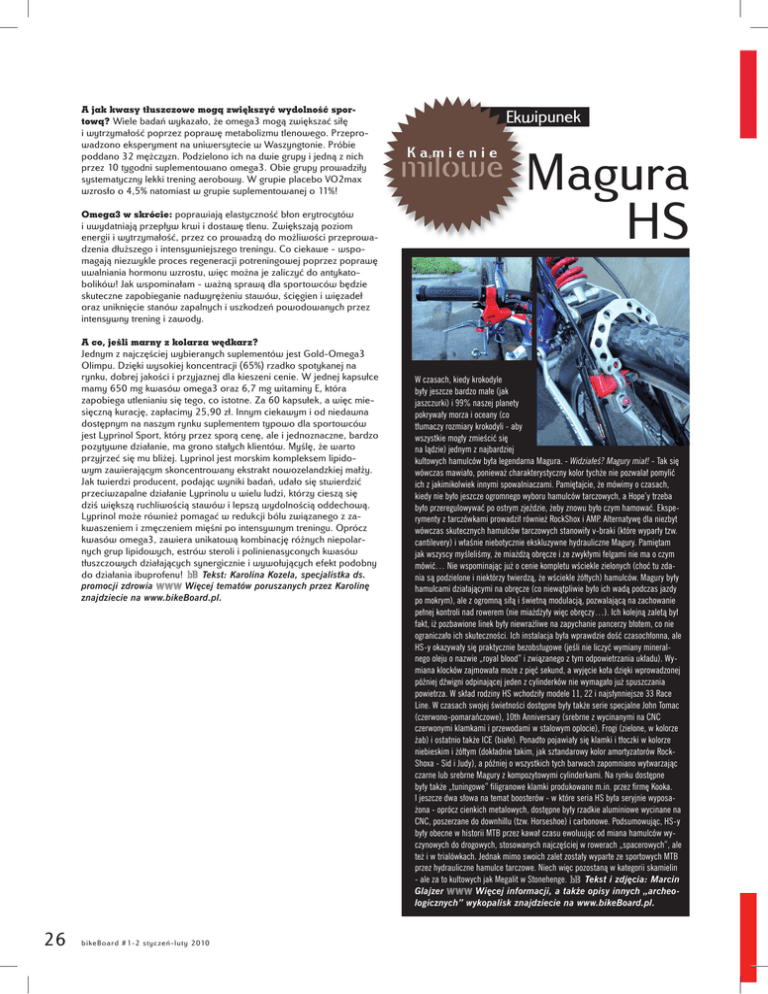 A jak kwasy tłuszczowe mogą zwiększyć wydolność sportową? Wiele badań wykazało, że omega3 mogą zwiększać siłę i wytrzymałość poprzez poprawę metabolizmu tlenowego. Przeprowadzono eksperyment na uniwersytecie w Waszyngtonie. Próbie poddano 32 mężczyzn. Podzielono ich na dwie grupy i jedną z nich przez 10 tygodni suplementowano omega3. Obie grupy prowadziły systematyczny lekki trening aerobowy. W grupie placebo VO2max wzrosło o 4,5% natomiast w grupie suplementowanej o 11%! Omega3 w skrócie: poprawiają elastyczność błon erytrocytów i uwydatniają przepływ krwi i dostawę tlenu. Zwiększają poziom energii i wytrzymałość, przez co prowadzą do możliwości przeprowadzenia dłuższego i intensywniejszego treningu. Co ciekawe - wspomagają niezwykle proces regeneracji potreningowej poprzez poprawę uwalniania hormonu wzrostu, więc można je zaliczyć do antykatobolików! Jak wspominałam - ważną sprawą dla sportowców będzie skuteczne zapobieganie nadwyrężeniu stawów, ścięgien i więzadeł oraz uniknięcie stanów zapalnych i uszkodzeń powodowanych przez intensywny trening i zawody. A co, jeśli marny z kolarza wędkarz? Jednym z najczęściej wybieranych suplementów jest Gold-Omega3 Olimpu. Dzięki wysokiej koncentracji (65%) rzadko spotykanej na rynku, dobrej jakości i przyjaznej dla kieszeni cenie. W jednej kapsułce mamy 650 mg kwasów omega3 oraz 6,7 mg witaminy E, która zapobiega utlenianiu się tego, co istotne. Za 60 kapsułek, a więc miesięczną kurację, zapłacimy 25,90 zł. Innym ciekawym i od niedawna dostępnym na naszym rynku suplementem typowo dla sportowców jest Lyprinol Sport, który przez sporą cenę, ale i jednoznaczne, bardzo pozytywne działanie, ma grono stałych klientów. Myślę, że warto przyjrzeć się mu bliżej. Lyprinol jest morskim kompleksem lipidowym zawierającym skoncentrowany ekstrakt nowozelandzkiej małży. Jak twierdzi producent, podając wyniki badań, udało się stwierdzić przeciwzapalne działanie Lyprinolu u wielu ludzi, którzy cieszą się dziś większą ruchliwością stawów i lepszą wydolnością oddechową. Lyprinol może również pomagać w redukcji bólu związanego z zakwaszeniem i zmęczeniem mięśni po intensywnym treningu. Oprócz kwasów omega3, zawiera unikatową kombinację różnych niepolarnych grup lipidowych, estrów steroli i polinienasyconych kwasów tłuszczowych działających synergicznie i wywołujących efekt podobny Tekst: Karolina Kozela, specjalistka ds. do działania ibuprofenu! promocji zdrowia Więcej tematów poruszanych przez Karolinę znajdziecie na www.bikeBoard.pl. 26 b i ke B o a r d # 1-2 st y c z e ń - l u t y 2 010 Ekwipunek Kamienie milowe Magura HS W czasach, kiedy krokodyle były jeszcze bardzo małe (jak jaszczurki) i 99% naszej planety pokrywały morza i oceany (co tłumaczy rozmiary krokodyli - aby wszystkie mogły zmieścić się na lądzie) jednym z najbardziej kultowych hamulców była legendarna Magura. - Widziałeś? Magury miał! - Tak się wówczas mawiało, ponieważ charakterystyczny kolor tychże nie pozwalał pomylić ich z jakimikolwiek innymi spowalniaczami. Pamiętajcie, że mówimy o czasach, kiedy nie było jeszcze ogromnego wyboru hamulców tarczowych, a Hope’y trzeba było przeregulowywać po ostrym zjeździe, żeby znowu było czym hamować. Eksperymenty z tarczówkami prowadził również RockShox i AMP. Alternatywę dla niezbyt wówczas skutecznych hamulców tarczowych stanowiły v-braki (które wyparły tzw. cantilevery) i właśnie niebotycznie ekskluzywne hydrauliczne Magury. Pamiętam jak wszyscy myśleliśmy, że miażdżą obręcze i ze zwykłymi felgami nie ma o czym mówić… Nie wspominając już o cenie kompletu wściekle zielonych (choć tu zdania są podzielone i niektórzy twierdzą, że wściekle żółtych) hamulców. Magury były hamulcami działającymi na obręcze (co niewątpliwie było ich wadą podczas jazdy po mokrym), ale z ogromną siłą i świetną modulacją, pozwalającą na zachowanie pełnej kontroli nad rowerem (nie miażdżyły więc obręczy…). Ich kolejną zaletą był fakt, iż pozbawione linek były niewrażliwe na zapychanie pancerzy błotem, co nie ograniczało ich skuteczności. Ich instalacja była wprawdzie dość czasochłonna, ale HS-y okazywały się praktycznie bezobsługowe (jeśli nie liczyć wymiany mineralnego oleju o nazwie „royal blood” i związanego z tym odpowietrzania układu). Wymiana klocków zajmowała może z pięć sekund, a wyjęcie koła dzięki wprowadzonej później dźwigni odpinającej jeden z cylinderków nie wymagało już spuszczania powietrza. W skład rodziny HS wchodziły modele 11, 22 i najsłynniejsze 33 Race Line. W czasach swojej świetności dostępne były także serie specjalne John Tomac (czerwono-pomarańczowe), 10th Anniversary (srebrne z wycinanymi na CNC czerwonymi klamkami i przewodami w stalowym oplocie), Frogi (zielone, w kolorze żab) i ostatnio także ICE (białe). Ponadto pojawiały się klamki i tłoczki w kolorze niebieskim i żółtym (dokładnie takim, jak sztandarowy kolor amortyzatorów RockShoxa - Sid i Judy), a później o wszystkich tych barwach zapomniano wytwarzając czarne lub srebrne Magury z kompozytowymi cylinderkami. Na rynku dostępne były także „tuningowe” filigranowe klamki produkowane m.in. przez firmę Kooka. I jeszcze dwa słowa na temat boosterów - w które seria HS była seryjnie wyposażona - oprócz cienkich metalowych, dostępne były rzadkie aluminiowe wycinane na CNC, poszerzane do downhillu (tzw. Horseshoe) i carbonowe. Podsumowując, HS-y były obecne w historii MTB przez kawał czasu ewoluując od miana hamulców wyczynowych do drogowych, stosowanych najczęściej w rowerach „spacerowych”, ale też i w trialówkach. Jednak mimo swoich zalet zostały wyparte ze sportowych MTB przez hydrauliczne hamulce tarczowe. Niech więc pozostaną w kategorii skamielin - ale za to kultowych jak Meg