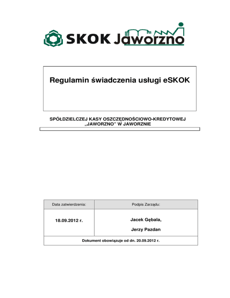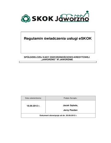 Regulamin świadczenia usługi eSKOK SPÓŁDZIELCZEJ KASY OSZCZĘDNOŚCIOWO-KREDYTOWEJ „JAWORZNO” W JAWORZNIE Data zatwierdzenia: Podpis Zarządu: 18.09.2012 r. Jacek Gębala, Jerzy Pazdan Dokument obowiązuje od dn. 20.09.2012 r. Regulamin świadczenia usługi eSKOK Rozdział 1 Postanowienia ogólne §1 Regulamin określa zasady świadczenia przez Spółdzielczą Kasę Oszczędnościowo-Kredytową „Jaworzno” z siedzibą w Jaworznie, ul. Gwarków 2, kod pocztowy 43-600 wpisaną do Krajowego Rejestru Sądowego prowadzonego przez Sąd Rejonowy Katowice – Wschód Wydział VIII Gospodarczy KRS pod numerem KRS 0000037620, NIP 632-10-02-833 której główne miejsce wykonywania działalności znajduje się w Jaworznie, a informacja o wszystkich miejscach wykonywania przez nią działalności znajduje się w każdej placówce SKOK oraz na stronie internetowej www.skokjaw.pl, adres mailowy : [email protected], zarejestrowaną w prowadzonym przez Komisję Nadzoru Finansowego rejestrze dostawców usług płatniczych pod nr SK7/2011, nad której działalnością w zakresie usług płatniczych nadzór sprawuje: do dnia 26.10.2012 - Krajowa Spółdzielcza Kasa OszczędnościowoKredytowa z siedziba w Sopocie, ul. Władysława IV 22, od dnia 27.10.2012 r. Komisja Nadzoru Finansowego z siedziba w Warszawie, Plac Powstańców Warszawy 1, 00-950 Warszawa zwaną dalej SKOK lub Kasą usługi bankowości elektronicznej polegającej na zapewnieniu Użytkownikowi dostępu do środków pieniężnych zgromadzonych na rachunkach Użytkownika prowadzonych przez SKOK, a także do wykonywania Operacji lub innych czynności zleconych przez Użytkownika, zwanej dalej Usługą eSKOK. §2 Przez użyte w niniejszym Regulaminie określenia należy rozumieć: 1) Dyspozycja – zlecenie Użytkownika przeprowadzenia Operacji lub innej czynności w ramach usługi eSKOK, 2) Hasło – zdefiniowany przez Użytkownika ciąg znaków umożliwiający wraz z Loginem uzyskanie dostępu do usługi eSKOK poprzez dany Kanał dostępu, 3) Kanał dostępu – sposób komunikacji ze SKOK – przez Internet lub telefon, 4) Kwota minimalna – kwota, którą Użytkownik jest obowiązany utrzymywać na Indywidualnym Koncie Spółdzielczym, 5) Jednorazowe hasło SMS – pięciocyfrowy unikalny kod, służący do potwierdzania uprawnień i autoryzacji Dyspozycji przy wykorzystaniu dowolnego Kanału dostępu, wygenerowany przez Kasę i przesłany w formie wiadomości SMS na numer telefonu komórkowego wskazany przez Użytkownika w Placówce Kasy, 6) Login – różny od numeru członkowskiego w bazie członkowskiej Kasy, numer służący do identyfikacji Użytkownika na potrzeby usługi eSKOK, nadawany mu przy podpisywaniu umowy o świadczenie usługi eSKOK, 7) Logowanie – proces uzyskania dostępu do usługi eSKOK wymagający użycia Loginu oraz Hasła, 8) Lista haseł jednorazowych – lista 50 pięciocyfrowych haseł służących do potwierdzania uprawnień do składania Dyspozycji i autoryzacji Operacji przy wykorzystaniu dowolnego Kanału dostępu, 9) Limit dzienny – najwyższa kwota, jaka może być przelana z Rachunku własnego Użytkownika w ciągu jednego dnia (nie obejmuje przelewów wewnętrznych i cyklicznych), 10) Limit miesięczny – najwyższa kwota, jaka może być przelana z Rachunku własnego Użytkownika w ciągu jednego miesiąca kalendarzowego (nie obejmuje przelewów wewnętrznych i cyklicznych), 11) Operacja – polecenie wykonania przelewu 12) Placówka SKOK – dowolna placówka SKOK „Jaworzno”, 13) Przelew zdefiniowany – przelew na rachunek wskazany wcześniej przez Użytkownika w Placówce SKOK lub za pośrednictwem usługi eSKOK, 14) Przelew cykliczny – przelew o stałej kwocie wykonywany w comiesięcznych odstępach czasu na rzecz tego samego beneficjenta i na ten sam numer rachunku, 15) Przelew wewnętrzny – przeniesienie środków, dokonane na podstawie zlecenia Użytkownika wykonania Operacji, pomiędzy Rachunkiem własnym Użytkownika a innymi Rachunkami Użytkownika w SKOK, z wyłączeniem rachunków Użytkownika związanych z prowadzoną przez niego działalnością gospodarczą, 16) Przelew zewnętrzny - przelew dokonany z Rachunku własnego na rachunek bankowy prowadzony przez inny podmiot niż SKOK lub na rachunek osoby innej niż Użytkownik, prowadzony przez SKOK. Przelew zewnętrzny może zostać dokonany wyłącznie z Rachunku własnego. 17) Przelew z datą przyszłą – przelew, którego dokonanie następuje w dniu wskazanym przez Użytkownika, różnym od daty złożenia zlecenia wykonania Operacji, 18) Rachunek – każdy rachunek dostępny w ramach usługi eSKOK, 19) Rachunek własny – wskazany w Umowie Rachunek z funkcją oszczędnościoworozliczeniową lub rachunek bieżący, w ciężar którego księgowane są i rozliczane Operacje oraz opłaty i prowizje związane z korzystaniem z usługi eSKOK, 20) Środki dostępne – środki pieniężne przechowywane na Rachunku własnym powiększone o środki pozostające do wykorzystania na podstawie zawartej umowy o linię pożyczkową w tym Rachunku, pomniejszone o kwotę należną z tytułu dokonanych a nie rozliczonych transakcji dokonanych przy użyciu kart płatniczych, wydanych do tego Rachunku oraz, w przypadku Indywidualnego Konta Spółdzielczego o Kwotę minimalną, 21) Tele-skok – obsługa Użytkowników w ramach eSKOK za pomocą telefonicznego Kanału dostępu za pośrednictwem Operatora Tele-skok bądź poprzez automatyczny serwis telefoniczny (IVR), 22) Umowa – umowa o świadczenie usługi eSKOK, 23) Użytkownik – członek SKOK (w tym przedsiębiorca), który na podstawie Umowy jest uprawniony do składania Dyspozycji. W przypadku spółki cywilnej wspólnicy w umowie wskazują osobę, którą upoważniają do składania Dyspozycji w ich imieniu. 24) Godzina graniczna – określony przez SKOK nieprzekraczalny, przypadający pod koniec dnia roboczego moment, po którym otrzymane zlecenie wykonania Operacji uzn