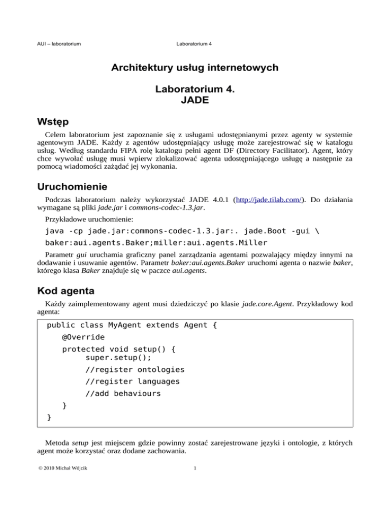 Architektury usług internetowych Laboratorium 4. JADE Wstęp