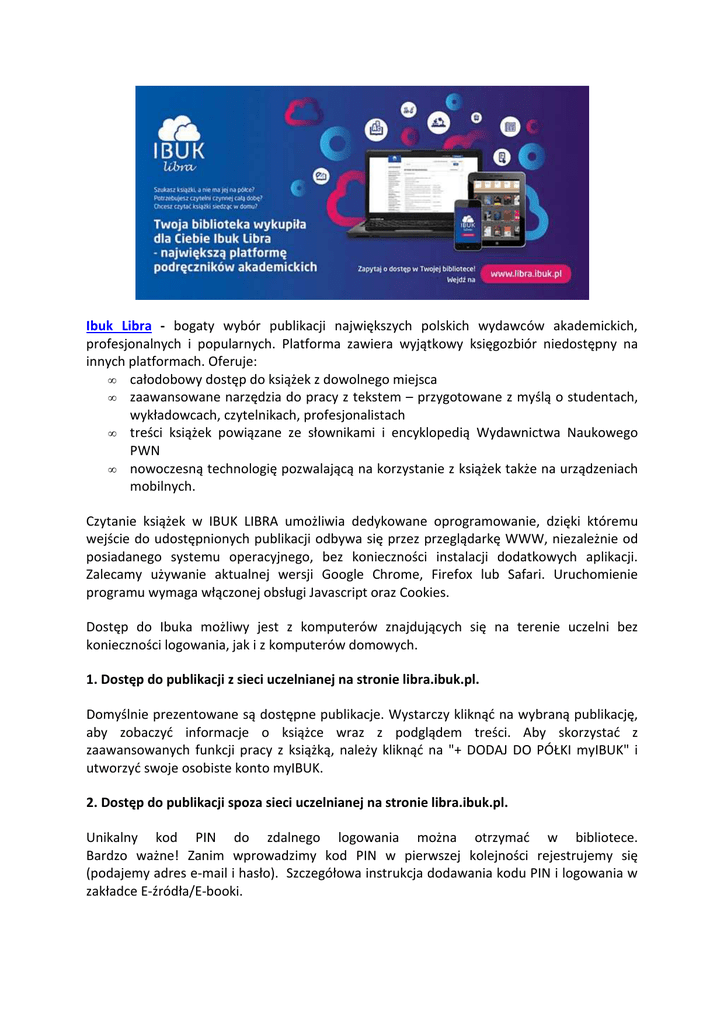 Ibuk Libra - bogaty wybór publikacji największych polskich wydawców akademickich, profesjonalnych i popularnych. Platforma zawiera wyjątkowy księgozbiór niedostępny na innych platformach. Oferuje: • całodobowy dostęp do książek z dowolnego miejsca • zaawansowane narzędzia do pracy z tekstem – przygotowane z myślą o studentach, wykładowcach, czytelnikach, profesjonalistach • treści książek powiązane ze słownikami i encyklopedią Wydawnictwa Naukowego PWN • nowoczesną technologię pozwalającą na korzystanie z książek także na urządzeniach mobilnych. Czytanie książek w IBUK LIBRA umożliwia dedykowane oprogramowanie, dzięki któremu wejście do udostępnionych publikacji odbywa się przez przeglądarkę WWW, niezależnie od posiadanego systemu operacyjnego, bez konieczności instalacji dodatkowych aplikacji. Zalecamy używanie aktualnej wersji Google Chrome, Firefox lub Safari. Uruchomienie programu wymaga włączonej obsługi Javascript oraz Cookies. Dostęp do Ibuka możliwy jest z komputerów znajdujących się na terenie uczelni bez konieczności logowania, jak i z komputerów domowych. 1. Dostęp do publikacji z sieci uczelnianej na stronie libra.ibuk.pl. Domyślnie prezentowane są dostępne publikacje. Wystarczy kliknąć na wybraną publikację, aby zobaczyć informacje o książce wraz z podglądem treści. Aby skorzystać z zaawansowanych funkcji pracy z książką, należy kliknąć na "+ DODAJ DO PÓŁKI myIBUK" i utworzyć swoje osobiste konto myIBUK. 2. Dostęp do publikacji spoza sieci uczelnianej na stronie libra.ibuk.pl. Unikalny kod PIN do zdalnego logowania można otrzymać w bibliotece. Bardzo ważne! Zanim wprowadzimy kod PIN w pierwszej kolejności rejestrujemy się (podajemy adres e-mail i hasło). Szczegółowa instrukcja dodawania kodu PIN i logowania w zakładce E-źródła/E-booki.