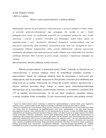 dr hab. Zbigniew Osiński UMCS w Lublinie Bariery wykorzystania Internetu w polskiej edukacji. Streszczenie: Internet nie jest należycie wykorzystywany w procesie edukacji w Polsce mimo, że potrzeby społeczno-ekonomiczne tego wymagają. Nie wynika to ani z braku pedagogicznych teorii, czy niedostatku pomysłów na rozwiązania praktyczne, ani z braku motywacji i potrzeb u uczniów. Powodem jest dominujący model lekcji, oparty na zapamiętywaniu z góry określonych informacji dostępnych w podręcznikach oraz na aktywności nauczyciela, duża liczebność uczniowskich grup, brak sal z dostępem do sieci i przynajmniej kilkoma komputerami, słaby poziom alfabetyzacji cyfrowej nauczycieli, mentalność akceptująca dziewiętnastowieczny model edukacji oraz niedostatki tych zasobów polskiego Internetu, które tworzone są przez urzędy, instytucje i organizacje zajmujące się oświatą. Słowa kluczowe: Internet, edukacja, zasoby sieciowe. Badania przeprowadzone w gimnazjach gminy Chełm1 wykazały, że Internet nie jest wykorzystywany w procesie edukacji, nawet do komunikacji pomiędzy uczniami i nauczycielami. Szkoły nie zachęcają młodych ludzi do korzystania z sieciowych gier edukacyjnych, chociaż przypadki zachęcania do skorzystania z Internetu przy odrabianiu prac domowych nie są rzadkie. Nauczyciele nie tworzą dla uczniów zasobów internetowych, a jedynie nieliczni prowadzą blogi. Lekcje w szkole (poza informatyką/technologią informacyjną) nie są wspomagane możliwościami Internetu, a e-kształcenie i narzędzia Web 2.02 są zupełnie niewykorzystywane. To nie jest obraz wyjątkowy, spotykany jedynie w terenie wiejskim Polski wschodniej. To jest rzeczywistość prawie całej polskiej oświaty. 1 Fajman M., Wykorzystanie nowych technologii w szkolnictwie ogólnokształcącym w gminie Chełm, praca magisterska napisana w 2011 r. pod kierunkiem dr hab. Zbigniew Osińskiego na Wydziale Humanistycznym UMCS w Lublinie. 2 Web 2.0 to określenie stron internetowych nowej generacji, stworzone w celu odróżnienia ich od stron tradycyjnych (Web 1.0). Strony Web 2.0 charakteryzują się współtworzeniem treści przez użytkowników, a nie tylko przez twórców poszczególnych serwisów. Celem twórców Web 2.0 jest doprowadzenie do sytuacji, w której sieć WWW będzie dawała użytkownikom jak największą możliwość interakcji i integracji. Jedną z cech Web 2.0 jest to, że środek ciężkości stron WWW zostaje przesunięty w kierunku użytkownika. Autorzy stron przygotowują serwis, ale jądrem jego funkcjonowania są użytkownicy, którzy dostarczają zawartość (np. zdjęcia, pliki wideo, linki do ciekawych stron internetowych itp.) oraz tworzą społeczność użytkowników, która zaczyna ze sobą współpracować i żyć „własnym życiem”. Od czasu rozpowszechnienia się Web 2.0 dużą popularnością zaczęły się cieszyć też serwisy internetowe działające w oparciu o mechanizm wiki (tworzenie treści z poziomu przeglądarki internetowej) i blogi (internetowe pamiętniki). Opis Web 2.0 stworzony została na podstawie definicji opracowanej przez internautów w encyklopedii Wikipedia - http://pl.wikipedia.org/wiki/Web_2.0 - będącej przykładem strony Web 2.0 [wszystkie adresy WWW przywoływane w niniejszym artykule były aktywne w czerwcu 2011 r.]. 1 Typowa szkoła żyje w innej epoce, w czasach tablicy i kredy, udając, że Internet nie istnieje 3. Z rozmów, które Marcin Polak, właściciel serwisu edunews.pl, przeprowadził z nauczycielami i uczniami przy okazji Festiwalu Projektów programów „Szkoła z klasą 2.0“ i „Młody obywatel“ (2011 r.) wynika, że wciąż jeszcze wykorzystywanie technologii informacyjnej w większości szkół, nawet tych które wzięły udział w wymienionych innowacyjnych projektach, jest traktowane jako pewien pilotaż lub eksperyment i nie wszyscy nauczyciele są otwarci na włączanie TIK w nauczanie przedmiotowe4. W związku z tym raczej nie można zgodzić się z obawą wyrażoną przez Janusza Morbitzera, że współczesna szkoła pozostaje pod ogromnym wpływem, czy wręcz dyktaturą Internetu5. W polskich realiach edukacja raczej ignoruje Sieć i jej zasoby. A przecież żyjemy w czasach gwałtownej zmiany kulturowej, umożliwionej właśnie przez Internet, obejmującej głównie młodych ludzi, która jednak omija polską szkołę. System oświaty abstrahuje od faktu, że uczniowie nie wyobrażają sobie życia bez Internetu. Codziennie lub przynajmniej kilka razy w tygodniu z zasobów i usług dostępnych w Sieci korzysta w Polsce ok. 80% uczniów szkół podstawowych, 90% gimnazjalistów i 97% młodzieży ze szkół średnich. Internet wykorzystywany jest nie tylko w celach rozrywkowych. Ponad 65% uczniów szkół podstawowych, prawie 80% gimnazjalistów i 74% uczniów szkół średnich zadeklarowało poszukiwanie w Sieci materiałów edukacyjnych. Dużą popularnością cieszą się serwisy dostarczające informacji o nowych technologiach (prawie 62% uczniów szkół podstawowych, prawie 97% gimnazjalistów i 89% młodzieży ze szkół średnich) oraz o różnorodnych aktualnych wydarzeniach (63% uczniów szkół podstawowych, ponad 75% gimnazjalistów i 92% uczniów szkół średnich). Ważną rolę pełnią portale społecznościowe, które do utrzymywania kontaktów ze znajomymi wykorzystuje 92% uczniów szkół podstawowych, ponad 94% gimnazjalistów i 97% młodzieży ze szkół średnich 6. Dzisiejszy typowy uczeń różni się dość znacznie od swoich rodziców. Nie odczuwa obaw przed nowoczesnymi urządzeniami i technologiami, które są naturalną częścią jego życia. Potrafi zajmować się kilkoma rzeczami równocześnie, ma podzielną uwagę, wyćwiczoną jednoczesnym rozmawianiem z kolegą, słuchaniem muzyki, graniem w grę 3 Wymowny przykład – wypowiedź nauczyciela biologii, Grzegorza Lorka, dla Gazety Wyborczej, http://wyborcza.pl/szkola20/1,106745,7891651,Koniec_epoki_kredy.h