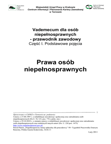 Wojewódzki Urząd Pracy w Krakowie Centrum Informacji i Planowania Kariery Zawodowej w Tarnowie Vademecum dla osób niepełnosprawnych - przewodnik zawodowy Część I. Podstawowe pojęcia Prawa osób niepełnosprawnych 1 Opracowano w CIiPKZ w Tarnowie na podstawie: Ustawy z 27.08.1997 r. o rehabilitacji zawodowej i społecznej oraz zatrudnianiu osób niepełnosprawnych (Dz.U. Nr 123, poz. 776 z późn. zm.) Ustawy z 29.10.2010 r. o zmianie ustawy o rehabilitacji zawodowej i społecznej oraz zatrudnianiu osób niepełnosprawnych oraz niektórych innych ustaw (Dz. U. 226 poz. 1475) http://www.niepelnosprawni.gov.pl/ Paweł Patora „Niepełnosprawny mniej opłacalny dla pracodawcy” 50+ Tygodnik Pracownika Emeryta Rencisty, Polska Gazeta Krakowska, 16.02.11 Luty 2011 Wojewódzki Urząd Pracy w Krakowie Centrum Informacji i Planowania Kariery Zawodowej w Tarnowie SPIS TREŚCI: Prawa osób niepełnosprawnych Jakie prawa mają osoby niepełnosprawne Uprawnienia i ulgi przysługujące osobom niepełnosprawnym Zatrudnianie osób niepełnosprawnych str. 3 str. 6 str. 9 2 Opracowano w CIiPKZ w Tarnowie na podstawie: Ustawy z 27.08.1997 r. o rehabilitacji zawodowej i społecznej oraz zatrudnianiu osób niepełnosprawnych (Dz.U. Nr 123, poz. 776 z późn. zm.) Ustawy z 29.10.2010 r. o zmianie ustawy o rehabilitacji zawodowej i społecznej oraz zatrudnianiu osób niepełnosprawnych oraz niektórych innych ustaw (Dz. U. 226 poz. 1475) http://www.niepelnosprawni.gov.pl/ Paweł Patora „Niepełnosprawny mniej opłacalny dla pracodawcy” 50+ Tygodnik Pracownika Emeryta Rencisty, Polska Gazeta Krakowska, 16.02.11 Luty 2011 Wojewódzki Urząd Pracy w Krakowie Centrum Informacji i Planowania Kariery Zawodowej w Tarnowie Jakie prawa mają osoby niepełnosprawne Konstytucja RP Prawo do niezależnego i godnego życia zapewnia każdemu obywatelowi Konstytucja Rzeczpospolitej Polskiej: Art.69. Osobom niepełnosprawnym władze publiczne udzielają, zgodnie z ustawą, pomocy w zabezpieczeniu egzystencji, przysposobieniu do pracy oraz komunikacji społecznej. Karta Praw Osób Niepełnosprawnych Podstawowym aktem prawnym regulującym prawa osób niepełnosprawnych jest Karta Praw Osób Niepełnosprawnych. Najważniejszym prawem niepełnosprawnych bez wątpienia jest prawo do normalnego życia. Osoby niepełnosprawne mają prawo do niezależnego, samodzielnego i aktywnego życia oraz nie mogą podlegać dyskryminacji. W szczególności osoby niepełnosprawne mają prawo do: dostępu do dóbr i usług umożliwiających pełne uczestnictwo w życiu społecznym, dostępu do leczenia i opieki medycznej, wczesnej diagnostyki, rehabilitacji i edukacji leczniczej, a także do świadczeń zdrowotnych uwzględniających rodzaj i stopień niepełnosprawności, w tym do zaopatrzenia w przedmioty ortopedyczne, środki pomocnicze, sprzęt rehabilitacyjny, dostępu do wszechstronnej rehabilitacji mającej na celu adaptację społeczną, nauki w szkołach wspólnie ze swymi pełnosprawnymi rówieśnikami, jak również do korzystania ze szkolnictwa specjalnego lub edukacji indywidualnej, pomocy psychologicznej, pedagogicznej i innej pomocy specjalistycznej umożliwiającej rozwój, zdobycie lub podniesienie kwalifikacji ogólnych i zawodowych, pracy na otwartym rynku pracy zgodnie z kwalifikacjami, wykształceniem i możliwościami oraz korzystania z doradztwa zawodowego i pośrednictwa, a gdy niepełnosprawność i stan zdrowia tego wymaga – prawo do pracy w warunkach dostosowanych do potrzeb niepełnosprawnych, 3 Opracowano w CIiPKZ w Tarnowie na podstawie: Ustawy z 27.08.1997 r. o rehabilitacji zawodowej i społecznej oraz zatrudnianiu osób niepełnosprawnych (Dz.U. Nr 123, poz. 776 z późn. zm.) Ustawy z 29.10.2010 r. o zmianie ustawy o rehabilitacji zawodowej i społecznej oraz zatrudnianiu osób niepełnosprawnych oraz niektórych innych ustaw (Dz. U. 226 poz. 1475) http://www.niepelnosprawni.gov.pl/ Paweł Patora „Niepełnosprawny mniej opłacalny dla pracodawcy” 50+ Tygodnik Pracownika Emeryta Rencisty, Polska Gazeta Krakowska, 16.02.11 Luty 2011 Wojewódzki Urząd Pracy w Krakowie Centrum Informacji i Planowania Kariery Zawodowej w Tarnowie zabezpieczenia społecznego uwzględniającego konieczność ponoszenia zwiększonych kosztów wynikających z niepełnosprawności, jak również uwzględnienia tych kosztów w systemie podatkowym, życia w środowisku wolnym od barier funkcjonalnych, w tym dostępu do urzędów, punktów wyborczych i obiektów użyteczności publicznej, swobodnego przemieszczania się i powszechnego korzystania ze środków transportu, dostępu do informacji, możliwości komunikacji międzyludzkiej, posiadania samorządnej reprezentacji swego środowiska oraz do konsultowania z nim wszelkich projektów aktów prawnych dotyczących osób niepełnosprawnych, pełnego uczestnictwa w życiu publicznym, społecznym, kulturalnym, artystycznym, sportowym oraz rekreacji i turystyce odpowiednio do swych zainteresowań i potrzeb. Prawa osób niepełnosprawnych są też przedmiotem regulacji ONZ w formie deklaracji pod nazwą Standardowe Zasady Wyrównywania Szans Osób Niepełnosprawnych. Zasady zostały przyjęte podczas 48 sesji Zgromadzenia Ogólnego Narodów Zjednoczonych w dniu 20 grudnia 1993 (Rezolucja 48/96). Chociaż Zasady nie są prawnie wiążące, dokument podkreśla, że mogą stać się międzynarodowym prawem zwyczajowym, gdy zostaną uznane przez większość państw. Ustawa o rehabilitacji zawodowej i społecznej oraz zatrudnianiu osób niepełnosprawnych Szczegółowemu uregulowaniu pomocy dla osób niepełnosprawnych w Polsce służy ustawa z dn. 27 sierpnia 1997r. o rehabilitacji zawodowej i społecznej oraz zatrudnianiu osób niepełnosprawnych (Dz.U. z 2008 r. Nr 14, poz. 92). Ustawa definiuje osoby niepełnosprawne, jako osoby, których stan fizyczny, psychiczny lub umysłowy trwale lub okresowo utrudnia, ogranicza bądź uniemożliwia wypełnianie ról społecznych, a w s