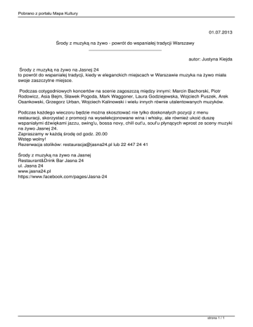Pobrano z portalu Mapa Kultury 01.07.2013 Środy z muzyką na żywo - powrót do wspaniałej tradycji Warszawy ____________________________ autor: Justyna Kiejda Środy z muzyką na żywo na Jasnej 24 to powrót do wspaniałej tradycji, kiedy w eleganckich miejscach w Warszawie muzyka na żywo miała swoje zaszczytne miejsce. Podczas cotygodniowych koncertów na scenie zagoszczą między innymi: Marcin Bachorski, Piotr Rodowicz, Asia Bejm, Sławek Pogoda, Mark Waggoner, Laura Godziejewska, Wojciech Puszek, Arek Osankowski, Grzegorz Urban, Wojciech Kalinowski i wielu innych równie utalentowanych muzyków. Podczas każdego wieczoru będzie można skosztować nie tylko doskonałych pozycji z menu restauracji, skorzystać z promocji na wyselekcjonowane wina i whisky, ale również ukoić duszę wspaniałymi dźwiękami jazzu, swing'u, bossa novy, chill out'u, soul'u płynących wprost ze sceny muzyki na żywo Jasnej 24. Zapraszamy w każdą środę od godz. 20.00 Wstęp wolny! Rezerwacja stolików: [email protected] lub 22 447 24 41 Środy z muzyką na żywo na Jasnej Restaurant&Drink Bar Jasna 24 ul. Jasna 24 www.jasna24.pl https://www.facebook.com/pages/Jasna-24 strona 1 / 1