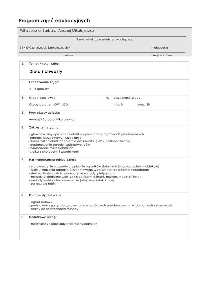 Program zajęć edukacyjnych Willa „Jasna; Barbara, Andrzej Mikołajewicz _______________________________________________________________________________________________ Nazwa obiektu / nazwisko prowadzącego 34-440 Czorsztyn, ul. Drohojowskich 7 małopolskie ______________________________________________________________________________________________________________________ Adres Województwo 1. Temat / tytuł zajęć: Zioła i chwasty 2. Czas trwania zajęć: 2 – 3 godziny 3. Grupa docelowa: Osoby dorosłe, KGW, LGD 5. 4. Liczebność grupy: min. 5 max. 20 Prowadzący zajęcia: Andrzej i Barbara Mikołajewicz 6. Zakres tematyczny: - 7. - główne rośliny uprawne i zielarskie uprawiane w ogródkach przydomowych ogródek przydomowy - urządzanie dobór roślin zielarskich zależnie od; klimatu, gleby, nasłonecznienia, rozplanowanie ogrodu, sąsiedztwo roślin rozmnażanie roślin zielarskich walka z chorobami i szkodnikami Harmonogram/przebieg zajęć: - 8. wprowadzenie w zasady urządzanie ogródków ziołowych (w ogrodzie lub w obiekcie) szkic urządzania ogródka przydomowego w zależności od potrzeb / upodobań siew roślin zielarskich, sporządzenie rozsady, pielęgnacja metody biologiczne walki ze szkodnikami (ślimaki, mszyce, mączliki i inne) metody walki z chorobami roślin (rdze, mączniaki i inne) sąsiedztwo roślin Pomoce dydaktyczne: - ogród ziołowy - podstawowy sprzęt do uprawy roślin w ogródkach przydomowych i w doniczkach / skrzynkach - rośliny do sporządzania rozsady 9. Dodatkowe uwagi: - możliwość zakupu sadzonek roślin zielarskich