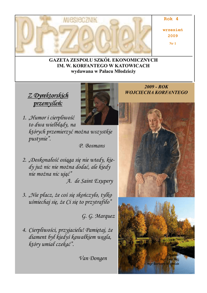 Rok 4 wrzesień 2009 Nr 1 GAZETA ZESPOŁU SZKÓŁ EKONOMICZNYCH IM. W. KORFANTEGO W KATOWICACH wydawana w Pałacu MłodzieŜy 2009 - ROK WOJCIECHA KORFANTEGO Z Dyrektorskich przemyśleń: 1. „Humor i cierpliwość to dwa wielbłądy, na których przemierzyć moŜna wszystkie pustynie”. P. Bosmans 2. „Doskonałość osiąga się nie wtedy, kiedy juŜ nic nie moŜna dodać, ale kiedy nie moŜna nic ująć” A. de Saint Exupery 3. „Nie płacz, Ŝe coś się skończyło, tylko uśmiechaj się, Ŝe Ci się to przytrafiło” G. G. Marquez 4. Cierpliwości, przyjacielu! Pamiętaj, Ŝe diament był kiedyś kawałkiem węgla, który umiał czekać”. Van Dongen Opieka: mgr Ewa Maj mgr Barbara Michniak 2 PRZECIEK Kalendarium Wrześniowe 1 września - Rozpoczęcie Roku Szkolnego / Międzynarodowy Dzień Pokoju 9 września - Międzynarodowy Dzień Urody 23 września - Pierwszy Dzień Jesieni 24 września - Światowy Dzień Serca 30 września - Dzień Chłopaka Wybrane Przysłowia o Wrześniu Jaki pierwszy wrzesień, taka będzie jesień. Skoro wrzesień, to juŜ jesień, ale jabłek pełna kieszeń. Tego wrzesień nie doparzy, czego sierpień nie dowarzy. We wrześniu, gdy tłuste ptaki, mróz w zimie nie lada jaki. Gdy wrzesień bez deszczów będzie, w zimie wiatrów pełno wszędzie. PRZECIEK Uroczysta inauguracja roku szkolnego 2009/2010 w naszej szkole W tak uroczystym dniu Zespół Szkół Ekonomicznych był gospodarzem Miejskiej Inauguracji roku szkolnego 2009/2010. Uroczystość rozpoczęła się mszą św. w Kościele pod wezwaniem Św. Piotra i Pawła, gdzie na zakończenie mszy św. młodzieŜ i goście mogli wysłuchać wystąpienia p. Krystyny Siejna- wiceprezydent Katowic oraz spektaklu słowno muzycznego z okazji 70 rocznicy śmierci Wojciecha Korfantego. Spektakl przygotowali mgr GraŜyna Pniok i mgr Leszek Sokołowski nauczyciele historii oraz uczniowie Technikum Nr 2. Druga część uroczystości odbyła się w budynku szkoły przy ulicy Raciborskiej 3. Gośćmi spotkania byli: • Wiceprezydent miasta Katowice p. Krystyna Siejna • Kierownik Wydziału Nadzoru Pedagogicznego w Katowicach p. Anna Kij • Dyrektor Wydziału Katechetycznego Kurii Metropolitarnej ks. Prałat dr Marceli Cogiel • Przedstawiciele związków zawodowych nauczycieli oraz radni miasta Katowice. Część druga składała się z wystąpienia p. dyrektor Anny Muc, która powitała przybyłych gości, młodzieŜ, a szczególnie nowo przybyłych uczniów klas pierwszych technikum. Następnie głos zabrała Kierownik Wydziału Nadzoru Pedagogicznego Kuratorium Oświaty w Katowicach pani Anna Kij, która w imieniu Śląskiego Kuratora Oświaty w Katowicach przekazała Ŝyczenia na najbliŜszy rok szkolny. Następnie głos zabrała pani wicedyrektor chwaląc szkołę za bardzo dobre wyniki na egzaminach zewnętrznych młodzieŜy klas programowo najwyŜszych. W dalszej części odbyło się uroczyste wręczenie legitymacji klasom pierwszym, ślubowanie na sztandar szkoły oraz złoŜenie wiązanek kwiatów pod tablicą Wojciecha Korfantego i Płaskorzeźbą Patrona przez delegacje klas. Całość była bardzo patriotycznym i emocjonalnym przeŜyciem dla całej społeczności szkoły. 3 4 PRZECIEK Korfanty obok nas... Wzrost – 175 cm, oczy – brązowe, włosy – blond, czoło – zwyczajne, nos – prosty, usta – średnie, broda – okrągła bez zarostu, cera – niekolorowa, brak znaków szczególnych – to dane paszportowe Wojciecha Korfantego, publicysty, obrońcy polskości, przywódcy powstań śląskich, posła i senatora Rzeczypospolitej Polskiej, społecznika, patrona naszej szkoły. W sierpniu obchodziliśmy okrągłą, siedemdziesiątą rocznicę jego śmierci, co stało się przyczynkiem do uczczenia tej daty przez Sejmik Województwa Śląskiego. Rok 2009 ustanowiono Rokiem Wojciecha Korfantego. To kolejne wyróŜnienie dla człowieka, którego imię noszą place, aleje, osiedla, szkoły, a nawet pociąg. W województwie opolskim zaś od 1946 roku istnieje gmina na prawach miejskich – Korfantów. Nasz bohater, jawił się jako osoba niezwykle energiczna, impulsywna i przedsiębiorcza. Doskonale wykształcony (władał biegle czterema językami) budził podziw i szacunek. Był jednak przede wszystkim człowiekiem z krwi i kości, Ślązakiem, który rozumiał i kochał ludzi. Od samego początku roku 2009 mogliśmy brać udział w wielu imprezach kulturalnych, wystawach, konferencjach, odczytach i koncertach poświęconych owemu wybitnemu Polakowi. Najlepszą ku temu okazją było chyba sierpniowe widowisko multimedialne na Placu Sejmu Śląskiego, którego organizacją zajął się zespół „Śląsk”. W ostatnich miesiącach jubileuszowego roku moŜemy jeszcze się wybrać do, znajdującego się w zabytkowym spichlerzu Muzeum Miejskiego w Siemianowicach Śląskich, mieście rodzinnym naszego patrona. 26 września o godz. 12:00, w ramach Wojewódzkich Warsztatów Krajoznawczych pt. „Z Wojciechem Korfan- tym przez Siemianowice Śląskie”, będzie miała miejsce prelekcja na temat działalności politycznej Korfantego. Nieco bliŜej, bo w Muzeum Historii Katowic, juŜ od dłuŜszego czasu istnieje moŜliwość zorganizowania lekcji historii poświęconej temu wybitnemu męŜowi stanu. Na miejscu moŜna równieŜ zakupić wydawnictwa na temat Korfantego. Ciekawostką jest fakt, iŜ w ramach konkursu organizowanego przez to muzeum, powstała strona internetowa poświęcona w całości Wojciechowi Korfantemu, gdzie oprócz cennych informacji znajdziemy równieŜ obszerną galerię zdjęć czy słownik gwary śląskiej. Oto adres wspomnianej strony: http://mhk.katowice.pl/korfanty/start.htm. W drodze powrotnej z Muzeum Historii Katowic moŜemy wstąpić na cmentarz przy ulicy Francuskiej, gdzie Korfanty został pochowany, i, juŜ bez pośredników, zamienić z nim kilka słów na osobności. mgr Sebastian Papuga PRZECIEK KĄCIK POETYCKI "Marzenie" Moim marzeniem jest przenieść si