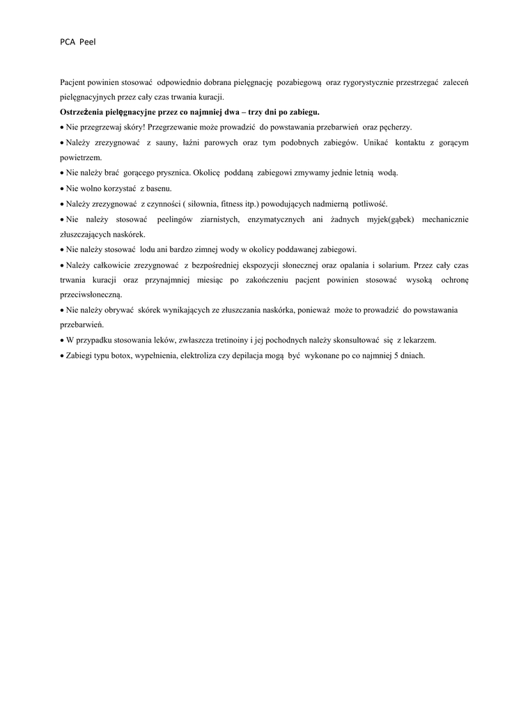 PCA Peel Pielęgnacja po zabiegu Pacjent powinien stosować odpowiednio dobrana pielęgnację pozabiegową oraz rygorystycznie przestrzegać zaleceń pielęgnacyjnych przez cały czas trwania kuracji. Ostrzeżenia pielęgnacyjne przez co najmniej dwa – trzy dni po zabiegu. • Nie przegrzewaj skóry! Przegrzewanie może prowadzić do powstawania przebarwień oraz pęcherzy. • Należy zrezygnować z sauny, łaźni parowych oraz tym podobnych zabiegów. Unikać kontaktu z gorącym powietrzem. • Nie należy brać gorącego prysznica. Okolicę poddaną zabiegowi zmywamy jednie letnią wodą. • Nie wolno korzystać z basenu. • Należy zrezygnować z czynności ( siłownia, fitness itp.) powodujących nadmierną potliwość. • Nie należy stosować peelingów ziarnistych, enzymatycznych ani żadnych myjek(gąbek) mechanicznie złuszczających naskórek. • Nie należy stosować lodu ani bardzo zimnej wody w okolicy poddawanej zabiegowi. • Należy całkowicie zrezygnować z bezpośredniej ekspozycji słonecznej oraz opalania i solarium. Przez cały czas trwania kuracji oraz przynajmniej miesiąc po zakończeniu pacjent powinien stosować wysoką ochronę przeciwsłoneczną. • Nie należy obrywać skórek wynikających ze złuszczania naskórka, ponieważ może to prowadzić do powstawania przebarwień. • W przypadku stosowania leków, zwłaszcza tretinoiny i jej pochodnych należy skonsultować się z lekarzem. • Zabiegi typu botox, wypełnienia, elektroliza czy depilacja mogą być wykonane po co najmniej 5 dniach.