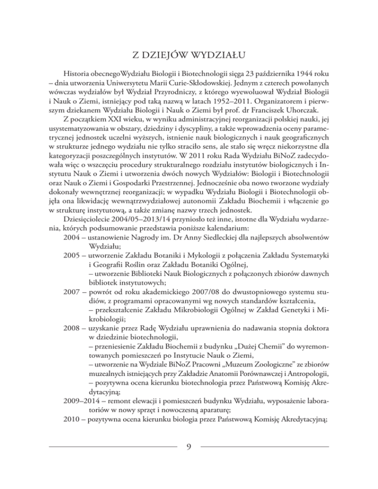 Z DZIEJÓW WYDZIAŁU Historia obecnegoWydziału Biologii i Biotechnologii sięga 23 października 1944 roku – dnia utworzenia Uniwersytetu Marii Curie-Skłodowskiej. Jednym z czterech powołanych wówczas wydziałów był Wydział Przyrodniczy, z którego wyewoluował Wydział Biologii i Nauk o Ziemi, istniejący pod taką nazwą w latach 1952–2011. Organizatorem i pierwszym dziekanem Wydziału Biologii i Nauk o Ziemi był prof. dr Franciszek Uhorczak. Z początkiem XXI wieku, w wyniku administracyjnej reorganizacji polskiej nauki, jej usystematyzowania w obszary, dziedziny i dyscypliny, a także wprowadzenia oceny parametrycznej jednostek uczelni wyższych, istnienie nauk biologicznych i nauk geograficznych w strukturze jednego wydziału nie tylko straciło sens, ale stało się wręcz niekorzystne dla kategoryzacji poszczególnych instytutów. W 2011 roku Rada Wydziału BiNoZ zadecydowała więc o wszczęciu procedury strukturalnego rozdziału instytutów biologicznych i Instytutu Nauk o Ziemi i utworzenia dwóch nowych Wydziałów: Biologii i Biotechnologii oraz Nauk o Ziemi i Gospodarki Przestrzennej. Jednocześnie oba nowo tworzone wydziały dokonały wewnętrznej reorganizacji; w wypadku Wydziału Biologii i Biotechnologii objęła ona likwidację wewnątrzwydziałowej autonomii Zakładu Biochemii i włączenie go w strukturę instytutową, a także zmianę nazwy trzech jednostek. Dziesięciolecie 2004/05–2013/14 przyniosło też inne, istotne dla Wydziału wydarzenia, których podsumowanie przedstawia poniższe kalendarium: 2004 – ustanowienie Nagrody im. Dr Anny Siedleckiej dla najlepszych absolwentów Wydziału; 2005 – utworzenie Zakładu Botaniki i Mykologii z połączenia Zakładu Systematyki i Geografii Roślin oraz Zakładu Botaniki Ogólnej, – utworzenie Biblioteki Nauk Biologicznych z połączonych zbiorów dawnych bibliotek instytutowych; 2007 – powrót od roku akademickiego 2007/08 do dwustopniowego systemu studiów, z programami opracowanymi wg nowych standardów kształcenia, – przekształcenie Zakładu Mikrobiologii Ogólnej w Zakład Genetyki i Mikrobiologii; 2008 – uzyskanie przez Radę Wydziału uprawnienia do nadawania stopnia doktora w dziedzinie biotechnologii, – przeniesienie Zakładu Biochemii z budynku „Dużej Chemii” do wyremontowanych pomieszczeń po Instytucie Nauk o Ziemi, – utworzenie na Wydziale BiNoZ Pracowni „Muzeum Zoologiczne” ze zbiorów muzealnych istniejących przy Zakładzie Anatomii Porównawczej i Antropologii, – pozytywna ocena kierunku biotechnologia przez Państwową Komisję Akredytacyjną; 2009–2014 – remont elewacji i pomieszczeń budynku Wydziału, wyposażenie laboratoriów w nowy sprzęt i nowoczesną aparaturę; 2010 – pozytywna ocena kierunku biologia przez Państwową Komisję Akredytacyjną; 9 2011 – rezygnacja Wydziału BiNoZ ze wspólnego z Wydziałem Chemii prowadzenia kierunku ochrona środowiska; Senat UMCS powierza prowadzenie tego kierunku Wydziałowi Chemii, – podjęcie w dniu 25 maja przez Senat UMCS uchwały o przekształceniu Wydziału Biologii i Nauk o Ziemi w dwa Wydziały: Biologii i Biotechnologii oraz Nauk o Ziemi i Gospodarki Przestrzennej, z jednoczesnymi zmianami w strukturze wewnętrzej obu jednostek, – Nagroda Naukowa Marii Curie dla zespołu prof. dr. hab. Nikodema Grankowskiego za prace nad szczepionką przeciwko malarii, – przeniesienie dziekanatu Wydziału BiB z rektoratu do budynku Wydziału; 2012 – uruchomienie studiów III stopnia (doktoranckich) na kierunku biotechnologia; 2013 – Nagroda Naukowa Marii Curie dla zespołu prof. dr. hab. Janusza Szczodraka za opracowanie przemysłowej technologii produkcji mutanazy; 2014 – budowa nowych szklarni i hali wegetacyjnej; – pozytywna ocena instytucjonalna Wydziału Biologii i Biotechnologii przez Polską Komisję Akredytacyjną. WŁADZE WYDZIAŁU W LATACH 2004/05 – 2013/14 WYDZIAŁ BIOLOGII I NAUK O ZIEMI Dziekan: Prodziekani: Dziekan: Prodziekani: 2004/2005 prof. dr hab. Nikodem Grankowski dr hab. Jacek Łętowski, prof. nadzw. dr hab. Bogusław Kaszewski, prof. nadzw. Dziekan: Prodziekani: 2008/2009 – 2010/2011 prof. dr hab. Anna Tukiendorf prof. dr hab. Maria Łanczont prof. dr hab. Kazimierz Trębacz 2005/2006 – 2007/2008 prof. dr hab. Ryszard Dębicki prof. dr hab. Jerzy Rogalski dr hab. Andrzej Świeca, prof. nadzw. 10 WYDZIAŁ BIOLOGII I BIOTECHNOLOGII Dziekan: Prodziekani: 2011/2012 prof. dr hab. Anna Tukiendorf prof. dr hab. Kazimierz Trębacz dr hab. Adam Choma Dziekan: Prodziekani: od 2012/2013 prof. dr hab. Kazimierz Trębacz dr hab. Magdalena Staszczak dr hab. Adam Choma REKTORZY UNIWERSYTETU MARII CURIE SKŁODOWSKIEJ Z WYDZIAŁU BIOLOGII I NAUK O ZIEMI prof. dr hab. Marian Harasimiuk prof. dr hab. Anna Tukiendorf prof. dr hab. Ryszard Dębicki Rektor prorektor prorektor 2002–2005 2005–2008 od 2008 STRUKTURA WYDZIAŁU BIOLOGII I BIOTECHNOLOGII Dziekan: prof. dr hab. Kazimierz Trębacz Zakład Biofizyki Instytut Biologii i Biochemii Prodziekani: dr hab. Magdalena Staszczak Zakład Biochemii Instytut Biologii i Biochemii dr hab. Adam Choma Zakład Genetyki i Mikrobiologii Instytut Mikrobiologii i Biotechnologii 11 W skład Wydziału Biologii i Biotechnologii wchodzą dwa Instytuty: Biologii i Biochemii z 14 jednostkami oraz Mikrobiologii i Biotechnologii z 5 jednostkami. Pozainstytutowymi jednostkami są: Pracownia Mikroskopii Elektronowej, Pracownia Komputerowa, Pracownia „Muzeum Zoologiczne”, a także Biblioteka Nauk Biologicznych. Wydział posiada muzeum grzybów w Zakładzie Biochemii i muzea zielnikowe przy Zakładach Botaniki i Mykologii oraz Geobotaniki. Kadra naukowo-dydaktyczna Wydziału na początku roku kalendarzowego 2014 przedstawia się następująco: 16 profesorów tytularnych, 29 pozostałych pracowników naukowo-dydaktycznych posiadających stopień doktora habilitowanego (na stanowiskach profesorów nadzwyczajnych lub adiunktów), 74 doktorów (na stanowiskach asyst
