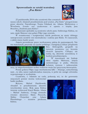 Sprawozdanie ze sztuki teatralnej: ,,Pan Kleks” 22 października 2014 roku uczniowie klas czwartych naszej szkoły obejrzeli przedstawienie pod tytułem „Pan Kleks” przygotowane przez aktorów Narodowego Teatru Edukacji im. Adama Mickiewicza z Wrocławia. Zostało ono zrealizowane w oparciu o książkę Jana Brzechwy,,Akademia pana Kleksa”. Bohaterami spektaklu są uczniowie szkoły pana Ambrożego Kleksa, on sam, szpak Mateusz oraz golarz Filip i jego synowie. W roztańczonej i rozśpiewanej szkole profesora na straży dobrego samopoczucia uczniów stoi niestrudzony i szalony pan Kleks. To nauczyciel, o jakim marzy każdy uczeń. Zajęcia prowadzone przez wychowawcę należą do pasjonujących. Nie ma matematyki, przyrody czy języka polskiego. Zastępują je lekcje: przędzenia liter, kleksografii, geografii na świeżym powietrzu czy leczenia chorych sprzętów. Chłopcy nie nudzą się, aktywnie uczestniczą w każdym przedsięwzięciu. W inscenizacji nie brakuje także szpaka Mateusza, księcia zamienionego w ptaka. Historia bohatera wzrusza i jednocześnie uczy, że nieposłuszeństwo wobec rodziców może być przyczyną nieszczęścia. Postać golarza Filipa i jego mechanicznej lalki – Alojzego, uzmysławiają nam , że nikt, nawet najdoskonalsza maszyna, w pełni nie zastąpi człowieka wyposażonego w wyobraźnię. Uczniowie, z Adasiem na czele, pokazują też, że do gotowania smacznych potraw można wykorzystać bańki mydlane. Reżyser, Michał Hachlowski, obsadził w przedstawieniu aktorów wrocławskiej sceny. Rolę pana Kleksa świetnie wykreował Karol Basim, Adasia – Michał Ambroży. Uwagę zwracało również aktorstwo Marty Pszczoły, Maliny Chojeckiej oraz Adama Plewińskiego – uczniów profesora Kleksa. Uwadze widza nie mogła umknąć scenografia, opracowana przez Małgorzatę Satorę, wspaniale podkreślana przez grę świateł, za którą odpowiedzialny był Stanisław Lencki, koordynator pracy artystycznej. W klimat baśni przenieśliśmy się również za sprawą wspaniałych kostiumów. Pan Kleks wyglądał tak, jak go sobie wyobraziliśmy. Dramaturgię niektórych wydarzeń uwydatniała muzyka skomponowana przez Michała Kowalczyka. Myślę, że spektakl ten jest prawdziwą ucztą dla miłośników teatru. Gorąco zachęcam do jego obejrzenia. Nikt, kto wybierze się na przedstawienie ,,Pan Kleks”, nie będzie się nudził. Opracowała: Markiewicz Renata Łuciakiewicz Andżelika Zdjęcia: http://www.narodowyteatredukacji.pl/repertuar/pan-kleks/