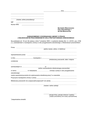 , dnia (nazwa, adres pracodawcy) NIP Numer KRS Burmistrz Mszczonowa Plac Piłsudskiego 1 96-320 Mszczonów ZAWIADOMIENIE O ROZWIĄZANIU UMOWY O PRACĘ Z MŁODOCIANYM PRACOWNIKIEM W CELU PRZYGOTOWANIA ZAWODOWEGO Na podstawie art. 16 ust. 6b ustawy z dnia 7 września 1991r. o systemie oświaty (Dz. U. z 2015r. poz. 2156 j.t.), zawiadamiam o rozwiązaniu umowy w celu przygotowania zawodowego z młodocianym pracownikiem: Firma (pełna nazwa, adres, nr telefonu) reprezentowana przez w dniu rozwiązała z (młodociany pracownik, data i miejsce urodzenia) . zamieszkałym w nr domu , ul. (adres zamieszkania młodocianego pracownika) nr mieszkania umowę o pracę w celu przygotowania zawodowego: nauka zawodu/przyuczenie do wykonywania określonej pracy*) w zawodzie Przyczyna rozwiązania umowy o pracę Młodociany pracownik nie uczęszczał/uczęszczał*) do szkoły (nazwa i adres szkoły) pieczęć firmy, pieczęć imienna i czytelny podpis pracodawcy lub osoby upoważnionej *)niepotrzebne skreślić