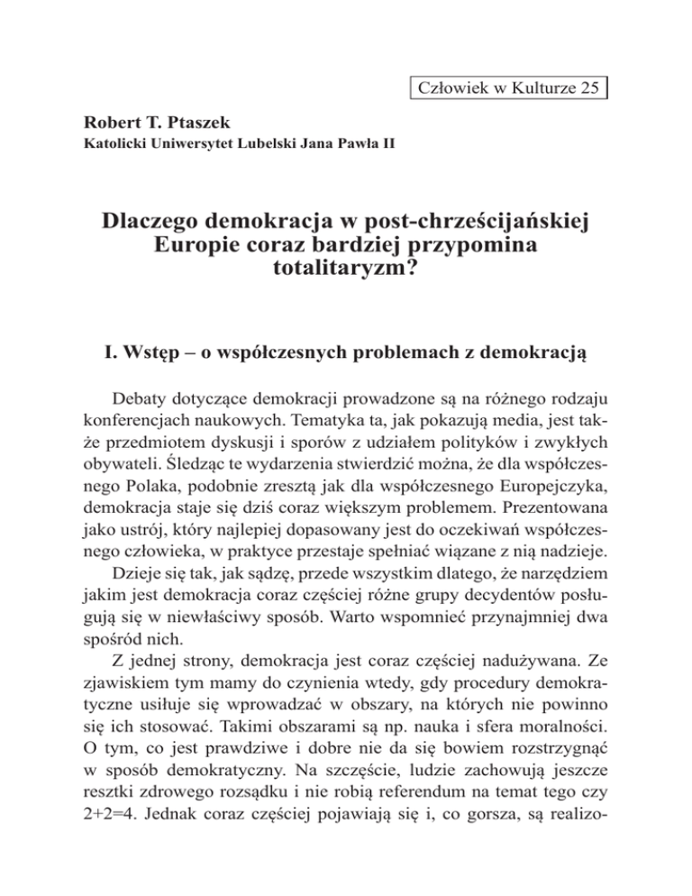 Człowiek w Kulturze 25 Robert T. Ptaszek Katolicki Uniwersytet Lubelski Jana Pawła II Dlaczego demokracja w post-chrześcijańskiej Europie coraz bardziej przypomina totalitaryzm? I. Wstęp – o współczesnych problemach z demokracją Debaty dotyczące demokracji prowadzone są na różnego rodzaju konferencjach naukowych. Tematyka ta, jak pokazują media, jest także przedmiotem dyskusji i sporów z udziałem polityków i zwykłych obywateli. Śledząc te wydarzenia stwierdzić można, że dla współczesnego Polaka, podobnie zresztą jak dla współczesnego Europejczyka, demokracja staje się dziś coraz większym problemem. Prezentowana jako ustrój, który najlepiej dopasowany jest do oczekiwań współczesnego człowieka, w praktyce przestaje spełniać wiązane z nią nadzieje. Dzieje się tak, jak sądzę, przede wszystkim dlatego, że narzędziem jakim jest demokracja coraz częściej różne grupy decydentów posługują się w niewłaściwy sposób. Warto wspomnieć przynajmniej dwa spośród nich. Z jednej strony, demokracja jest coraz częściej nadużywana. Ze zjawiskiem tym mamy do czynienia wtedy, gdy procedury demokratyczne usiłuje się wprowadzać w obszary, na których nie powinno się ich stosować. Takimi obszarami są np. nauka i sfera moralności. O tym, co jest prawdziwe i dobre nie da się bowiem rozstrzygnąć w sposób demokratyczny. Na szczęście, ludzie zachowują jeszcze resztki zdrowego rozsądku i nie robią referendum na temat tego czy 2+2=4. Jednak coraz częściej pojawiają się i, co gorsza, są realizo- 222 Robert T. Ptaszek wane pomysły, aby wszelkie zasady i reguły postępowania tworzyć pytając ludzi o poglądy na dany temat (np. w referendum) i uznając opinię większości za obowiązujące prawo. Prowadzi to do groźnej sytuacji, w której większością głosów chce się rozstrzygać czy aborcja, eutanazja, gwałt albo kradzież są dobre czy złe. Jako wymowny przykład takiego działania wskazać można sytuację, gdy: „W korespondencyjnym głosowaniu z roku 1974 członkowie Amerykańskiego Stowarzyszenia Psychiatrycznego (APA) przegłosowali […] usunięcie homoseksualizmu ze swego katalogu zaburzeń psychicznych. Głosowanie poprzedzone było szalonym, a czasem brutalnym lobbingiem: spotkania stowarzyszenia były szturmowane przez aktywistów Gay Lib”1. Sądzę, że nawet największy zwolennik demokracji powinien mieć wątpliwości, czy tak ważna decyzja powinna być podjęta przez głosowanie, zwłaszcza, że wbrew deklaracjom powtarzanym chętnie przez środowiska wspierające „odmienne orientacje seksualne”, za decyzją tą nie stały dane uzyskane w trakcie prowadzonych nowych badań naukowych. Z drugiej strony, coraz częściej dostrzega się, że z narzędzia zwanego demokracją nie korzysta się w sytuacjach, w których głos społeczeństwa rzeczywiście powinien być uwzględniony i wysłuchany. O jednym z najbardziej jaskrawych przykładów takiej działalności polskiego parlamentu tak pisał na swojej stronie internetowej „Dziennik”: „Milion podpisów zebranych pod wnioskiem w sprawie referendum edukacyjnego trafiło do kosza. Posłowie odrzucili wniosek o to, by między innymi w sprawie wysyłania sześciolatków do szkół, wypowiedzieli się Polacy. Ekspertów to nie dziwi, bo jak podkre- 1 R. Porter, Bringing Order to Mental Disorders, „Nature” Vol. 389 (1997) No. 6654, s. 805–806, cyt. za: Dlaczego homoseksualizm został wykreślony z listy chorób psychicznych? [online], [dostęp: 1 IV 2014], dostępny w Internecie: <http://www.homoseksualizm.edu.pl/index.php/co-mowi-nauka/34-psychologia/181-dlaczego-homoseksualizm-zosta-wykrelony-z-listy-chorob-psychicznych#przypis1>. „Homoseksualizm został wykreślony z listy chorób przy 5816 głosów za i 3817 przeciw” (tamże). Dlaczego demokracja w post-chrześcijańskiej Europie... 223 ślają, od ponad dwudziestu lat obywatele i tak praktycznie głosu nie mają”2. W tej sytuacji nie dziwi fakt, że demokracja coraz częściej bywa krytykowana. Krytyka ta przybiera zwykle trzy formy. Pierwsza z nich ma postać krótkich, konkretnych zarzutów wyrażanych często w formie aforyzmów. Najbardziej znane są chyba te, które formułował N. Gómez Dávila3. Oto próbka: „Liberalna demokracja to reżim, w którym demokracja poniża wolność zanim ją zdławi. Błądzić jest rzeczą ludzką, kłamać demokratyczną. Demokratyczne wybory rozstrzygają o tym, kto będzie uciskany w majestacie prawa. Polityk demokratyczny zawsze się sprzedaje. Bogatym za gotówkę. Biednym na raty. Rewolucje przerażają, ale kampanie wyborcze wzbudzają obrzydzenie. Według demokraty mieć rację to ryczeć w najsilniejszym chórze”4. Druga forma to opis i analiza konkretnych wynaturzeń demokracji. Przykładem może tu być coraz częściej badany mechanizm „demokracji medialnej”. Zjawisko to opisuje się następująco: „Zmieniła się świadomość uczestniczenia w świecie polityki. Czytając prasę, słuchając radia, ale przede wszystkim oglądając telewizję odnosimy wrażenie bezpośredniego uczestniczenia w życiu politycznym. Media dostarczają zadziwiających możliwości upowszechniania. Telewidz, zarówno przez treść tego, co widzi – cały kraj czy nawet świat – jak i przez obrzęd, w którym uczestniczą dziesiątki milionów jego rodaków czy ludzi z całego świata oglądając równocześnie tę samą rzecz 2 Milion podpisów trafiło do kosza. Politolog: Tusk za to zapłaci, „Dziennik.pl” [online], [dostęp: 1 IV 2014], dostępny w Internecie: <http://wiadomosci.dziennik. pl/opinie/artykuly/442698,sejm-odrzucil-referendum-annusewicz-tusk-za-to-zaplaci. html> [podkreślenia – R. T. P.]. 3 Kolumbijski konserwatywny myśliciel i aforysta (1913–1994). 4 Cytaty zebrane przez autora. 224 Robert T. Ptaszek na małym ekranie, doznaje wstrząsu, jeśli chodzi o jego poczucie wspólnoty politycznej. […] Ten nadmiar informacji […]