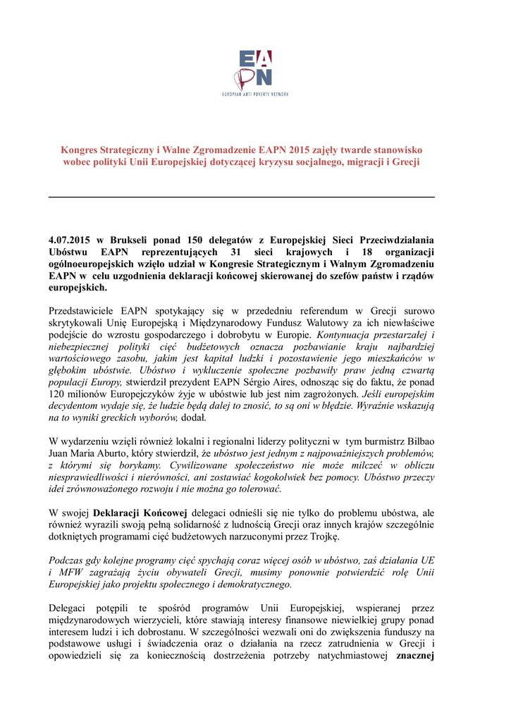 Kongres Strategiczny i Walne Zgromadzenie EAPN 2015 zajęły twarde stanowisko wobec polityki Unii Europejskiej dotyczącej kryzysu socjalnego, migracji i Grecji 4.07.2015 w Brukseli ponad 150 delegatów z Europejskiej Sieci Przeciwdziałania Ubóstwu EAPN reprezentujących 31 sieci krajowych i 18 organizacji ogólnoeuropejskich wzięło udział w Kongresie Strategicznym i Walnym Zgromadzeniu EAPN w celu uzgodnienia deklaracji końcowej skierowanej do szefów państw i rządów europejskich. Przedstawiciele EAPN spotykający się w przededniu referendum w Grecji surowo skrytykowali Unię Europejską i Międzynarodowy Fundusz Walutowy za ich niewłaściwe podejście do wzrostu gospodarczego i dobrobytu w Europie. Kontynuacja przestarzałej i niebezpiecznej polityki cięć budżetowych oznacza pozbawianie kraju najbardziej wartościowego zasobu, jakim jest kapitał ludzki i pozostawienie jego mieszkańców w głębokim ubóstwie. Ubóstwo i wykluczenie społeczne pozbawiły praw jedną czwartą populacji Europy, stwierdził prezydent EAPN Sérgio Aires, odnosząc się do faktu, że ponad 120 milionów Europejczyków żyje w ubóstwie lub jest nim zagrożonych. Jeśli europejskim decydentom wydaje się, że ludzie będą dalej to znosić, to są oni w błędzie. Wyraźnie wskazują na to wyniki greckich wyborów, dodał. W wydarzeniu wzięli również lokalni i regionalni liderzy polityczni w tym burmistrz Bilbao Juan Maria Aburto, który stwierdził, że ubóstwo jest jednym z najpoważniejszych problemów, z którymi się borykamy. Cywilizowane społeczeństwo nie może milczeć w obliczu niesprawiedliwości i nierówności, ani zostawiać kogokolwiek bez pomocy. Ubóstwo przeczy idei zrównoważonego rozwoju i nie można go tolerować. W swojej Deklaracji Końcowej delegaci odnieśli się nie tylko do problemu ubóstwa, ale również wyrazili swoją pełną solidarność z ludnością Grecji oraz innych krajów szczególnie dotkniętych programami cięć budżetowych narzuconymi przez Trojkę. Podczas gdy kolejne programy cięć spychają coraz więcej osób w ubóstwo, zaś działania UE i MFW zagrażają życiu obywateli Grecji, musimy ponownie potwierdzić rolę Unii Europejskiej jako projektu społecznego i demokratycznego. Delegaci potępili te spośród programów Unii Europejskiej, wspieranej przez międzynarodowych wierzycieli, które stawiają interesy finansowe niewielkiej grupy ponad interesem ludzi i ich dobrostanu. W szczególności wezwali oni do zwiększenia funduszy na podstawowe usługi i świadczenia oraz o działania na rzecz zatrudnienia w Grecji i opowiedzieli się za koniecznością dostrzeżenia potrzeby natychmiastowej znacznej redukcji, jeśli nie umorzenia jej zadłużenia. Podstawą polityki migracyjnej UE muszą być prawa człowieka! W swojej Deklaracji Końcowej delegaci wyrazili również troskę związaną z narastającym kryzysem humanitarnym, którego ofiarami są przymusowi migranci i uchodźcy na granicach Unii Europejskiej. Według szacunków 22 000 migrantów zginęło na Morzu Śródziemnym w latach 2000-2014 podczas próby podróży do Europy. Członkowie EAPN wezwali Unię Europejską do szybkiej i odpowiedniej reakcji na kryzys humanitarny wywołany przymusową migracją. Czas by Unia Europejska pokazała, że poważnie podchodzi do swych podstawowych zasad solidarności, poszanowania demokracji i praw człowieka, podkreślił przewodniczący EAPN Sérgio Aires. Delegaci wezwali do wykorzystania Europejskiej Konwencji Praw Człowieka jako głównego narzędzia kierującego działaniami zmierzającymi do rozwiązania kryzysu humanitarnego. Delegaci EAPN pozytywnie ocenili wsparcie i solidarność okazywane przez mieszkańców rejonu Morza Śródziemnego wobec uchodźców i migrantów, wtedy i tam, gdzie najbardziej go potrzebują, zaraz po przybyciu do Europy. Ich działania są przykładem człowieczeństwa, który powinien być wzorem dla każdego z nas, podkreślał Sérgio Aires: To właśnie ludność Lampedusy, podobnie jak wielu innych gmin śródziemnomorskich wspiera ludzi, którzy ledwo przeżyli podroż przez morze i pomaga im. Cieszę się, że podzielają państwo moją opinię, że taki humanitaryzm zasługuje na co najmniej Pokojową Nagrodę Nobla. Walne Zgromadzenie stało się kluczową okazją dla członków i sieci krajowych EAPN oraz ogólnoeuropejskich organizacji członkowskich, do omówienia nowego planu strategicznego EAPN i wyboru nowego zarządu. Europejska Sieć Przeciwdziałania Ubóstwu Deklaracja Końcowa Walne Zgromadzenie Bilbao, 4.07.2015 Wspólne działania instytucji europejskich i Europejskiego Funduszu Walutowego stanowią zagrożenie dla życia mieszkańców Grecji. Konieczne jest potwierdzenie roli Unii Europejskiej jako projektu demokratycznego i socjalnego. Ponad stu pięćdziesięciu delegatów z Europejskiej Sieci Przeciwdziałania Ubóstwu (EAPN) reprezentujących 31 sieci krajowych i 18 organizacji ogólnoeuropejskich spotkało się w Bilbao na corocznym Walnym Zgromadzeniu EAPN. Delegaci wyrazili głębokie poczucie solidarności z mieszkańcami Grecji i pozostałych krajów ponoszących konsekwencje niebezpiecznych programów cięć budżetowych, które pogłębiły ubóstwo i zniszczyły życie wielu Europejczykom. Zgromadzenie wezwało szefów państw i rządów do postawienia dobrostanu ludzi ponad względami czysto finansowymi, na których korzysta niewielka mniejszość, oraz wezwało do natychmiastowego uwolnienia środków na zwiększenie zatrudnienia i na wspieranie podstawowych usług i świadczeń dla mieszkańców Grecji i innych krajów odczuwających skutki programów oszczędnościowych. Delegaci uznali też, że nadszedł czas, aby dostrzec potrzebę natychmiastowej restrukturyzacji, jeśli nie redukcji zadłużenia. Ponadto zaniepokojeni delegaci EAPN wezwali unijnych szefów państw i rządów, a także Komisję Europejską do niezwłocznej odpowiedzi na kryzys humanitarny rozwijają