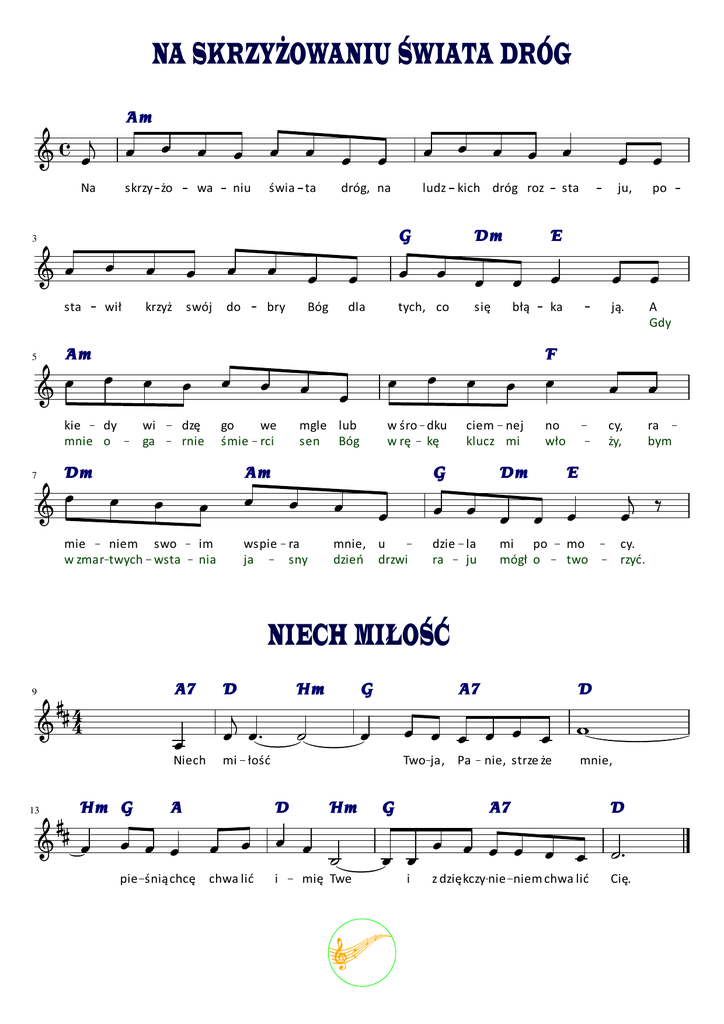 NA SKRZYŻOWANIU ŚWIATA DRÓG Am Na skrzy żo wa niu świa ta dróg, na ludz kich dróg roz G 3 sta wił krzyż swój do Bóg dla ju, po tych, co się błą ka ją. A Gdy cy, ży, ra bym F E Am 5 sta Dm bry kie dy mnie o wi ga dzę rnie go we śmie rci Dm 7 mgle lub sen Bóg w śro dku w rę kę Am G ciem nej klucz mi Dm im nia wspie ra ja sny mnie, u dzień drzwi E mo two cy. rzyć. mie niem swo w zmar twych wsta no wło dzie la ra ju mi po mógł o NIECH MIŁOŚĆ A7 9 4 4 D Hm G A7 D Two ja, Pa mnie, Niech 13 Hm G mi łość A pie śnią chcę D chwa lić Hm i G A7 mię Twe C nie, strze że i D z dzię kczy nie niem chwa lić Cię.
