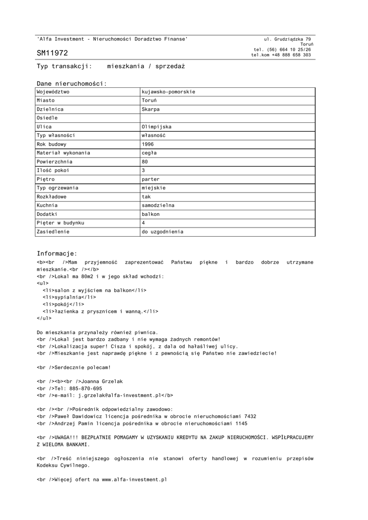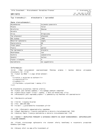 'Alfa Investment - Nieruchomości Doradztwo Finanse' ul. Grudziądzka 79 Toruń tel. (56) 664 10 25/26 tel.kom +48 888 658 303 SM11972 Typ transakcji: mieszkania / sprzedaż Dane nieruchomości: Województwo kujawsko-pomorskie Miasto Toruń Dzielnica Skarpa Osiedle Ulica Olimpijska Typ własności własność Rok budowy 1996 Materiał wykonania cegła Powierzchnia 80 Ilość pokoi 3 Piętro parter Typ ogrzewania miejskie Rozkładowe tak Kuchnia samodzielna Dodatki balkon Pięter w budynku 4 Zasiedlenie do uzgodnienia Informacje: <b><br />Mam przyjemność zaprezentować mieszkanie.<br /></b> <br />Lokal ma 80m2 i w jego skład wchodzi: <ul> <li>salon z wyjściem na balkon</li> <li>sypialnia</li> <li>pokój</li> <li>łazienka z prysznicem i wanną.</li> </ul> Państwu piękne i bardzo dobrze utrzymane Do mieszkania przynależy również piwnica. <br />Lokal jest bardzo zadbany i nie wymaga żadnych remontów! <br />Lokalizacja super! Cisza i spokój, z dala od hałaśliwej ulicy. <br />Mieszkanie jest naprawdę piękne i z pewnością się Państwo nie zawiedziecie! <br />Serdecznie polecam! <br /><b><br />Joanna Grzelak <br />Tel: 885-870-695 <br />e-mail: [email protected]</b> <br /><br />Pośrednik odpowiedzialny zawodowo: <br />Paweł Dawidowicz licencja pośrednika w obrocie nieruchomościami 7432 <br />Andrzej Pamin licencja pośrednika w obrocie nieruchomościami 1145 <br />UWAGA!!! BEZPŁATNIE POMAGAMY W UZYSKANIU KREDYTU NA ZAKUP NIERUCHOMOŚCI. WSPÓŁPRACUJEMY Z WIELOMA BANKAMI. <br />Treść niniejszego Kodeksu Cywilnego. ogłoszenia nie stanowi <br />Więcej ofert na www.alfa-investment.pl oferty handlowej w rozumieniu przepisów Cena: 410 000 PLN Dokument wygenerowany ze strony www.alfa-investment.pl Strona 2