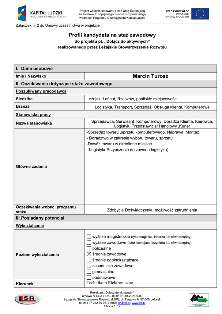 Projekt współfinansowany przez Unię Europejską ze środków Europejskiego Funduszu Społecznego w ramach Programu Operacyjnego Kapitał Ludzki Załącznik nr 2 do Umowy uczestnictwa w projekcie Profil kandydata na staż zawodowy do projektu pt. „Dołącz do aktywnych” realizowanego przez Leżajskie Stowarzyszenie Rozwoju I. Dane osobowe Imię i Nazwisko Marcin Turosz II. Oczekiwania dotyczące stażu zawodowego Poszukiwany pracodawca Leżajsk, Łańcut, Rzeszów, pobliskie miejscowości Siedziba Branża Logistyka, Transport, Sprzedaż, Obsługa klienta, Komputerowa Stanowisko pracy Sprzedawca, Serwisant Komputerowy, Doradza Klienta, Kierowca, Logistyk, Przedstawiciel Handlowy ,Kurier -Sprzedaż towaru ,sprzętu komputerowego, Naprawa ,Montaż - Doradztwo w zakresie wyboru towaru, sprzętu -Dowóz towaru w określone miejsce - Logistyk( Przyuczenie do zawodu logistyka) Nazwa stanowiska Główne zadania Oczekiwania wobec programu stażu Zdobycie Doświadczenia, możliwość zatrudnienia III. Posiadany potencjał Wykształcenie Poziom wykształcenia Kierunek wyższe magisterskie (tytuł magistra, lekarza lub równorzędny) wyższe zawodowe (tytuł licencjata, inżyniera lub równorzędny) policealne średnie zawodowe średnie ogólnokształcące zasadnicze zawodowe gimnazjalne podstawowe Technikum Elektroniczne Projekt pt. „Dołącz do aktywnych” umowa nr UDA-POKL.06.01.01-18-202/09-00 Leżajskie Stowarzyszenie Rozwoju (LSR), ul. Targowa 9, 37-300 Leżajsk tel./fax 17 242 79 08, e-mail: [email protected], www.lsr.pl Strona 1 z 2 Projekt współfinansowany przez Unię Europejską ze środków Europejskiego Funduszu Społecznego w ramach Programu Operacyjnego Kapitał Ludzki Specjalizacja Technik Elektronik Zawód wyuczony Elektronik Doświadczenie zawodowe Miejsce pracy/stażu Brak Opis zadań wykonywanych Brak Szkolenia i certyfikaty Własna Firma, Kurs Koparko-Ładowarka Szkolenia: Cisco-IT Essentials: PC Hardware and Software Cisco-CNNA Certyfikaty: Języki obce Poziom znajomości języków j. angielski słabo 1 2 3 4 5 biegle j. niemiecki słabo 1 2 3 4 5 biegle j. francuski słabo 1 2 3 4 5 biegle inny jaki? ……………………………… słabo 1 2 3 4 5 biegle Prawo jazdy A Kategoria B C D T BE Znajomość programów komputerowych Nazwa programu – poziom znajomości (słabo, dobrze, bardzo dobrze) Pakiet MS Office-Dobrze Systemy Operacyjna Windows- Dobrze Adobe Photoshop-dobrze Dodatkowe informacje Zainteresowania (np. hobby), aktywność (np. społeczna), przynależność do organizacji itp. Komputery, Sport, Filmy, Muzyka Projekt pt. „Dołącz do aktywnych” umowa nr UDA-POKL.06.01.01-18-202/09-00 Leżajskie Stowarzyszenie Rozwoju (LSR), ul. Targowa 9, 37-300 Leżajsk tel./fax 17 242 79 08, e-mail: [email protected], www.lsr.pl Strona 2 z 2 CE DE brak