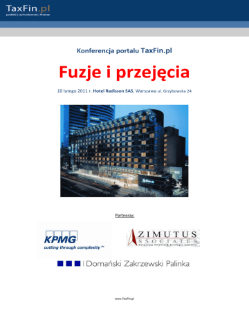Konferencja portalu TaxFin.pl Fuzje i przejęcia 10 lutego 2011 r. Hotel Radisson SAS, Warszawa ul. Grzybowska 24 Partnerzy: www.TaxFin.pl Prowadzący: Jacek Byrt, partner i członek zarządu Azimutus S.A. Ponad 10-letnie doświadczenie w doradztwie strategicznym i corporate finance. Specjalizuje się w fuzjach i przejęciach, w szczególności w obszarze poszukiwania inwestorów/celów do przejęcia, strukturyzowania finansowego transakcji i prowadzenia negocjacji. Pracował w sektorze usług finansowych, telekomunikacji, dla firm produkcyjnych, dla funduszy private equity. Wspierał zagranicznych inwestorów branżowych w procesie wejścia na polski rynek poprzez akwizycje, pracował dla polskich przedsiębiorców poszukujących kapitału na rozwój, brał udział w transakcjach restrukturyzacyjnych. Społecznie pełni funkcję prezesa zarządu Poznaoskiego Inkubatora Przedsiębiorców Sp. z o.o. Zdobywał wcześniejsze doświadczenie pracując w takich spółkach jak McKinsey & Company, a także w bankowości korporacyjnej w BZ WBK oraz w bankowości inwestycyjnej, m.in. w Dresdner Kleinwort Benson w Niemczech. Jest absolwentem Szkoły Głównej Handlowej i London School of Economics; posiada dyplom CEMS Master. Błażej Podstawski, adwokat, senior associate kancelarii Domaoski Zakrzewski Palinka Specjalizuje się w prawie spółek oraz prawie cywilnym. Zajmuje się m.in. doradztwem z zakresu transakcji fuzji i przejęd, w tym połączeo transgranicznych, relacji między wspólnikami, nabywania przedsiębiorstw, zmian kapitałowych, procesów likwidacyjnych. Bierze udział w projektach dla firm z różnych sektorów, zarówno o zagranicznym, jaki polskim kapitale. Przemysław Furmaga, radca prawny, senior associate kancelarii Domaoski Zakrzewski Palinka Specjalista w zakresie prawa spółek, restrukturyzacji podmiotów gospodarczych, fuzji i przejęd (M&A) oraz prawa gospodarczego i cywilnego. Doradca przy licznych projektach z publicznym oferowaniem papierów wartościowych oraz wprowadzaniem ich do zorganizowanego obrotu (IPO/SPO). Posiada wieloletnie doświadczenie w doradztwie korporacyjnym, zarówno w zakresie tworzenia, przekształcania, łączenia, jak i podziału bądź likwidacji podmiotów gospodarczych. Ponadto wspiera klientów w zakresie wyboru i tworzenia modeli zarządzania i nadzoru nad spółkami, w tym kształtowania relacji między organami spółek oraz między wspólnikami lub akcjonariuszami. Doradza polskim i zagranicznym instytucjom finansowym, w tym w szczególności bankom, zakładom ubezpieczeo, TFI, domom maklerskim zarówno przy transakcjach, jak i w kwestiach regulacyjnych, w tym również reprezentując te instytucje w postępowaniach przed organami nadzoru. www.TaxFin.pl Tomasz Wiśniewski, partner KPMG Specjalizuje się w doradztwie w zakresie opracowania wycen, analiz studiów opłacalności przedsięwzięd oraz tworzenia i weryfikacji modeli finansowych. Rozwinął i kieruje specjalistycznym zespołem w ramach Grupy Corporate Finance zajmującym się wycenami sporządzanymi dla celów transakcji, bądź zgodnie z wymogami standardów rachunkowości i regulacjami prawnymi (w tym na potrzeby planów połączenia i podziału oraz przymusowego wykupu akcjonariuszy mniejszościowych). Zespół ten dokonuje także weryfikacji wycen i studiów wykonalności sporządzonych przez zewnętrzne podmioty, jak również buduje i weryfikuje modele finansowe. Kieruje także Usługami Wycen KPMG w regionie Europy Środkowo-Wschodniej i bierze udział w pracach Europejskiej Grupy Wycen oraz Globalnego Komitetu ds. Wycen KPMG. W ostatnich latach Tomasz brał udział w sporządzeniu ponad stu niezależnych wycen przedsiębiorstw z różnych sektorów gospodarki i dla różnych celów Jego doświadczenie w KPMG obejmuje także kierowanie lub uczestniczenie w niemal stu projektach takich jak przeglądy typu due diligence, doradztwo prywatyzacyjne oraz pomoc w przygotowaniu business planów, zarówno dla klientów polskich jak i międzynarodowych. Jest także członkiem wielu krajowych i międzynarodowych organizacji w tym: CBV, Canadian Institute of Chartered Business Valuators, Polskiego Stowarzyszenia Biegłych w Dziedzinie Wycen Przedsiębiorstw, ACCA, Association of Chartered Certified Accountants w Wielkiej Brytanii. Marcin Łągiewka, wicedyrektor, Zespół Wycen, Grupa Corporate Finance KPMG CBV (Chartered Business Valuator), członek kanadyjskiego stowarzyszenia biegłych w zakresie wycen przedsiębiorstw (Canadian Institute of Chartered Business Valuators). Magister nauk ekonomicznych, Szkoła Główna Handlowa w Warszawie, kierunek: Finanse i Bankowośd. Dołączył do KPMG w 2000 roku. Specjalizuje się w sporządzaniu wycen przedsiębiorstw i aktywów niematerialnych, alokacjach cen nabycia oraz tworzeniu i przeglądach modeli finansowych. Jest członkiem eksperckego zespołu w ramach Grupy Corporate Finance zajmującego się wycenami sporządzanymi dla celów transakcyjnych, księgowych (zgodnie z wymogami sprawozdawczości finansowej), prawnych, podatkowych i innych. Zespół ten dokonuje także alokacji cen nabycia przedsiębiorstw, przeglądów wycen i studiów wykonalności sporządzonych przez zewnętrzne podmioty, jak również buduje i przegląda modele finansowe. Bierze także udział w pracach Zespołu Wycen KPMG w regionie w Europie i na świecie. Współpracuje z międzynarodowym zespołem ekspertów KPMG ds. wycen i testów na utratę wartości na potrzeby sprawozdawczości finansowej zgodnie z MSR/MSSF (Valuation and Impairment Topic Team). W ostatnich latach pełnił rolę kierownika zespołu w kilkudziesięciu projektach wycen i alokacji cen nabycia z różnych sektorów gospodarki i dla różnych klientów (zarówno prywatnych jak i paostwowych, krajowych jak i międzynarodowych). W poprzednich latach był zaangażowany w wiele projektów fuzji i przejęd oraz finansowania (zwłaszcza w sektorach: energetycznym i dóbr przemysłowych), podczas