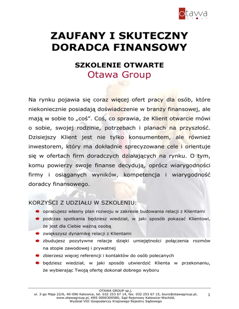 ZAUFANY I SKUTECZNY DORADCA FINANSOWY SZKOLENIE OTWARTE Otawa Group Na rynku pojawia się coraz więcej ofert pracy dla osób, które niekoniecznie posiadają doświadczenie w branŜy finansowej, ale mają w sobie to „coś”. Coś, co sprawia, Ŝe Klient otwarcie mówi o sobie, swojej rodzinie, potrzebach i planach na przyszłość. Dzisiejszy Klient jest nie tylko konsumentem, ale równieŜ inwestorem, który ma dokładnie sprecyzowane cele i orientuje się w ofertach firm doradczych działających na rynku. O tym, komu powierzy swoje finanse decydują, oprócz wiarygodności firmy i osiąganych wyników, kompetencja i wiarygodność doradcy finansowego. KORZYŚCI Z UDZIAŁU W SZKOLENIU: opracujesz własny plan rozwoju w zakresie budowania relacji z Klientami podczas spotkania będziesz wiedział, w jaki sposób pokazać Klientowi, Ŝe jest dla Ciebie waŜną osobą zwiększysz dynamikę relacji z Klientami zbudujesz pozytywne relacje dzięki umiejętności połączenia rozmów na stopie zawodowej i prywatnej zbierzesz więcej referencji i kontaktów do osób polecanych będziesz wiedział, w jaki sposób utwierdzić Klienta w przekonaniu, Ŝe wybierając Twoją ofertę dokonał dobrego wyboru OTAWA GROUP sp.j. ul. 3-go Maja 22/6, 40-096 Katowice, tel. 032 253 67 14, fax. 032 253 67 15, [email protected], www.otawagroup.pl, KRS 0000300580, Sąd Rejonowy Katowice-Wschód, Wydział VIII Gospodarczy Krajowego Rejestru Sądowego 1 PROGRAM SZKOLENIA • Budowanie relacji z Klientem − Jakie są moje silne i słabe strony w budowaniu i podtrzymywaniu relacji z Klientami − W jaki sposób angaŜuję się w budowanie relacji - najczęściej poruszane tematy, o co nigdy nie pytam, o czym chciałbym rozmawiać z doradcą, gdybym był Klientem − Plusy i minusy bycia zaangaŜowanym w budowanie relacji z Klientem − • Osobisty plan rozwoju - moje zasoby, obszary do rozwoju Zdobywanie zaufania − Po co zdobywać zaufanie Klienta − Co zrobić, Ŝeby Klient nam zaufał: − o wartość dodana – czym wyróŜniam się spośród innych doradców o okazywanie Klientowi własnej motywacji do zawarcia transakcji o rola kompetencji doradcy o okazywanie szacunku Cykl zaufania: wspólne zainteresowania, wzajemne zrozumienie, wspólne oczekiwania, przewidywalność, zdobyte zaufanie • • • Zwiększanie dynamiki relacji z Klientem − jakich argumentów uŜyć, aby spotkać się z Klientem − pomysły na kontakt telefoniczny − narzędzia budowania lojalności Klienta Sposoby na rozmowę z Klientem − nawiązywanie kontaktu – powitanie, przedstawienie się − tematy, na które warto rozmawiać − umiejętność prowadzenia empatycznej rozmowy − czego nie robić w relacji z Klientem − „magiczne” słowa − 10 zasad rozmowy z Klientem − elementy etykiety biznesu Budowanie zaangaŜowania i odkrywanie potrzeb Klienta − sondowanie wiodących motywacji Klienta − typy pytań – w jaki sposób pytać o sprawy finansowe i prywatne − techniki podtrzymywania i rozszerzania wypowiedzi Klienta. OTAWA GROUP sp.j. ul. 3-go Maja 22/6, 40-096 Katowice, tel. 032 253 67 14, fax. 032 253 67 15, [email protected], www.otawagroup.pl, KRS 0000300580, Sąd Rejonowy Katowice-Wschód, Wydział VIII Gospodarczy Krajowego Rejestru Sądowego 2 METODY SZKOLENIOWE: Zajęcia warsztatowe - case study, burza mózgów, ćwiczenia zespołowe, ćwiczenia indywidualne, trening umiejętności praktycznych z wykorzystaniem kamery video, miniwykład z prezentacją. TRENER - MARCIN TOTUSZYŃSKI Mgr Wydziału Zarządzania Akademii Ekonomicznej w Katowicach i absolwent "Szkoły trenerów" Metrum. Przez szereg lat z powodzeniem pracował jako menadŜer, zarówno w Polsce jak i w USA. Otworzył i z sukcesem prowadził szkołę językową w Katowicach, która działa po dziś dzień. Jako szef działu eksportu kierował polityką zakupową i sprzedaŜową firmy na terenie kilkunastu krajów Europy. Jako trener umiejętności psychospołecznych prowadzi szkolenia z zakresu technik sprzedaŜy i negocjacji, standardów profesjonalnej obsługi klienta, komunikacji i asertywności w biznesie, zarządzania zespołem oraz prezentacji. Jest autorem wielu programów szkoleniowych i ćwiczeń, których celem jest zmniejszenie rozdźwięku między ksiąŜkową teorią, a codzienną, biznesową praktyką. W prowadzonych warsztatach największy nacisk kładzie na zaangaŜowanie uczestników w prowadzone zajęcia. Zadowolenie uczestników ze szkolenia oraz poczucie wyniesienia cennych informacji i doświadczeń to dla niego kluczowe wartości. MIEJSCE SZKOLENIA: TERMIN: KATOWICE 24-25 września CZAS TRWANIA: MAKSYMALNA WIELKOŚĆ GRUPY: 9:00 – 17:00 10 osób CENA: 1400 zł Cena obejmuje: - materiały szkoleniowe - DYPLOM ukończenia szkolenia - przerwy kawowe i lunch w restauracji Więcej informacji na temat szkolenia udzieli Państwu BoŜena Bukal • tel. (032) 253 67 14 • e-mail: [email protected] OTAWA GROUP sp.j. ul. 3-go Maja 22/6, 40-096 Katowice, tel. 032 253 67 14, fax. 032 253 67 15, [email protected], www.otawagroup.pl, KRS 0000300580, Sąd Rejonowy Katowice-Wschód, Wydział VIII Gospodarczy Krajowego Rejestru Sądowego 3