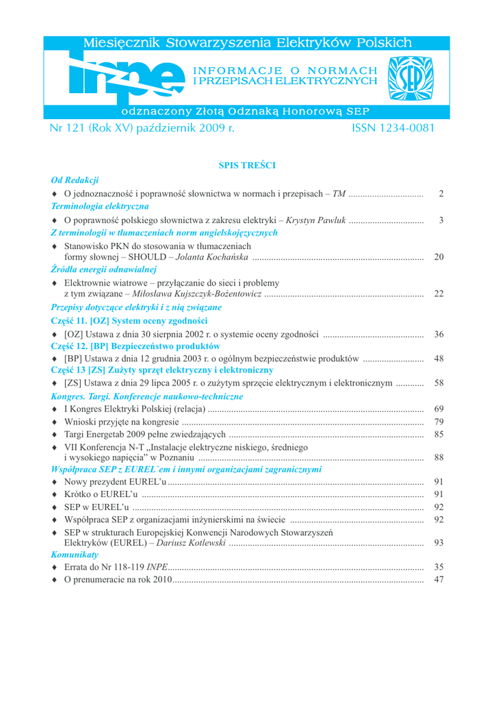 MIESIĘCZNIK STOWARZYSZENIA POLSKICH Miesięcznik Stowarzyszenia ELEKTRYKÓW Elektryków Polskich INFORMACJE O NORMACH I PRZEPISACH ELEKTRYCZNYCH odznaczony Złotą Odznaką Odznaką Honorową SEP SEP odznaczony Złotą Honorową Nr 121 (Rok XV) październik 2009 r. ISSN 1234-0081 SPIS TREŚCI Od Redakcji ¨ O jednoznaczność i poprawność słownictwa w normach i przepisach – TM ................................ Terminologia elektryczna ¨ O poprawność polskiego słownictwa z zakresu elektryki – Krystyn Pawluk ................................ Z terminologii w tłumaczeniach norm angielskojęzycznych ¨ Stanowisko PKN do stosowania w tłumaczeniach formy słownej – SHOULD – Jolanta Kochańska ......................................................................... Źródła energii odnawialnej ¨ Elektrownie wiatrowe – przyłączanie do sieci i problemy z tym związane – Miłosława Kujszczyk-Bożentowicz .................................................................... Przepisy dotyczące elektryki i z nią związane Część 11. [OZ] System oceny zgodności ¨ [OZ] Ustawa z dnia 30 sierpnia 2002 r. o systemie oceny zgodności ........................................... Część 12. [BP] Bezpieczeństwo produktów ¨ [BP] Ustawa z dnia 12 grudnia 2003 r. o ogólnym bezpieczeństwie produktów .......................... Część 13 [ZS] Zużyty sprzęt elektryczny i elektroniczny ¨ [ZS] Ustawa z dnia 29 lipca 2005 r. o zużytym sprzęcie elektrycznym i elektronicznym ............ Kongres. Targi. Konferencje naukowo-techniczne ¨ I Kongres Elektryki Polskiej (relacja) ............................................................................................ ¨ Wnioski przyjęte na kongresie ....................................................................................................... ¨ Targi Energetab 2009 pełne zwiedzających ................................................................................... ¨ VII Konferencja N-T „Instalacje elektryczne niskiego, średniego i wysokiego napięcia” w Poznaniu ................................................................................................ Współpraca SEP z EUREL`em i innymi organizacjami zagranicznymi ¨ Nowy prezydent EUREL’u ............................................................................................................. ¨ Krótko o EUREL’u ........................................................................................................................ ¨ SEP w EUREL’u ............................................................................................................................ ¨ Współpraca SEP z organizacjami inżynierskimi na świecie ......................................................... ¨ SEP w strukturach Europejskiej Konwencji Narodowych Stowarzyszeń Elektryków (EUREL) – Dariusz Kotlewski ................................................................................... Komunikaty ¨ Errata do Nr 118-119 INPE............................................................................................................. ¨ O prenumeracie na rok 2010........................................................................................................... 2 3 20 22 36 48 58 69 79 85 88 91 91 92 92 93 35 47
