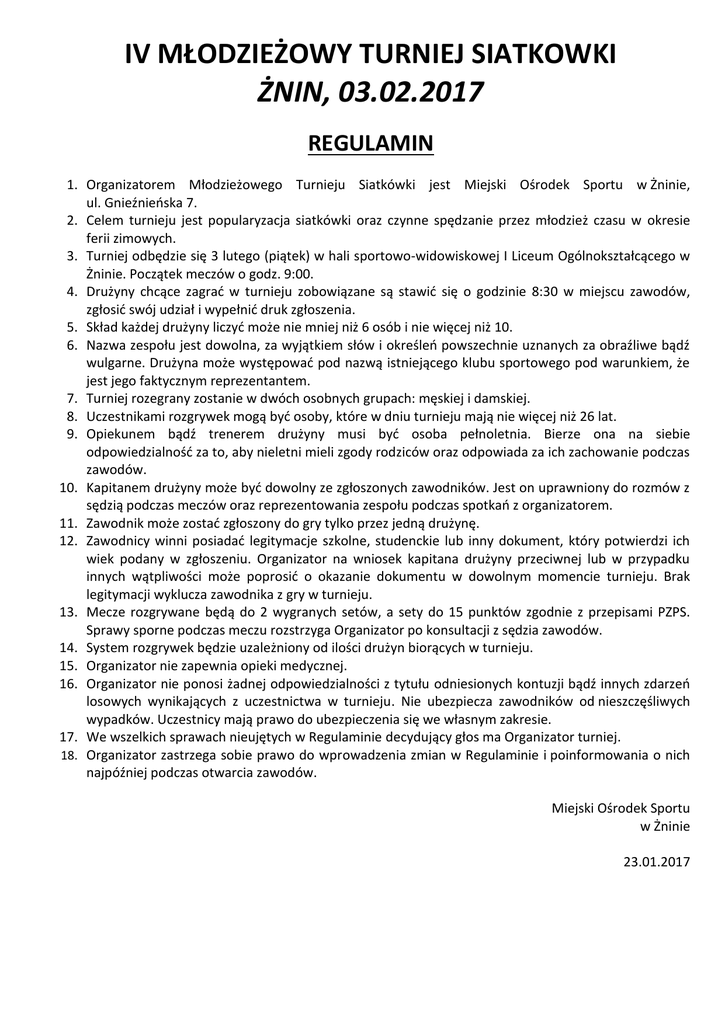IV MŁODZIEŻOWY TURNIEJ SIATKOWKI ŻNIN, 03.02.2017 REGULAMIN 1. Organizatorem Młodzieżowego Turnieju Siatkówki jest Miejski Ośrodek Sportu w Żninie, ul. Gnieźnieńska 7. 2. Celem turnieju jest popularyzacja siatkówki oraz czynne spędzanie przez młodzież czasu w okresie ferii zimowych. 3. Turniej odbędzie się 3 lutego (piątek) w hali sportowo-widowiskowej I Liceum Ogólnokształcącego w Żninie. Początek meczów o godz. 9:00. 4. Drużyny chcące zagrać w turnieju zobowiązane są stawić się o godzinie 8:30 w miejscu zawodów, zgłosić swój udział i wypełnić druk zgłoszenia. 5. Skład każdej drużyny liczyć może nie mniej niż 6 osób i nie więcej niż 10. 6. Nazwa zespołu jest dowolna, za wyjątkiem słów i określeń powszechnie uznanych za obraźliwe bądź wulgarne. Drużyna może występować pod nazwą istniejącego klubu sportowego pod warunkiem, że jest jego faktycznym reprezentantem. 7. Turniej rozegrany zostanie w dwóch osobnych grupach: męskiej i damskiej. 8. Uczestnikami rozgrywek mogą być osoby, które w dniu turnieju mają nie więcej niż 26 lat. 9. Opiekunem bądź trenerem drużyny musi być osoba pełnoletnia. Bierze ona na siebie odpowiedzialność za to, aby nieletni mieli zgody rodziców oraz odpowiada za ich zachowanie podczas zawodów. 10. Kapitanem drużyny może być dowolny ze zgłoszonych zawodników. Jest on uprawniony do rozmów z sędzią podczas meczów oraz reprezentowania zespołu podczas spotkań z organizatorem. 11. Zawodnik może zostać zgłoszony do gry tylko przez jedną drużynę. 12. Zawodnicy winni posiadać legitymacje szkolne, studenckie lub inny dokument, który potwierdzi ich wiek podany w zgłoszeniu. Organizator na wniosek kapitana drużyny przeciwnej lub w przypadku innych wątpliwości może poprosić o okazanie dokumentu w dowolnym momencie turnieju. Brak legitymacji wyklucza zawodnika z gry w turnieju. 13. Mecze rozgrywane będą do 2 wygranych setów, a sety do 15 punktów zgodnie z przepisami PZPS. Sprawy sporne podczas meczu rozstrzyga Organizator po konsultacji z sędzia zawodów. 14. System rozgrywek będzie uzależniony od ilości drużyn biorących w turnieju. 15. Organizator nie zapewnia opieki medycznej. 16. Organizator nie ponosi żadnej odpowiedzialności z tytułu odniesionych kontuzji bądź innych zdarzeń losowych wynikających z uczestnictwa w turnieju. Nie ubezpiecza zawodników od nieszczęśliwych wypadków. Uczestnicy mają prawo do ubezpieczenia się we własnym zakresie. 17. We wszelkich sprawach nieujętych w Regulaminie decydujący głos ma Organizator turniej. 18. Organizator zastrzega sobie prawo do wprowadzenia zmian w Regulaminie i poinformowania o nich najpóźniej podczas otwarcia zawodów. Miejski Ośrodek Sportu w Żninie 23.01.2017