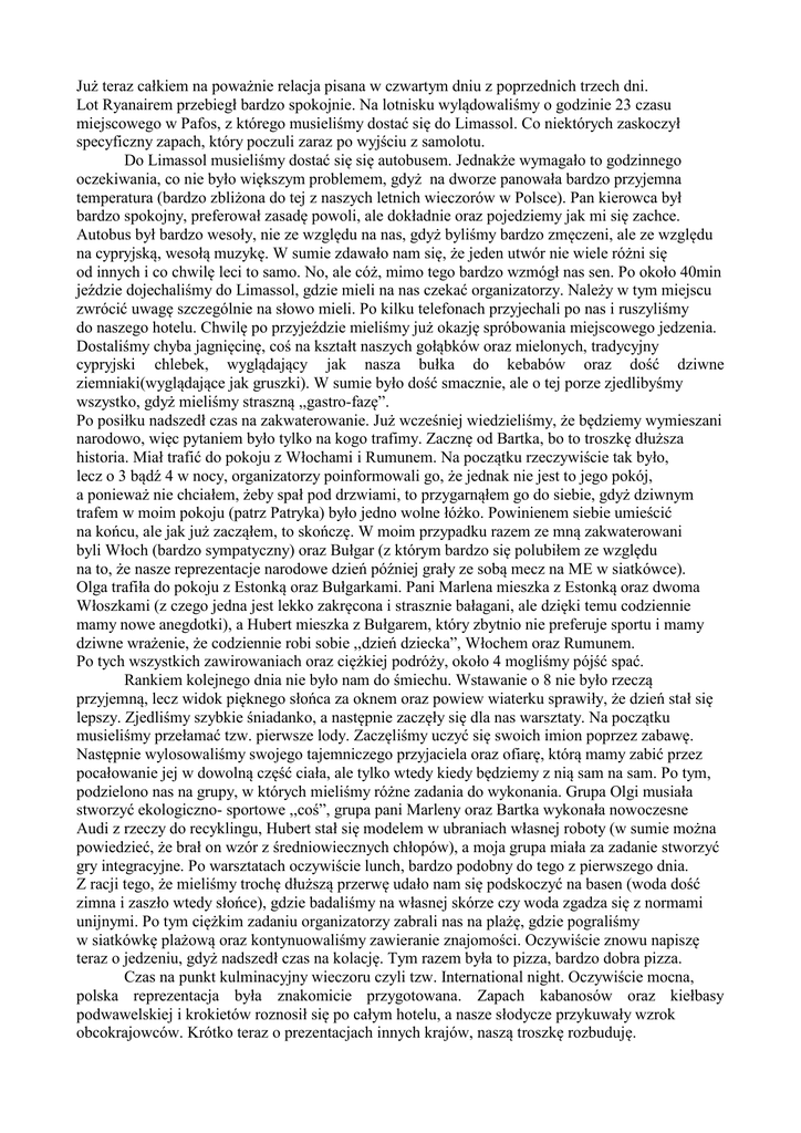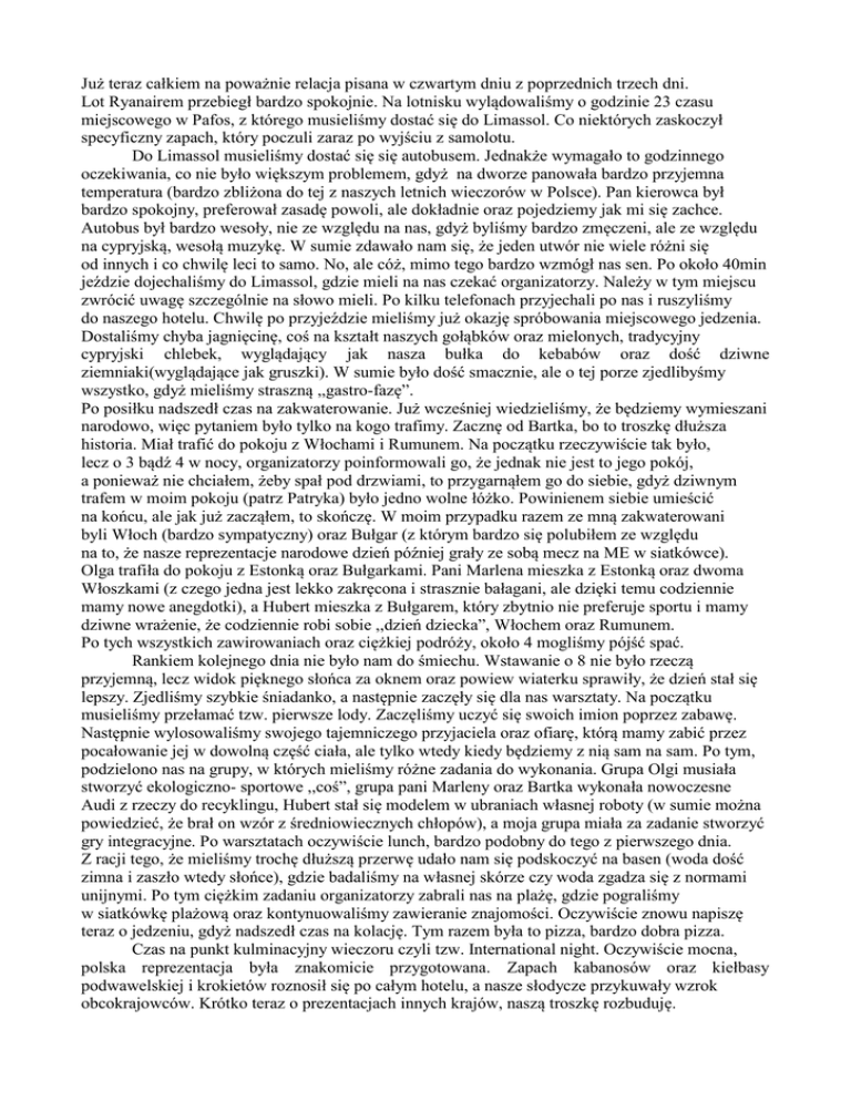 Już teraz całkiem na poważnie relacja pisana w czwartym dniu z poprzednich trzech dni. Lot Ryanairem przebiegł bardzo spokojnie. Na lotnisku wylądowaliśmy o godzinie 23 czasu miejscowego w Pafos, z którego musieliśmy dostać się do Limassol. Co niektórych zaskoczył specyficzny zapach, który poczuli zaraz po wyjściu z samolotu. Do Limassol musieliśmy dostać się się autobusem. Jednakże wymagało to godzinnego oczekiwania, co nie było większym problemem, gdyż na dworze panowała bardzo przyjemna temperatura (bardzo zbliżona do tej z naszych letnich wieczorów w Polsce). Pan kierowca był bardzo spokojny, preferował zasadę powoli, ale dokładnie oraz pojedziemy jak mi się zachce. Autobus był bardzo wesoły, nie ze względu na nas, gdyż byliśmy bardzo zmęczeni, ale ze względu na cypryjską, wesołą muzykę. W sumie zdawało nam się, że jeden utwór nie wiele różni się od innych i co chwilę leci to samo. No, ale cóż, mimo tego bardzo wzmógł nas sen. Po około 40min jeździe dojechaliśmy do Limassol, gdzie mieli na nas czekać organizatorzy. Należy w tym miejscu zwrócić uwagę szczególnie na słowo mieli. Po kilku telefonach przyjechali po nas i ruszyliśmy do naszego hotelu. Chwilę po przyjeździe mieliśmy już okazję spróbowania miejscowego jedzenia. Dostaliśmy chyba jagnięcinę, coś na kształt naszych gołąbków oraz mielonych, tradycyjny cypryjski chlebek, wyglądający jak nasza bułka do kebabów oraz dość dziwne ziemniaki(wyglądające jak gruszki). W sumie było dość smacznie, ale o tej porze zjedlibyśmy wszystko, gdyż mieliśmy straszną ,,gastro-fazę”. Po posiłku nadszedł czas na zakwaterowanie. Już wcześniej wiedzieliśmy, że będziemy wymieszani narodowo, więc pytaniem było tylko na kogo trafimy. Zacznę od Bartka, bo to troszkę dłuższa historia. Miał trafić do pokoju z Włochami i Rumunem. Na początku rzeczywiście tak było, lecz o 3 bądź 4 w nocy, organizatorzy poinformowali go, że jednak nie jest to jego pokój, a ponieważ nie chciałem, żeby spał pod drzwiami, to przygarnąłem go do siebie, gdyż dziwnym trafem w moim pokoju (patrz Patryka) było jedno wolne łóżko. Powinienem siebie umieścić na końcu, ale jak już zacząłem, to skończę. W moim przypadku razem ze mną zakwaterowani byli Włoch (bardzo sympatyczny) oraz Bułgar (z którym bardzo się polubiłem ze względu na to, że nasze reprezentacje narodowe dzień później grały ze sobą mecz na ME w siatkówce). Olga trafiła do pokoju z Estonką oraz Bułgarkami. Pani Marlena mieszka z Estonką oraz dwoma Włoszkami (z czego jedna jest lekko zakręcona i strasznie bałagani, ale dzięki temu codziennie mamy nowe anegdotki), a Hubert mieszka z Bułgarem, który zbytnio nie preferuje sportu i mamy dziwne wrażenie, że codziennie robi sobie ,,dzień dziecka”, Włochem oraz Rumunem. Po tych wszystkich zawirowaniach oraz ciężkiej podróży, około 4 mogliśmy pójść spać. Rankiem kolejnego dnia nie było nam do śmiechu. Wstawanie o 8 nie było rzeczą przyjemną, lecz widok pięknego słońca za oknem oraz powiew wiaterku sprawiły, że dzień stał się lepszy. Zjedliśmy szybkie śniadanko, a następnie zaczęły się dla nas warsztaty. Na początku musieliśmy przełamać tzw. pierwsze lody. Zaczęliśmy uczyć się swoich imion poprzez zabawę. Następnie wylosowaliśmy swojego tajemniczego przyjaciela oraz ofiarę, którą mamy zabić przez pocałowanie jej w dowolną część ciała, ale tylko wtedy kiedy będziemy z nią sam na sam. Po tym, podzielono nas na grupy, w których mieliśmy różne zadania do wykonania. Grupa Olgi musiała stworzyć ekologiczno- sportowe ,,coś”, grupa pani Marleny oraz Bartka wykonała nowoczesne Audi z rzeczy do recyklingu, Hubert stał się modelem w ubraniach własnej roboty (w sumie można powiedzieć, że brał on wzór z średniowiecznych chłopów), a moja grupa miała za zadanie stworzyć gry integracyjne. Po warsztatach oczywiście lunch, bardzo podobny do tego z pierwszego dnia. Z racji tego, że mieliśmy trochę dłuższą przerwę udało nam się podskoczyć na basen (woda dość zimna i zaszło wtedy słońce), gdzie badaliśmy na własnej skórze czy woda zgadza się z normami unijnymi. Po tym ciężkim zadaniu organizatorzy zabrali nas na plażę, gdzie pograliśmy w siatkówkę plażową oraz kontynuowaliśmy zawieranie znajomości. Oczywiście znowu napiszę teraz o jedzeniu, gdyż nadszedł czas na kolację. Tym razem była to pizza, bardzo dobra pizza. Czas na punkt kulminacyjny wieczoru czyli tzw. International night. Oczywiście mocna, polska reprezentacja była znakomicie przygotowana. Zapach kabanosów oraz kiełbasy podwawelskiej i krokietów roznosił się po całym hotelu, a nasze słodycze przykuwały wzrok obcokrajowców. Krótko teraz o prezentacjach innych krajów, naszą troszkę rozbuduję. Poznaliśmy bułgarskie sery oraz wędliny, Włosi pokazali doskonale znane nam miejsca oraz sławnych rodaków a ich jedzenie: sery, ciastka itp. były znakomite, dowiedzieliśmy się, że w prawie całej Estonii jest darmowe Wi-Fi, Rumuni nauczyli nas swoich tańców, a na tradycje Cypryjskie musimy poczekać do dzisiejszego wieczoru. Co do naszej prezentacji, to wystąpiliśmy w szkolnych koszulkach. Przedstawiliśmy wcześniej wspomniane jedzenie; ptasie mleczko zachwyciło naszych przyjaciół, a krokiety zrobiły na nich niezłe wrażenie. W pozostałej części nie chcieliśmy zanudzać ich liczbami i faktami o Polsce, więc stwierdziliśmy, że wypromujemy szkołę. Nasz LipDub oraz Harlem Shake zachwyciły innych. Padły słowa, z których byliśmy naprawdę dumni. Obcokrajowcy stwierdzili, że chcieliby chodzić do tak świetnej szkoły jak nasza. Po prezentacjach nadszedł czas na dalsze integrowanie się. Cały czas podczas rozmów szlifujemy nasz angielski i stwierdzamy jasno, że bez problemów potrafimy zrozumieć oraz dogadać się z każdym, kto uczest